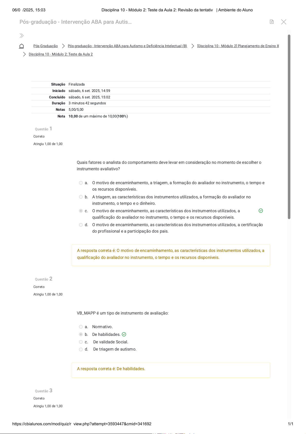 Pós-Graduação Pós-graduação - Intervenção ABA para Autismo e Deficiência Intelectual (B) [Disciplina 10 - Módulo 2] Planejamento de Ensino II Disciplina 10 - Módulo 2: Teste da Aula 2 Questão 1 Correto Atingiu 1,00 de 1,00 Questão 2 Correto Atingiu 1,00 de 1,00 Questão 3 Correto Atingiu 1,00 de 1,00 Quais fatores o analista do comportamento deve levar em consideração no momento de escolher o instrumento avaliativo? a. O motivo de encaminhamento, a triagem, a formação do avaliador no instrumento, o tempo e os recursos disponíveis. b. A triagem, as características dos instrumentos utilizados, a formação do avaliador no instrumento, o tempo e o dinheiro. c. O motivo de encaminhamento, as características dos instrumentos utilizados, a qualificação do avaliador no instrumento, o tempo e os recursos disponíveis. d. O motivo de encaminhamento, as características dos instrumentos utilizados, a certificação do profissional e a participação dos pais. A resposta correta é: O motivo de encaminhamento, as características dos instrumentos utilizados, a qualificação do avaliador no instrumento, o tempo e os recursos disponíveis. VB_MAPP é um tipo de instrumento de avaliação: a. Normativo. b. De habilidades. c. De validade Social. d. De triagem de autismo. A resposta correta é: De habilidades. Situação Finalizada Iniciado sábado, 6 set. 2025, 14:59 Concluído sábado, 6 set. 2025, 15:02 Duração 3 minutos 42 segundos Notas 5,00/5,00 Nota 10,00 de um máximo de 10,00(100%) Pós-graduação - Intervenção ABA para Autis… 06/09/2025, 15:03 Disciplina 10 - Módulo 2: Teste da Aula 2: Revisão da tentativa | Ambiente do Aluno https://cbialunos.com/mod/quiz/review.php?attempt=3593447&cmid=341692 1/1 https://cbialunos.com/course/index.php?categoryid=7 https://cbialunos.com/course/view.php?id=488 https://cbialunos.com/course/section.php?id=15263 https://cbialunos.com/mod/quiz/view.php?id=341692 https://cbialunos.com/my/courses.php https://cbialunos.com/course/view.php?id=488 https://cbialunos.com/course/view.php?id=488&mb2sct=37