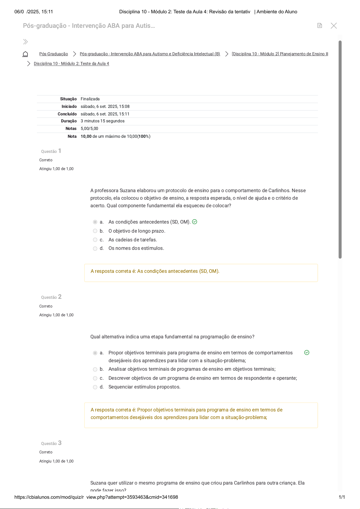 Pós-Graduação Pós-graduação - Intervenção ABA para Autismo e Deficiência Intelectual (B) [Disciplina 10 - Módulo 2] Planejamento de Ensino II Disciplina 10 - Módulo 2: Teste da Aula 4 Questão 1 Correto Atingiu 1,00 de 1,00 Questão 2 Correto Atingiu 1,00 de 1,00 Questão 3 Correto Atingiu 1,00 de 1,00 A professora Suzana elaborou um protocolo de ensino para o comportamento de Carlinhos. Nesse protocolo, ela colocou o objetivo de ensino, a resposta esperada, o nível de ajuda e o critério de acerto. Qual componente fundamental ela esqueceu de colocar? a. As condições antecedentes (SD, OM). b. O objetivo de longo prazo. c. As cadeias de tarefas. d. Os nomes dos estímulos. A resposta correta é: As condições antecedentes (SD, OM). Qual alternativa indica uma etapa fundamental na programação de ensino? a. Propor objetivos terminais para programa de ensino em termos de comportamentos desejáveis dos aprendizes para lidar com a situação-problema; b. Analisar objetivos terminais de programas de ensino em objetivos terminais; c. Descrever objetivos de um programa de ensino em termos de respondente e operante; d. Sequenciar estímulos propostos. A resposta correta é: Propor objetivos terminais para programa de ensino em termos de comportamentos desejáveis dos aprendizes para lidar com a situação-problema; Suzana quer utilizar o mesmo programa de ensino que criou para Carlinhos para outra criança. Ela pode fazer isso? Situação Finalizada Iniciado sábado, 6 set. 2025, 15:08 Concluído sábado, 6 set. 2025, 15:11 Duração 3 minutos 15 segundos Notas 5,00/5,00 Nota 10,00 de um máximo de 10,00(100%) Pós-graduação - Intervenção ABA para Autis… 06/09/2025, 15:11 Disciplina 10 - Módulo 2: Teste da Aula 4: Revisão da tentativa | Ambiente do Aluno https://cbialunos.com/mod/quiz/review.php?attempt=3593463&cmid=341698 1/1 https://cbialunos.com/course/index.php?categoryid=7 https://cbialunos.com/course/view.php?id=488 https://cbialunos.com/course/section.php?id=15263 https://cbialunos.com/mod/quiz/view.php?id=341698 https://cbialunos.com/my/courses.php https://cbialunos.com/course/view.php?id=488 https://cbialunos.com/course/view.php?id=488&mb2sct=37
