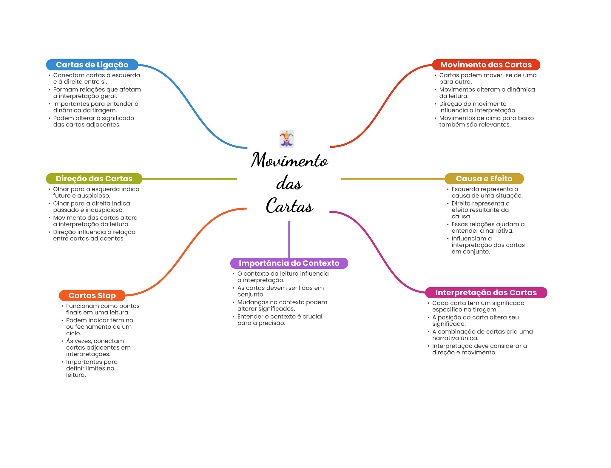 Cartas de Ligação Movimento das Cartas Conectam cartas à esquerda Cartas podem mover-se de uma e à direita entre si. para outra. Formam relações que afetam Movimentos alteram a dinâmica a interpretação geral. da leitura. Importantes para entender a Direção do movimento dinâmica da tiragem. influencia a interpretação. Podem alterar significado Movimentos de cima para baixo das cartas adjacentes. também são relevantes. Movimento Direção das Cartas das Causa e Efeito Olhar para a esquerda indica Esquerda representa a futuro e auspicioso. causa de uma situação. Olhar para a direita indica Cartas Direita representa O passado e inauspicioso. efeito resultante da Movimento das cartas altera causa. a interpretação da leitura. Essas relações ajudam a Direção influencia a relação entender a narrativa. entre cartas adjacentes. Influenciam a interpretação das cartas em conjunto. Importância do Contexto contexto da leitura influencia a interpretação. As cartas devem ser lidas em Cartas Stop conjunto. Interpretação das Cartas Mudanças no contexto podem Funcionam como pontos Cada carta tem um significado finais em uma leitura. alterar significados. específico na tiragem. Entender contexto é crucial Podem indicar término A posição da carta altera seu ou fechamento de um para a precisão. significado. ciclo. A combinação de cartas cria uma Às vezes, conectam narrativa única. cartas adjacentes em Interpretação deve considerar a interpretações. direção e movimento. Importantes para definir limites na leitura.