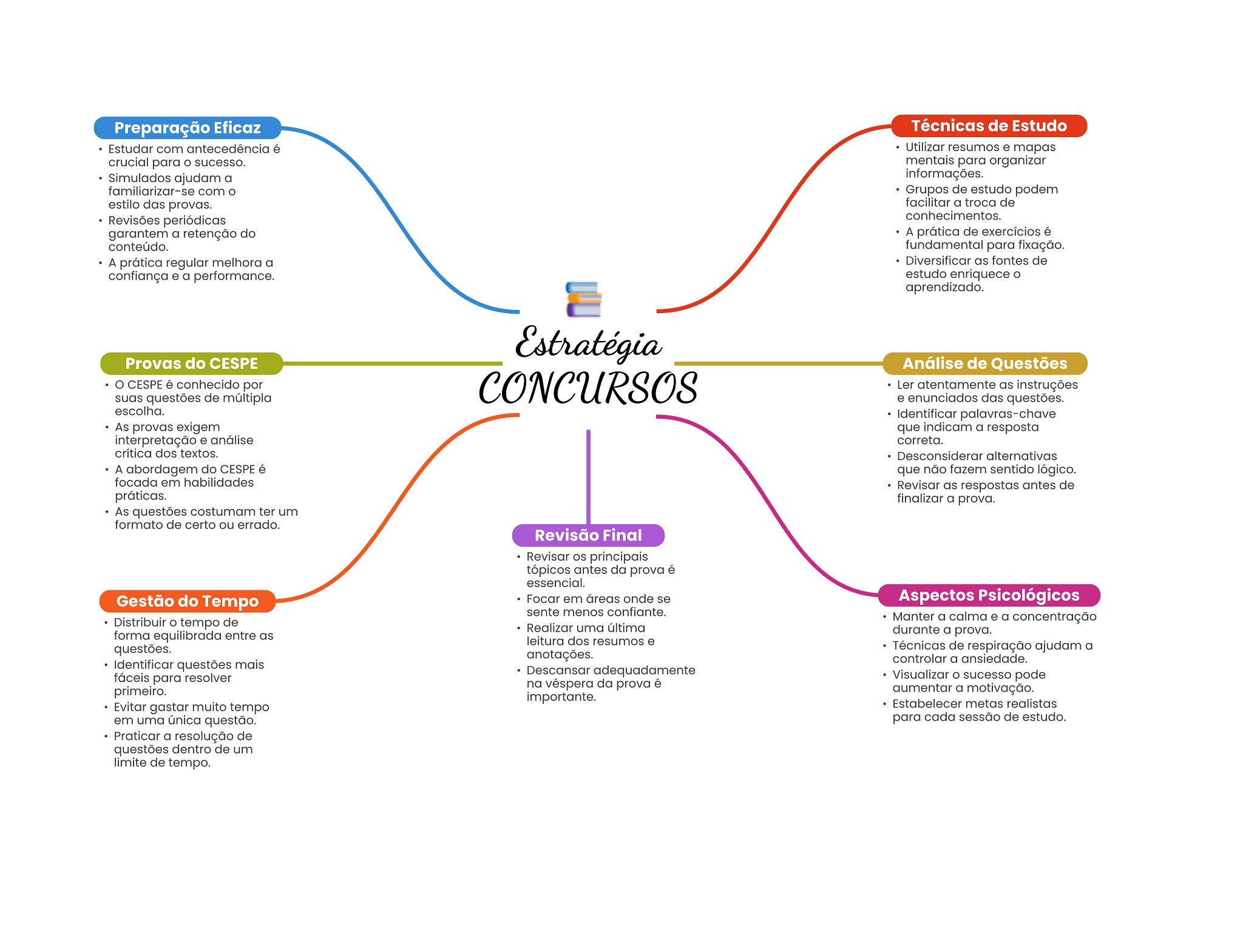 Preparação Eficaz Técnicas de Estudo Estudar com antecedência é Utilizar resumos e mapas crucial para sucesso. mentais para organizar Simulados ajudam a informações. familiarizar-se com Grupos de estudo podem estilo das provas. facilitar a troca de Revisões periódicas conhecimentos. garantem a retenção do A prática de exercícios é conteúdo. fundamental para fixação. A prática regular melhora a Diversificar as fontes de confiança e a performance. estudo enriquece aprendizado. Estratégia Provas do CESPE Análise de Questões CESPE é conhecido por CONCURSOS Ler atentamente as instruções suas questões de múltipla e enunciados das questões. escolha. Identificar palavras-chave As provas exigem que indicam a resposta interpretação e análise correta. crítica dos textos. Desconsiderar alternativas A abordagem do CESPE é que não fazem sentido lógico. focada em habilidades Revisar as respostas antes de práticas. finalizar a prova. As questões costumam ter um formato de certo ou errado. Revisão Final Revisar OS principais tópicos antes da prova é essencial. Gestão do Tempo Focar em áreas onde se Aspectos Psicológicos sente menos confiante. Distribuir tempo de Manter a calma e a concentração Realizar uma última forma equilibrada entre as durante a prova. leitura dos resumos e questões. Técnicas de respiração ajudam a anotações. controlar a ansiedade. Identificar questões mais Descansar adequadamente fáceis para resolver Visualizar O sucesso pode na véspera da prova é primeiro. aumentar a motivação. importante. Evitar gastar muito tempo Estabelecer metas realistas em uma única questão. para cada sessão de estudo. Praticar a resolução de questões dentro de um limite de tempo.