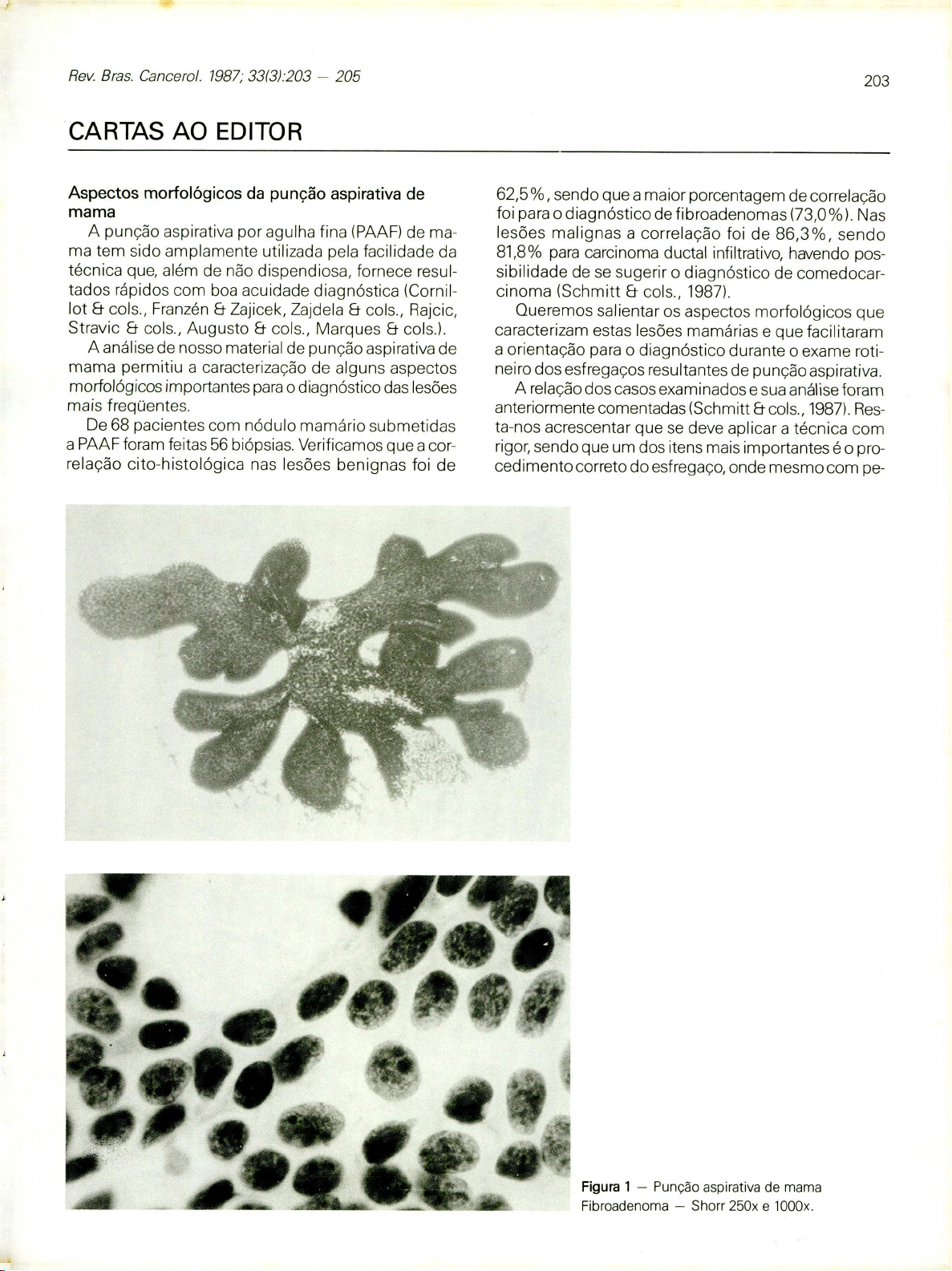 Rev. Bras. Cancerol. 1987; 33(3):203 - 205 CARTAS AO EDITOR Aspectos morfológicos da punção aspirativa de mama A punção aspirativa por agulha fina (PAAF) de ma- ma tem sido amplamente utilizada pela facilidade da técnica que, além de não dispendiosa, fornece resul- tados rápidos com boa acuidade diagnóstica (Cornil- lot 8- cols., Franzén 8- Zajicek, Zajdela & cols., Rajcic, Stravic & cols., Augusto & cols., Marques 8- cols.). A análise de nosso material de punção aspirativa de mama permitiu a caracterização de alguns aspectos morfológicos importantes para o diagnóstico das lesões mais freqüentes. De 68 pacientes com nódulo mamário submetidas a PAAF foram feitas 56 biópsias. Verificamos que a cor- relação cito-histológica nas lesões benignas foi de 203 62,5%, sendo que a maior porcentagem de correlação foi para o diagnóstico defibroadenomas (73,0%). Nas lesões malignas a correlação foi de 86,3%, sendo 81,8% para carcinoma ductal infiltrativo, havendo pos- sibilidade de se sugerir o diagnóstico de comedocar- cinoma (Schmitt 8- cols., 1987). Queremos salientar os aspectos morfológicos que caracterizam estas lesões mamárias e que facilitaram a orientação para o diagnóstico durante o exame roti- neiro dos esf regaços resultantes de punção aspirativa. A relação dos casos examinados e sua análise foram anteriormente comentadas (Schmitt & cols., 1987). Res- ta-nos acrescentar que se deve aplicar a técnica com rigor, sendo que um dos itens mais importantes é o pro- cedimento correto do esf regaço, onde mesmo com pe- w 204 Rev. Bras. Cancerol. 33(3): setembro 1987 quenas quantidades de material é perfeitamente pos- sível obter células bem preservadas e características pa- ra o diagnóstico. As principais lesões diagnosticadas pela técnica da punção aspirativa apresentavam as seguintes caracte- rísticas: Figura 1 - FlBROADENOMA: O encontro de células ductais agrupadas sob a forma de lençóis e com projeções tipo dava e células estromais são ca- racterísticas importantes no diagnóstico dos fi- broadenomas. Notam-se núcleos nus e a croma- tina é discretamente granulosa, com nucléo o pe- queno. Notam-se, ainda, células de núcleos hiper- cromáticos e alongados na periferia dos agrupa- mentos, que são as células mioepiteliais. Figura 2 - DISPLASIA: A presença de células com metaplasia apócrina, facilmente distinguíveis por seu citoplasma amplo e granular, constitui-se em elemento fundamental no diagnóstico das displa- sias. Podemos encontrar ainda células espumo- sas e restos celulares quando se puncionam cis- tos, e fibroblastos quando se puncionam áreas fi- b rosadas. Figura 3 - CARCINOMA DUCTAL: Nos carcinomas os esf regaços são hipercelulares, sendo que as cé- lulas se distribuem isoladamente ou em grupos, com anisocariose, anisocitose, núcleos de croma- tina grosseira, irregular, e nucléolos proeminentes e acidófilos. A presença de material necrótico no fundo do esf regaço reforça o diagnóstico de neo- plasia infiltrativa. Figura 4 - COM EDOCARCINOMA: Basicamente as células são semelhantes às do carcinoma ductal. Chamou-nos a atenção, neste tipo de tumor, a pre- sença de grande quantidade de material necróti- co, em grumos grosseiros e basofílicos, que se dis- punham na porção central de arranjos acinares de células ductais malignas. 13 Figura 2 - Dispiasia mamária: Células ductais, células da metaplasia apócrina, células espumosas - Shorr400x Celula da metaplasia apócrina - Shorr 1000x E2 *54v, Punção aspirativa de mama: Schmitt e cois. 205 III Figura 3 Punção aspirativa de mama.Carcinoma ) ductal - Shorr 1000x e Comentários O reconhecimento dos diferentes aspectos morfo- lógicos dos vários tipos de lesões mamárias permitirá ao citopatologista, no contexto moderno de interação e cooperação com os achados clínicos, umtiiagnósti co mais seguro com conseqüentes medidas terapêu ticas mais rápidas e eficazes. Referências Bibliográficas 1 Cornifot M, Verhaeghe M, Cappeiaere 9, Ciay A Place de la cyto ogie par ponc flor dans ie diagnostic des tumeurs do sem 12267 exames cytoiogiquesl LiMe Med 1971, 16 102731 2. Franzén S, Zapcek 3 Aspiration b opsy ir diagnosis of palpable lesion of the breast Acta Radioi 1968; 7 241 62 3 Zajdela A, Piiieron 31, Emmyer A Cytodiagnosis des tumemirs mamrna res par ponction a aiguilie Mine, lin Tentb Interriatironal Cancer Congress Houston, 1970 p. 60 4 Rajcic V - Cytoiogic studies of aspiration biopsy of the breast Critical review of 2890 corrsecutive biopsies. Minerva Ginecol. 1971, 23 417419 Figura 4 - Punção aspirativa de mama: Comedocarcinoma Shorr 1000x 5 Stavric GD, Tomicev DT, Kaftanoijev DA, Novak JJ Aspiration hiopsy uytoiogic method in diagnosis of breast lesions. A critical review of 250 cases Acta Cytoi. 1974, 17 188 190. 6 Augusto N, Urbanetz AA, O Servi, Vefludo MASL . Microbiopsia no carcinoma da mama 3 bras Gmnec 1985; 95191.421 424. 7 Marques LA, Soares FA, Silva GN, iwama de Mattos MCF, De Vita DG, Saba LMB - Cito ogia por punção aspirativa com agulha fina Estudo morfológico em pe ças cirúrgicas Acta Oncoi Bras 1986, 5 515. 8 Schmitt E, Oliveira MLCS, Alves VL, Gobetti SMP, iwama de Mattos MCF, de Luc ca LA J bras Ginec. 1987,97 (1/2). 1517. FERNANDO CARLOS LANDER SCHMITT - Médico Patologista MARIA LUIZA COTRIM SARTOR DE OLIVEIRA - Biologista VERA LUCIA ALVES Citotécnica SILVIA MARIA PEREIRA GOBETTI Citotécnica MARIA CRISTINA FUMIE IWAMA DE MATTOS - Prof. Assistente Doutor Departamento de Patologia da Faculdade de Medicina - UNESP Campos de Botucatu
