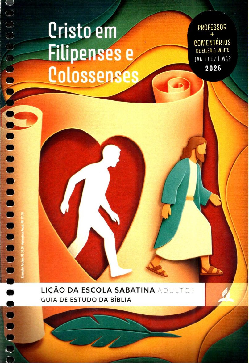 Cristo em PROFESSOR + COMENTÁRIOS Filipenses e DE ELLEN G. WHITE JAN FEV I MAR Colossenses 2026 Exemplar Avulso: R$ 33,50. Assinatura Anual: R$ 111,10 LIÇÃO DA ESCOLA SABATINA ADULTOS GUIA DE ESTUDO DA BÍBLIAQUIZ! Eu estudo minha lição Participe do Quiz da Lição da Escola Sabatina. Aponte a câmera do seu celular para QR Code. ANO BÍBLICO DEZEMBRO 15 Gênesis 47 7 Levítico 17-19 2 Deuteronômio 18-20 16 48-50 8 Levítico 20-22 3 Deuteronômio 21-23 27 Apocalipse 15-17 17 9 Levítico 23-25 4 Deuteronômio 24,25 28 Apocalipse 18, 19 18 Gênesis Êxodo 9-11 37, 30, 5-8 32, 28, 14, 1-4 16, 12, 46, Êxodo 10 Levítico 26, 27 5 Deuteronômio 26-28 29 Apocalipse 20-22 19 Êxodo 11 Números 1-3 6 Deuteronômio 29-31 30 Repassar 0 Novo 20 Êxodo 13 12 Números 4-6 7 Deuteronômio 32-34 Testamento 21 Êxodo 15 13 Números 7,8 8 Josué 1-4 31 Vista geral de toda 22 Êxodo 17 14 Números 9-11 9 Josué 5-8 a Bíblia 23 18-20 15 Números 12-14 10 Josué 9-13 24 21-23 16 Números 15, 16 11 Josué 14-17 JANEIRO 25 24-27 17 Números 17-19 12 Josué 18-21 MKT CPB Adobe Stock 26 29 18 Números 20, 21 13 Josué 22-24 Gênesis 1-3 27 31 19 Números 22-24 14 Juízes 1-3 2 Gênesis 4-7 28 33 20 Números 25-27 15 Juízes 4,5 3 Gênesis 8-11 29 34-36 21 Números 28-30 16 Juízes 6-8 4 Gênesis 12-15 30 38 22 Números 31, 32 17 Juízes 9, 10 5 Gênesis 16-19 31 39, 40 23 Números 33, 34 18 Juízes 11, 12 6 Gênesis 20-22 24 Números 35, 36 19 Juízes 13-16 7 Gênesis 23-25 8 Gênesis 26, 27 FEVEREIRO 25 Deuteronômio 1-3 20 Juízes 17-19 26 Deuteronômio 4-7 21 Juízes 20, 21 9 Gênesis 28-30 Levítico 1-4 27 Deuteronômio 8-10 22 Rute 10 Gênesis 31-33 2 Levítico 5-7 28 Deuteronômio 11-13 23 1 Samuel 1-3 11 Gênesis 34-36 3 Levítico 8-10 24 1 Samuel 4-6 12 Gênesis 37-39 4 Levítico 11, 12 13 Gênesis 40-42 5 Levítico 13, 14 MARÇO 25 1 Samuel 7-10 26 1 Samuel 11-13 14 Gênesis 43-45 6 Levítico 15, 16 Deuteronômio 14-17 27 1 Samuel 14-16 MEU COMPROMISSO PELA GRAÇA DE DEUS: Estudarei minha Lição da Escola Sabatina todos os dias. Participarei ativamente da minha Unidade de Ação e do Pequeno Grupo. Compartilharei estudos bíblicos. ASSINATURACristo em Filipenses PROFESSOR JAN FEV MAR e Colossenses 2026 LIÇÃO DA ESCOLA SABATINA ADULTOS PUBLICAÇÃO TRIMESTRAL 523 ISSN 1414-364X A Lição da Escola Sabatina dos Adultos é ÍNDICE preparada pelo Departamento da Escola Sabatina 1. Perseguidos, mas não abandonados 8 e Ministério Pessoal da Associação Geral dos Adventistas do Sétimo Dia. 2. Razões para ação de graças e oração 19 3. Vida e morte 30 20% das ofertas de cada sábado são dedicados aos projetos missionários ao redor 4. Unidade por meio da humildade 41 do mundo, incluindo os projetos especiais da 5. Brilhando como estrelas na noite 52 Escola Sabatina. 6. Confiança somente em Cristo 63 A Casa Publicadora Brasileira é a editora 7. Cidadania celestial 74 oficialmente autorizada a traduzir, publicar e distribuir, com exclusividade, em língua 8. A supremacia de Cristo 85 portuguesa, a Lição da Escola Sabatina, para todas 9. Reconciliação e esperança 96 as faixas etárias, sendo proibida a sua edição, alteração, modificação, adaptação, tradução, 10. Completos em Cristo 107 reprodução ou publicação, de forma total ou 11. Viver com Cristo 118 parcial, por qualquer pessoa ou entidade, sem a 12. Convivendo com os outros 129 prévia e expressa autorização por escrito de seus legítimos proprietários e titulares. 13. Permanecendo na vontade de Deus 140 LIÇÃO DA ESCOLA SABATINA E-mail: sac@cpb.com.br Copyright © da edição internacional: AUTOR: Moskala Visite nosso site para obter comentário adicional General Conference of Seventh-day AUTOR DO AUXILIAR DO PROFESSOR: Adenilton Tavares sobre esta lição: www.cpb.com.br Adventists, Silver Spring, EUA. de Aguiar, professor de teologia do UNASP-EC E-mail: andre.oliveira@cpb.com.br Direitos internacionais reservados. TRADUTORES: Matheus Cardoso e Camilla Seixas Twitter: @LEScpb EDITORES: André Oliveira Santos, Fernando Dias de Direitos de tradução e publicação Souza e Lucas Diemer de Lemos Exemplar Avulso: $ 18,50 em língua portuguesa reservados à REVISORAS: Rosemara Santos, Esther Fernandes e Assinatura Anual: Adriana Teixeira 5492 50463 16PX23 100158 CASA PUBLICADORA BRASILEIRA EDITOR DE ARTE: Thiago Lobo Exemplar Avulso Espiral: Rodovia SP km 106 PROJETO GRÁFICO E CAPA: Eduardo Olszewski Assinatura Anual Espiral: R$ 76,40 Caixa Postal SP 12325/51422 PROGRAMAÇÃO VISUAL: Fábio Fernandes Lição Coment. EGW Avulso: Telefone: (15) 3205-8800 ILUSTRAÇÃO DE CAPA: Thiago Lobo Lição Coment. EGW - Ass. Anual: R$ Site: cpb.com.br ILUSTRAÇÕES INTERNAS: Jairo Ostemberg 13689/51421 PRESIDENTE: Uilson Garcia Serviço de Atendimento ao Cliente: A Lição da Escola Sabatina DIRETOR FINANCEIRO: Diego Lottermann Segunda a quinta, das 8h às 20h constitui marca registrada GERENTE EDITORIAL: Wellington Barbosa Sexta, das 8h às 15h45 perante Instituto Nacional GERENTE DE PRODUÇÃO: Reisner Martins Domingo, das 8h30 às 14h da Propriedade Industrial. GERENTE COMERCIAL: Filipe Corrêa de Lima Telefone: (15) 3205-8888 WhatsApp: (15) 98100-5073 Ligação gratuita: 0800 9790606 Todos os direitos reservados. Proibida a reprodução total ou parcial, por quaisquer meios, sejam impressos, eletrônicos, fotográficos ou sonoros, entre outros, sem prévia autorização por escrito da editora. ASSOCIAÇÃO BRASILEIRA DIREITOS REPROGRÁFICOS Esta lição pertence a: Igreja: Fone:comece devocional 20 com Deus HOJE. sua jornada 26 DEVOCIONAIS alegria ELLEN WHITE SUAS ASAS PROTAGO NISTAS RECOMECE DEUS DEVOCIONAL Quando kids tudo BRAGA A um A cada Deus. E-commerce Call Center CPB Livraria CPB.COM.BR 0800-9790606 Acesse e confira Baixe A 15 98100-5073 a livraria mais próxima Aplicativo pra toda a vidaEstudo da e ESCOLA SABATINA VIVA Escola Sabatina A Escola Sabatina Viva é a estrutura eficaz para o cuidado e a mobilização dos 