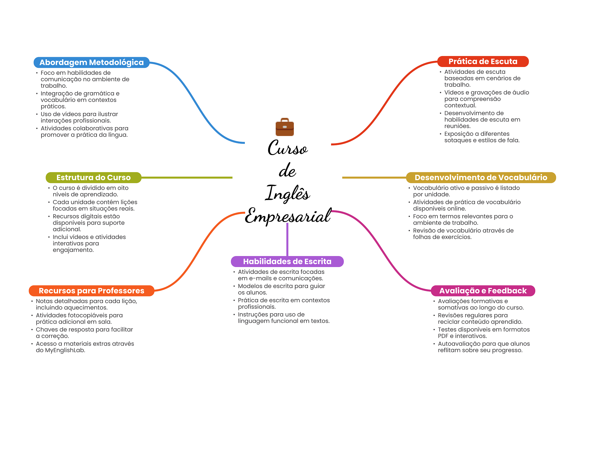 Abordagem Metodológica Prática de Escuta Foco em habilidades de Atividades de escuta comunicação no ambiente de baseadas em cenários de trabalho. trabalho. Integração de gramática e Vídeos e gravações de áudio vocabulário em contextos para compreensão práticos. contextual. Uso de vídeos para ilustrar Desenvolvimento de interações profissionais. habilidades de escuta em Atividades colaborativas para reuniões. promover a prática da língua. Exposição a diferentes sotaques e estilos de fala. Curso de Estrutura do Curso Desenvolvimento de Vocabulário curso é dividido em oito Inglês Vocabulário ativo e passivo é listado níveis de aprendizado. por unidade. Cada unidade contém lições Atividades de prática de vocabulário focadas em situações reais. disponíveis online. Recursos digitais estão Foco em termos relevantes para disponíveis para suporte Empresarial ambiente de trabalho. adicional. Revisão de vocabulário através de Inclui vídeos e atividades folhas de exercícios. interativas para engajamento. Habilidades de Escrita Atividades de escrita focadas em e-mails e comunicações. Modelos de escrita para guiar Recursos para Professores alunos. Avaliação e Feedback Notas detalhadas para cada lição, Prática de escrita em contextos Avaliações formativas e incluindo aquecimentos. profissionais. somativas ao longo do curso. Atividades fotocopiáveis para Instruções para uso de Revisões regulares para prática adicional em sala. linguagem funcional em textos. reciclar conteúdo aprendido. Chaves de resposta para facilitar Testes disponíveis em formatos a correção. PDF e interativos. Acesso a materiais extras através Autoavaliação para que alunos do MyEnglishLab. reflitam sobre seu progresso.