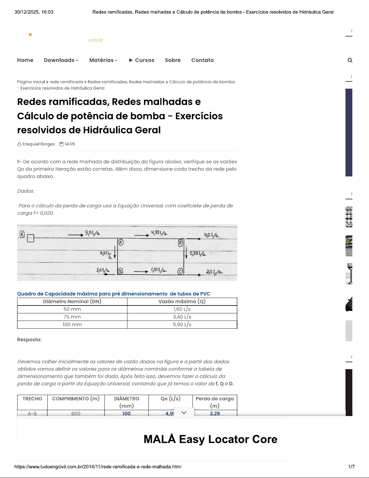 30/12/2025, 16:03 Redes ramificadas, Redes malhadas e Cálculo de potência de bomba Exercícios resolvidos de Hidráulica Geral .com.br Home Downloads Matérias Cursos Sobre Contato Q Página inicial > rede ramificada > Redes ramificadas, Redes malhadas e Cálculo de potência de bomba Exercícios resolvidos de Hidráulica Geral Redes ramificadas, Redes malhadas e Cálculo de potência de bomba - Exercícios resolvidos de Hidráulica Geral Ezequiel Borges 14:05 1- De acordo com a rede malhada de distribuição da figura abaixo, verifique se as vazões Qo da primeira iteração estão corretas. Além disso, dimensione cada trecho da rede pelo quadro abaixo. Dados: Para cálculo da perda de carga usa a Equação Universal, com coeficiete de perda de carga f= 0,020. R 9,0L/2 4,99L/2 A B D Quadro de Capacidade máxima para pré dimensionamento de tubos de PVC Diâmetro Nominal (DN) Vazão máxima (Q) 50 mm 1,60 L/s 75 mm 3,40 L/s 100 mm 5,90 Resposta: Devemos colher inicialmente valores de vazão dados na figura e a partir dos dados obtidos vamos definir valores para diâmetros nomináis conforme a tabela de dimensionamento que também foi dada. Após feito isso, devemos fazer O cálculo da perda de carga a partir da Equação Universal, contando que já temos valor de f, Q e D. TRECHO COMPRIMENTO (m) DIÂMETRO Qo (L/s) Perda de carga (mm) (m) 800 100 4,9 3,29 Easy Locator Core 1/730/12/2025, 16:03 Redes ramificadas, Redes malhadas e Cálculo de potência de bomba Exercícios resolvidos de Hidráulica Geral Q2 π2g 05 8.0,02 800 3,29 m 8.0,02 400 8.0,02 = 800 8.0,02 400 (0,1)5 Após feita a tabela, devemos fazer O somatório das perdas de cargas e para que valores de Qo sejam válidos, essa somatória deve ser muito próxima a zero ou caso seja especificado deve coincidir com a precisão dada, caso valor não corresponda a precisão, deve-se fazer uma nova iteração com novos valores de Qo até que chegue a precisão desejada. Os valores de vazão estão corretos, 2- Determine diâmetros das tubulações de recalque e succção de uma instalação elevatória que deve recalcar 200L/s de água, durante 24 horas por dia. Considerando uma altura manométrica de 96m, cálcule também a potência do conjunto elevatório. Dados: K=1,2 (fator da fórmula de Bresse) Diâmetros disponíveis: 500, 600, 700 e 800 mm Rendimento da bomba = rendimento do motor = 80% Resposta: 2/730/12/2025, 16:03 Redes ramificadas, Redes malhadas e Cálculo de potência de bomba Exercícios resolvidos de Hidráulica Geral 2 FORMULA BRESSE 400cv 3- De acordo com a rede ramificada abaixo, complete a planilha com os valores de vazão e diâmetro de cada trecho da tubulação. 6 4 3 8 5 R TRECHO SEM 2 Dados: Vazão distribuida na rede = TRECHO L (m) Qj (L/s) Qd (L/s) Qm (L/s) Qf (L/s) D (n 1-3 300 0 3 3 1,5 7 2-3 400 0 4 4 2 10 3-5 500 7 5 12 9,5 15 4-5 300 0 3 3 1,5 7 5-8 500 15 5 20 17,5 20 6-8 300 0 3 3 1,5 7 7-8 400 0 4 4 2 10 8-R 3000 27 0 27 27 20 Qj = Vazão a juzante = Toda vazão a juzante do trecho Qd = Vazão no trecho =L* (Vazão distribuida na rede / Somatório em todo trecho que há distribuição) = 27/2700 = L* 0,01 Qm = Vazão a montante = Qj + Qd Qf = Vazão fictícia = (Qj + Qm)/2 D = diâmetro = Analisar a vazão Qm e consultar diâmetro na tabela do material do tubo, em nosso caso usamos PVC e a tabela usada será anexada abaixo. 3/730/12/2025, 16:03 Redes ramificadas, Redes malhadas e Cálculo de potência de bomba Exercícios resolvidos de Hidráulica Geral Quadro 3.12 - Capacidade máxima para pré-dimensionamento de sistemas de abastecimento de água, utilizando tubos de PVC DN DE (mm) D (mm) Umáx (m/s) Qmáx 50* 60 54,6 0,68 1,6 75* 85 77,2 0,72 3,4 100* 110 100,0 0,75 5,9 100 118 108,4 0,76 7,0 150 170 156,4 0,83 16,0 200 222 204,2 0,91 29,7 250 274 252,0 0,98 48,8 300 326 299,8 1,05 74,1 400 429 394,6 1,19 145,8 500 532 489,4 1,33 251,0 Referência Tubos Tigre da linha PBA PVC 12 assinalados com (*) e Tubos Tigre da linha Vinilfer 1 MPa Você também pode conferir a resolução desse exercício por video logo abaixo: 4- De acordo com a rede ramificada abaixo, complete a planilha com valores de vazão e diâmetro de cada trecho da tubulação. R 5 7 2 4 5 I/s 6 3 1 5 I/s 4/730/12/2025, 16:03 Redes ramificadas, Redes malhadas e Cálculo de potência de bomba Exercícios resolvidos de Hidráulica Geral 5-7 300 3 3 1,5 6-7 300 3 3 1,5 7-R 3000 40 40 40 Somatório de L distribuída: 2600m Qd= (Vazão distríbuida) / (Somatório de L) * L 26/2600 * L 0,01 L Qm= Qj+Qm Qf= (Qj+Qm)/2 Tags Hidráulica Geral rede malhada rede ramificada ESSA POSTAGEM: f Facebook Twitter G+ in POSTADO POR EZEQUIEL BORGES Olá, me chamo Ezequiel Borges, sou engenheiro civil e fundador do blog tudoengcivil.com.br Sou apaixonado por engenharia e tecnologia, principalmente quando aliados. Se essa postagem te ajudou, saiba que neste blog tem várias outras postagens que podem te ajudar. Um abraço. TALVEZ VOCÊ GOSTE DESTAS POSTAGENS Videoaula #7 Cálculo de Redes ramificadas, Redes Videoaula #4 Definindo redes ramificadas - malhadas e Cálculo de sentido do escoamento Exercício resolvido de potência de bomba Exercício resolvido de Hidráulica Geral Exercícios resolvidos de Hidráulica December 11, 2014 Hidráulica Geral October 04, 2014 November 11, 2014 POSTAR UM COMENTÁRIO 6 Comentários CÁH (: 26 de agosto de 2015 às 18:18 OBRIGADA!!! ME SALVOU!!! 5/730/12/2025, 16:03 Redes ramificadas, Redes malhadas e Cálculo de potência de bomba Exercícios resolvidos de Hidráulica Geral UNKNOWN 28 de agosto de 2015 às 09:55 seu site é muito om, obrigado por nos ajudar! Responder Excluir Respostas Responder AL VARGAS 8 de julho de 2016 às 03:01 Esses exercício tão muito fraco sério. conhecimento que tem aí é 1% equivalente ao necessário para conseguir para com a prof taty T_T Responder Excluir Respostas Responder MUNDO VIRTUAL 12 de setembro de 2016 às 11:34 muito obrigada! Responder Excluir Respostas Responder UNKNOWN