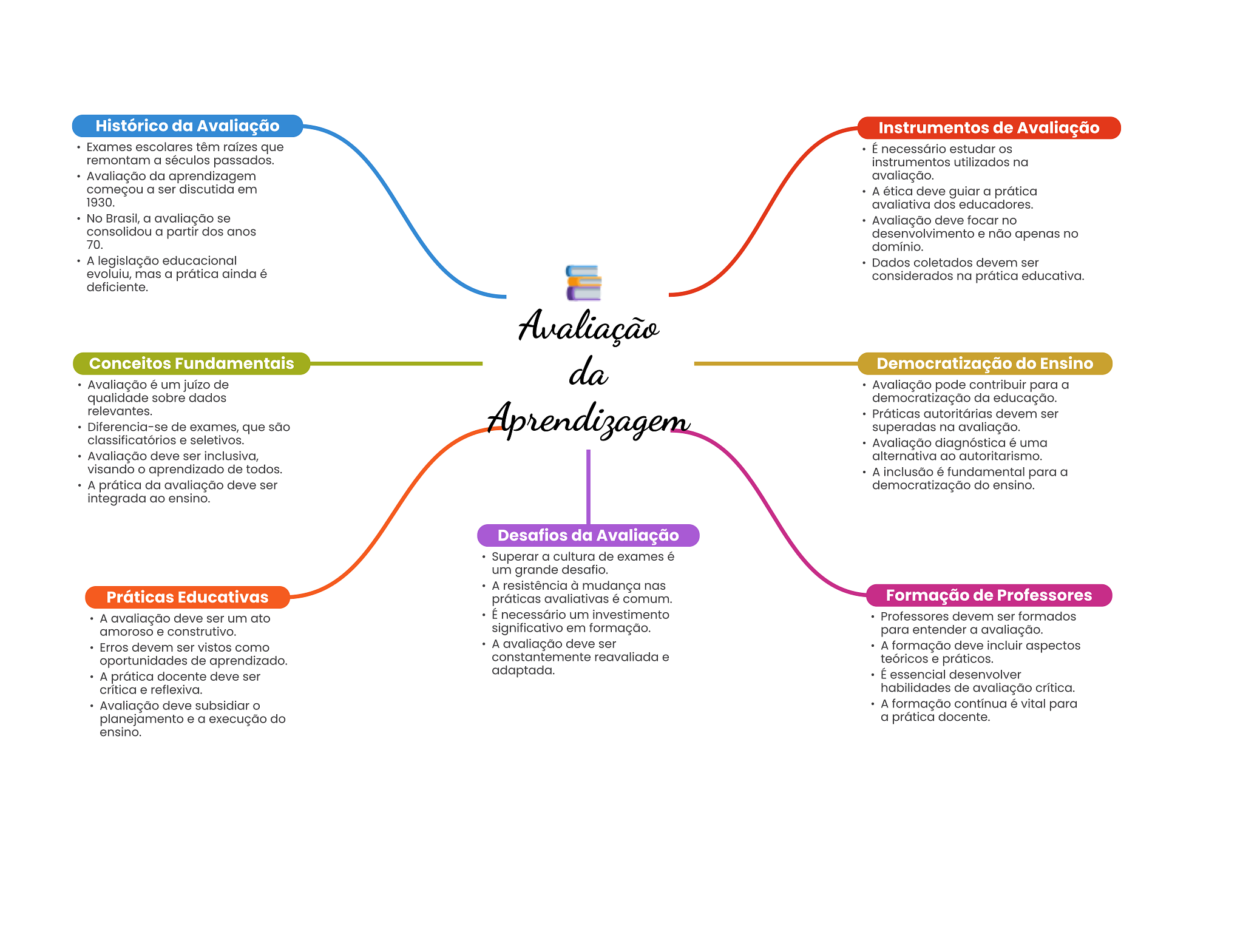Histórico da Avaliação Instrumentos de Avaliação Exames escolares têm raízes que É necessário estudar remontam a séculos passados. instrumentos utilizados na Avaliação da aprendizagem avaliação. começou a ser discutida em A ética deve guiar a prática 1930. avaliativa dos educadores. No Brasil, a avaliação se Avaliação deve focar no consolidou a partir dos anos desenvolvimento e não apenas no 70. domínio. A legislação educacional Dados coletados devem ser evoluiu, mas a prática ainda é considerados na prática educativa. deficiente. Avaliação Conceitos Fundamentais da Democratização do Ensino Avaliação é um juízo de Avaliação pode contribuir para a qualidade sobre dados democratização da educação. relevantes. Diferencia-se de exames, que são Aprendizagem Práticas autoritárias devem ser superadas na avaliação. classificatórios e seletivos. Avaliação diagnóstica é uma Avaliação deve ser inclusiva, alternativa ao autoritarismo. visando aprendizado de todos. A inclusão é fundamental para a A prática da avaliação deve ser democratização do ensino. integrada ao ensino. Desafios da Avaliação Superar a cultura de exames é um grande desafio. A resistência à mudança nas Práticas Educativas práticas avaliativas é comum. Formação de Professores A avaliação deve ser um ato É necessário um investimento Professores devem ser formados amoroso e construtivo. significativo em formação. para entender a avaliação. Erros devem ser vistos como A avaliação deve ser A formação deve incluir aspectos oportunidades de aprendizado. constantemente reavaliada e teóricos e práticos. A prática docente deve ser adaptada. É essencial desenvolver crítica e reflexiva. habilidades de avaliação crítica. Avaliação deve subsidiar A formação contínua é vital para planejamento e a execução do a prática docente. ensino.