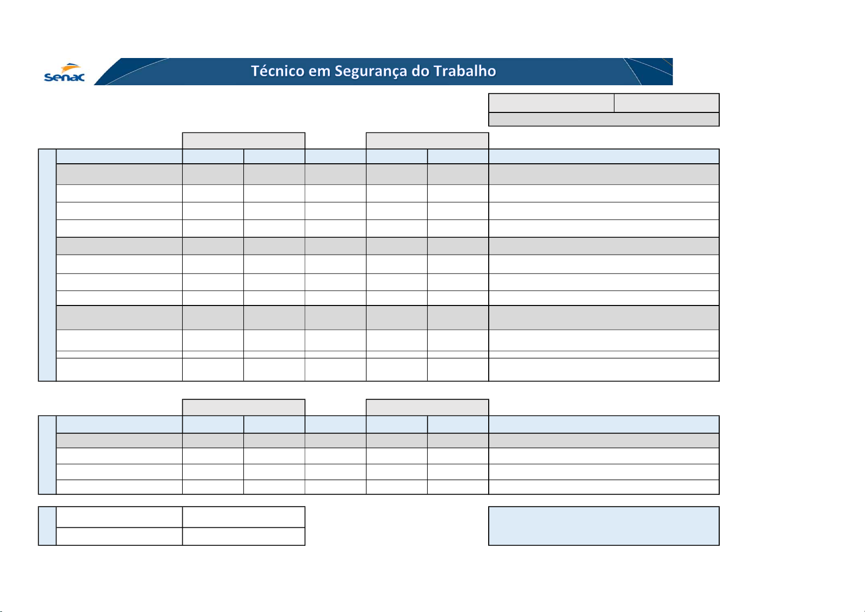 2025 - 4º Ciclo Encontro com Tutor: Terças-feiras das 20h às 21h Aula inaugural - Bem-vindo! Conheça seu curso: 05/08/2025 Início da Etapa I: 04/08/2025 Final da Etapa I: 17/08/2026 Unidades Curriculares Duração (Semanas) Início de Envio das Atividades Prazo Final de Envio das Atividades Início Recuperações Término Recuperações Projeto Integrador I 20 04/08/2025 08/12/2025 15/12/2025 22/12/2025 Elaborar, implantar e implementar a Política de Saúde e Segurança do Trabalho. 5 04/08/2025 01/09/2025 08/09/2025 15/09/2025 Realizar avaliação e medidas de controle de riscos físicos, químicos e biológicos 7 08/09/2025 20/10/2025 27/10/2025 03/11/2025 Realizar avaliação e medidas de controle de riscos ergonômicos e de acidentes 7 27/10/2025 08/12/2025 15/12/2025 22/12/2025 Projeto Integrador II 19 15/12/2025 13/04/2026 20/04/2026 27/04/2026 Monitorar riscos ocupacionais. 6 15/12/2025 19/01/2026 26/01/2026 02/02/2026 Planejar ações educativas em saúde e segurança do trabalho 5 26/01/2026 23/02/2026 02/03/2026 09/03/2026 Executar ações educativas em saúde e segurança do trabalho 7 02/03/2026 13/04/2026 20/04/2026 27/04/2026 Projeto Integrador III 17 20/04/2026 03/08/2026 10/08/2026 17/08/2026 Executar ações de investigação, registro e controle de incidentes, acidentes de trabalho e doenças ocupacionais. 7 20/04/2026 01/06/2026 08/06/2026 15/06/2026 Controlar Situações de Emergência. 3 08/06/2026 22/06/2026 29/06/2026 06/07/2026 Elaborar, implantar e implementar planos de emergência /urgência. 6 29/06/2026 03/08/2026 10/08/2026 17/08/2026 Início da Etapa II: 07/09/2026 Final da Etapa II: 01/02/2027 Unidades Curriculares Duração (Semanas) Início de Envio das Atividades Prazo Final de Envio das Atividades Início Recuperações Término Recuperações Projeto Integrador IV 21 07/09/2026 18/01/2027 25/01/2027 01/02/2027 Auxiliar e executar ações de elaboração dos programas de saúde e segurança do trabalho. 7 07/09/2026 19/10/2026 26/10/2026 02/11/2026 Implantar e implementar os programas de saúde e segurança do trabalho. 6 26/10/2026 30/11/2026 07/12/2026 14/12/2026 Auxiliar a gestão integrada da organização 7 07/12/2026 18/01/2027 25/01/2027 01/02/2027 UC PI Modalidade de oferta da Carga Horária Presencial da UC Et ap a I Nesta Unidade Curricular a Carga Horaria presencial é ofertada através de recursos tecnológicos Não há encontro presencial nesta Unidade Curricular Nesta Unidade Curricular a Carga Horaria presencial é ofertada através de recursos tecnológicos Nesta Unidade Curricular a Carga Horaria presencial é ofertada através de recursos tecnológicos Nesta Unidade Curricular a Carga Horaria presencial é ofertada através de recursos tecnológicos Modalidade de oferta da Carga Horária Presencial da UC Nesta Unidade Curricular a Carga Horaria presencial é ofertada através de recursos tecnológicos Nesta Unidade Curricular a Carga Horaria presencial é ofertada através de recursos tecnológicos Nesta Unidade Curricular a Carga Horaria presencial é ofertada através de recursos tecnológicos Nesta Unidade Curricular a Carga Horaria presencial é ofertada através de recursos tecnológicos Nesta Unidade Curricular a Carga Horaria presencial é ofertada através de recursos tecnológicos Nesta Unidade Curricular a Carga Horaria presencial é ofertada através de recursos tecnológicos Nesta Unidade Curricular a Carga Horaria presencial é ofertada através de recursos tecnológicos Et ap a II LE G EN D A S: UNIDADE CURRICULAR NÃO HÁ PRÉ-REQUISITOS ENTRE AS UCs DESTE CURSO PROJETO INTEGRADOR Nesta Unidade Curricular a Carga Horaria presencial é ofertada através de recursos tecnológicos Nesta Unidade Curricular a Carga Horaria presencial é ofertada através de recursos tecnológicos Nesta Unidade Curricular a Carga Horaria presencial é ofertada através de recursos tecnológicos Nesta Unidade Curricular a Carga Horaria presencial é ofertada através de recursos tecnológicos