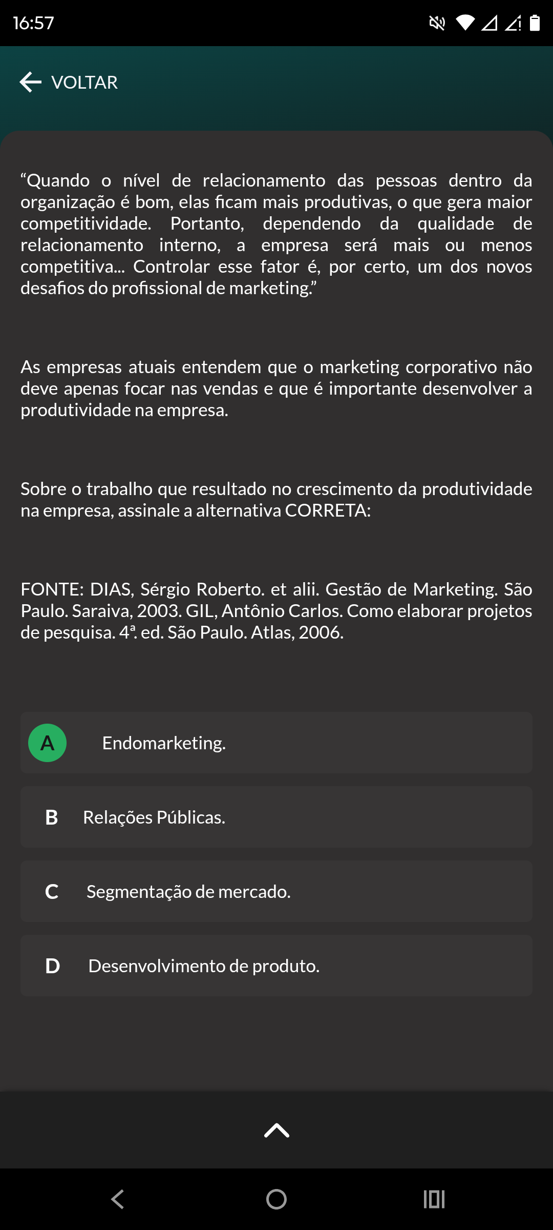 16:57 VOLTAR "Quando o nível de relacionamento das pessoas dentro da organização é bom, elas ficam mais produtivas, o que gera maior competitividade. Portanto, dependendo da qualidade de relacionamento interno, a empresa será mais ou menos competitiva... Controlar esse fator é, por certo, um dos novos desafios do profissional de marketing." As empresas atuais entendem que marketing corporativo não deve apenas focar nas vendas e que é importante desenvolver a produtividade na empresa. Sobre trabalho que resultado no crescimento da produtividade na empresa, assinale a alternativa CORRETA: FONTE: DIAS, Sérgio Roberto. et alii. Gestão de Marketing. São Paulo. Saraiva, 2003. GIL, Antônio Carlos. Como elaborar projetos de pesquisa. 4ª. ed. São Paulo. Atlas, 2006. A Endomarketing. Relações Públicas. c Segmentação de mercado. D Desenvolvimento de produto.