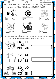 R - 13. COMPLETE AS COM 12 NA A LEJO BUMBA RRO 14. CIRCULE AS SILABAS DA REORGANIZE-AS : ESCREVA A NO ESPAÇO AO TO A SE ZEI NA PU ZE BU SE zo GI