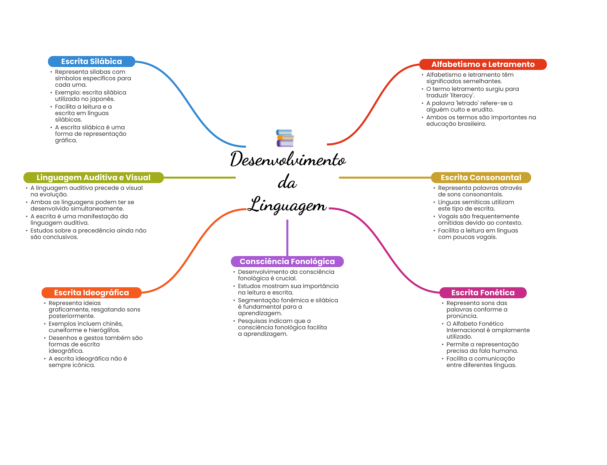 Escrita Silábica Alfabetismo e Letramento Representa sílabas com Alfabetismo e letramento têm símbolos específicos para cada uma. significados semelhantes. Exemplo: escrita silábica termo letramento surgiu para traduzir 'literacy'. utilizada no japonês. Facilita a leitura e a A palavra 'letrado' refere-se a escrita em línguas alguém culto e erudito. silábicas. Ambos termos são importantes na A escrita silábica é uma educação brasileira. forma de representação gráfica. Desenvolvimento Linguagem Auditiva e Visual da Escrita Consonantal A linguagem auditiva precede a visual Representa palavras através na evolução. de sons consonantais. Ambas as linguagens podem ter se desenvolvido simultaneamente. Linguagem Línguas semíticas utilizam este tipo de escrita. A escrita é uma manifestação da Vogais são frequentemente linguagem auditiva. omitidas devido ao contexto. Estudos sobre a precedência ainda não Facilita a leitura em línguas são conclusivos. com poucas vogais. Consciência Fonológica Desenvolvimento da consciência fonológica é crucial. Estudos mostram sua importância Escrita Ideográfica na leitura e escrita. Escrita Fonética Representa ideias Segmentação fonêmica e silábica Representa sons das graficamente, resgatando sons é fundamental para a palavras conforme a posteriormente. aprendizagem. pronúncia. Exemplos incluem chinês, Pesquisas indicam que a Alfabeto Fonético cuneiforme e hieróglifos. consciência fonológica facilita Internacional é amplamente a aprendizagem. Desenhos e gestos também são utilizado. formas de escrita Permite a representação ideográfica. precisa da fala humana. A escrita ideográfica não é Facilita a comunicação sempre icônica. entre diferentes línguas.