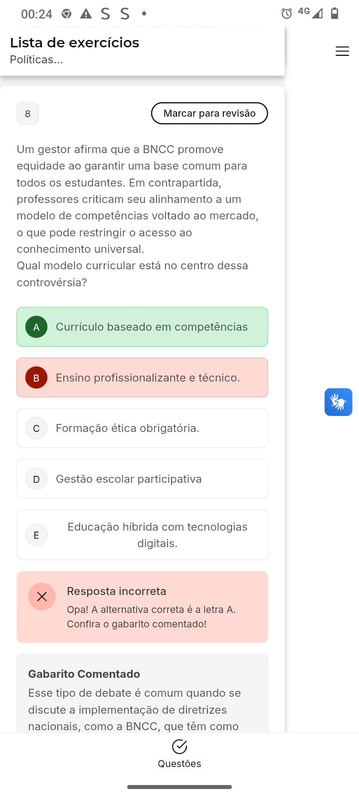 00:24 S S 4G Lista de exercícios Políticas... 8 Marcar para revisão Um gestor afirma que a BNCC promove equidade ao garantir uma base comum para todos estudantes. Em contrapartida, professores criticam seu alinhamento a um modelo de competências voltado ao mercado, que pode restringir acesso ao conhecimento universal. Qual modelo curricular está no centro dessa controvérsia? A Currículo baseado em competências Ensino profissionalizante e técnico. Formação ética obrigatória. D Gestão escolar participativa Educação híbrida com tecnologias digitais. X Resposta incorreta Opa! A alternativa correta é a letra A. Confira O gabarito comentado! Gabarito Comentado Esse tipo de debate é comum quando se discute a implementação de diretrizes nacionais, como a BNCC, que têm como Questões