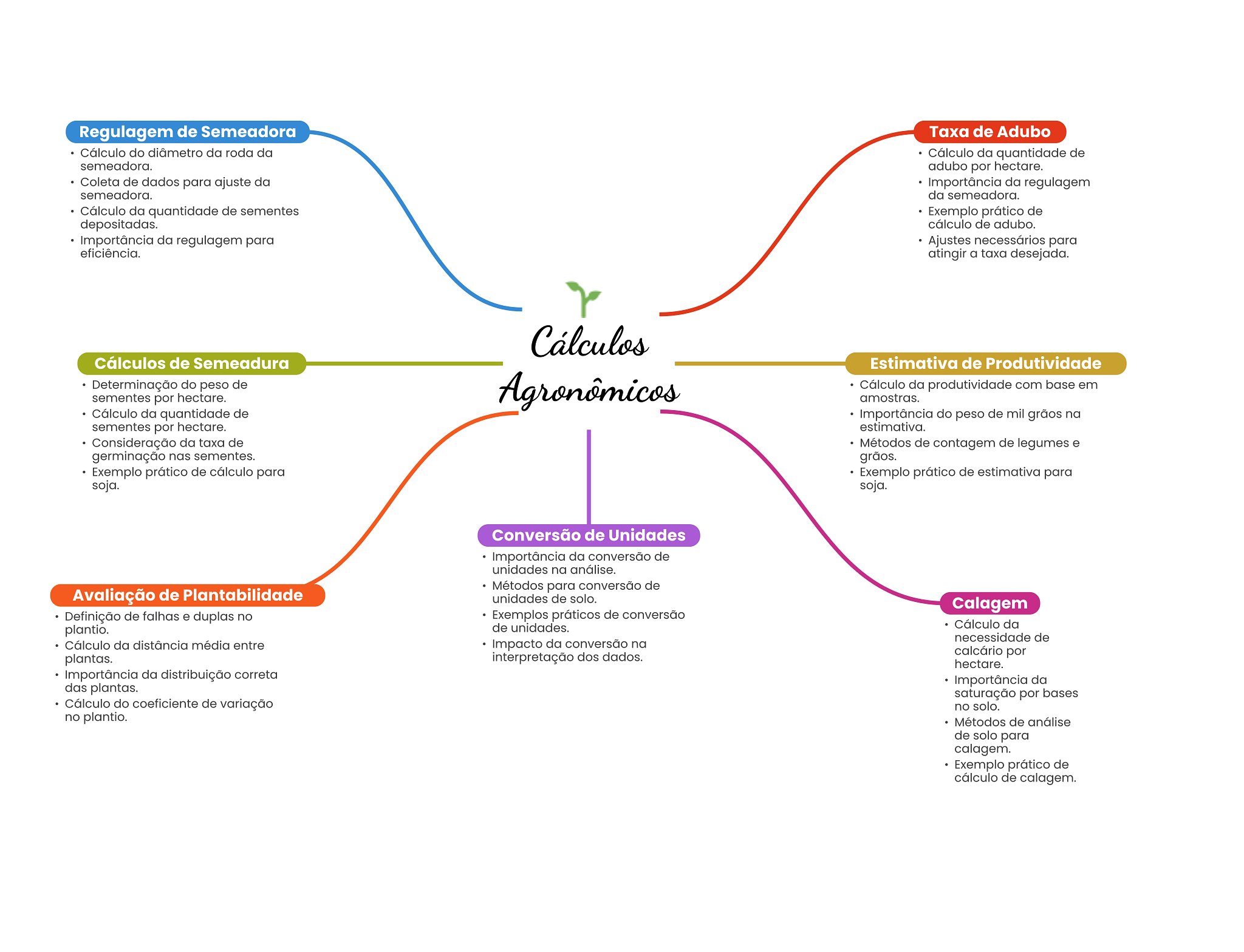 Regulagem de Semeadora Taxa de Adubo Cálculo do diâmetro da roda da Cálculo da quantidade de semeadora. adubo por hectare. Coleta de dados para ajuste da Importância da regulagem semeadora. da semeadora. Cálculo da quantidade de sementes Exemplo prático de depositadas. cálculo de adubo. Importância da regulagem para Ajustes necessários para eficiência. atingir a taxa desejada. Cálculos Cálculos de Semeadura Estimativa de Produtividade Determinação do peso de Agronômicos Cálculo da produtividade com base em sementes por hectare. amostras. Cálculo da quantidade de Importância do peso de mil grãos na sementes por hectare. estimativa. Consideração da taxa de Métodos de contagem de legumes e germinação nas sementes. grãos. Exemplo prático de cálculo para Exemplo prático de estimativa para soja. soja. Conversão de Unidades Importância da conversão de unidades na análise. Métodos para conversão de Avaliação de Plantabilidade unidades de solo. Calagem Definição de falhas e duplas no Exemplos práticos de conversão plantio. de unidades. Cálculo da necessidade de Cálculo da distância média entre Impacto da conversão na plantas. interpretação dos dados. calcário por hectare. Importância da distribuição correta Importância da das plantas. saturação por bases Cálculo do coeficiente de variação no solo. no plantio. Métodos de análise de solo para calagem. Exemplo prático de cálculo de calagem.