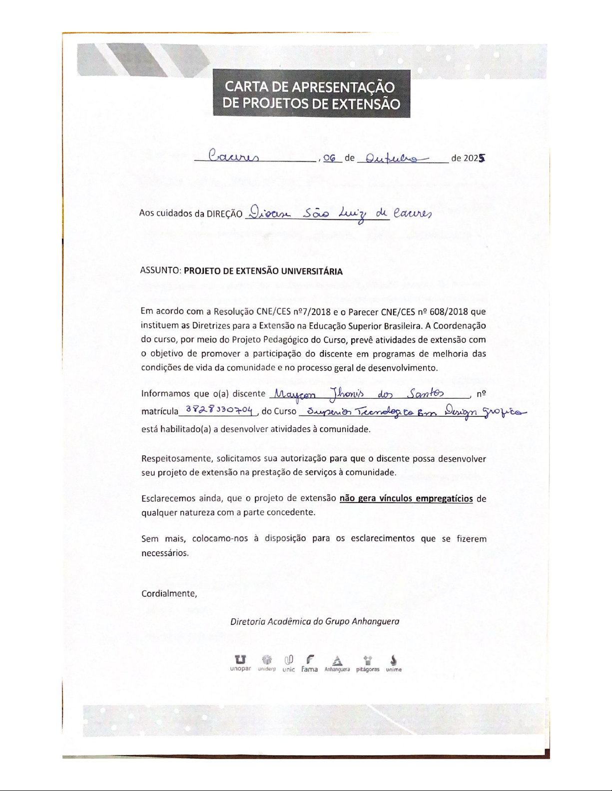 1 Público ALUNO: Maycon Jhonis dos Santos CURSO: CST EM DESIGN GRÁFICO COMPONENTE CURRICULAR: PROJETO DE EXTENSÃO II - DESIGN GRÁFICO PROGRAMA DE EXTENSÃO: PROGRAMA DE SUSTENTABILIDADE. FINALIDADE E MOTIVAÇÃO: O Programa de Sustentabilidade para a extensão do curso de Tecnologia em Design Gráfico, busca o desenvolvimento de competências e soft skills específicas pelos alunos no âmbito de sua interação junto à comunidade, na contribuição com iniciativas de responsabilidade socioambiental que irão enriquecer sua futura atuação profissional, bem como em suas atividades pessoais. Pela proposta de ações que possam ser realizadas junto a: ONGs, Prefeitura, Associação de Bairro, Associação Comercial, Escola, Órgãos Públicos de todas as instâncias. COMPETÊNCIAS: I - Desenvolver projetos e selecionar tecnologias seguindo os princípios de sustentabilidade (social, econômica e ambiental); II - Promover conexões entre conhecimentos históricos, estéticos e culturais, valorizando as especificidades locais; III - Contemplar, na ação projetual, os aspectos sensoriais e perceptivos respeitando os princípios de acessibilidade e de usabilidade. PERFIL DE EGRESSO: O perfil do egresso do curso de Tecnologia em Design Gráfico idealizado pela IES busca incentivar uma série de valores e atitudes que capacitam o profissional a atuar de forma ética e comprometida com os interesses e desafios da sociedade contemporânea. Sendo capaz de acompanhar e aplicar a evolução científica e tecnológica na área gráfica e criativa em benefício da sociedade, do meio ambiente e da sustentabilidade, mantendo a responsabilidade social, conduta moral e respeito ao ser humano. SOFT SKILLS (COMPETÊNCIAS SOCIOEMOCIONAIS): Análise e resolução de problemas Gestão do Tempo Flexibilidade e adaptação OBJETIVOS DE APRENDIZAGEM: Os objetivos da extensão do curso de Tecnologia em Design Gráfico relacionados ao Programa de Sustentabilidade buscam contribuir com iniciativas de preservação 2 Público ambiental voltadas para a redução do impacto ambiental causado pelas atividades do design gráfico junto à comunidade, preparando o egresso para uma atuação global, focado no mercado de trabalho e atuante junto a comunidade. CONTEÚDOS: I - Estudo das relações entre design, sociedade e cultura; II - Design de embalagem; III - Ética e legislação aplicadas ao design. INDICAÇÕES BIBLIOGRÁFICAS: WHITE, Andrew. Midias digitais e sociedade: transformando econonomia, políticas e práticas sociais. São Paulo: Saraiva, 2016. BAXTER, Mike. Projeto de produto: guia prático para o design de novos produtos. São Paulo: Blucher, 2011. MATRONIANI, Renato. Materiais de embalagem: tipos, processos produtivos e aplicações. São Paulo: Platos Soluções Educacionais S.A., 2021. TEMPLATE PDCA: Aluno e Aluna, essa atividade é para sua organização e uso da metodologia PDCA. Por isso é um documento orientativo e não precisa ser entregue. Veja as orientações apresentadas no MANUAL DE ATIVIDADES EXTENSIONISTAS. 1. PLANEJAMENTO (PLAN) Antes de definir sua proposta, explore os Objetivos de Desenvolvimento Sustentável (ODS) da Organização das Nações Unidas (ONU) no link https://brasil.un.org/pt-br/sdgs. Se preferir, pode baixar o documento pelo link https://brasil.un.org/sites/default/files/2020-09/agenda2030-pt- br.pdf. Compreenda a proposta da ONU e engaje-se nessa oportunidade de contribuir com as metas de um organismo internacional tão importante ao mesmo tempo em que participa de soluções de seu contexto! Analise os 17 objetivos e escolha quais metas podem ser aderentes à sua proposta e ao seu projeto. Para isso, clique no ícone de cada objetivo e observe a listagem de metas disponível em cada um. É necessário que você escolha pelo menos uma meta. Pode ser que você encontre metas aderentes à sua proposta em diferentes objetivos, mas não se restrinja. Pode escolher dessa forma e mantenha o foco da essência de sua proposta. Feito isso, liste aqui suas escolhas. Essa informação também deverá ser declarada em seu Relatório Final de Atividades Extensionistas. LISTAR METAS DOS ODS ADERENTES AO SEU PROJETO ODS 2 – Fome Zero e Agricultura Sustentável Meta aplicada: 2.2 – Melhoria do estado nutricional de crianças e orientação alimentar acessível. https://brasil.un.org/pt-br/sdgs 3 Público ODS 3 – Saúde e Bem-Estar Metas aplicadas: 3.2 – Redução de doenças que atingem crianças pequenas. 3.8 – Promoção da saúde com ações educativas e preventivas. DEFINA A PROPOSTA. IMERSÃO: DEFINA OS ITENS DA IMERSÃO Segue sugestão de perguntas para utilizar na entrevista com o parceiro. SUGESTÃO DE SCRIPT DE ENTREVISTA 1. Quais os principais problemas, fragilidades ou dificuldades que a instituição/parceiro convive com maior frequência? 1.1. Os problemas estão articulados com o programa/conteúdo proposto no componente curricular? Se não estiver, será necessário voltar à pergunta 1. 1.2. É possível resolver ou mitigar os problemas identificados no prazo de duração de projeto de extensão. Se não for possível deve voltar à pergunta 1. 1.3. A solução ou mitigação auxiliará a comunidade ou um grupo de pessoas da comunidade? Se não auxiliar deve voltar à pergunta 1. 2. Quais serão as pessoas envolvidas na ação para buscar resolver ou mitigar os problemas identificados? 3. Onde será realizada a ação? 4. Há limitação de pessoas ou restrição para acesso ao local indicado? 5. Quais serão as pessoas beneficiadas diretamente? 6. Necessitará de insumos/recursos financeiros para a realização da ação? 7. Será necessário agendamento? 8. Qual o período, dia da semana, horário que será realizada a ação? • Levantamento das principais dificuldades da comunidade: alimentação, higiene, prevenção de doenças. • Observação das visitas domiciliares e reuniões mensais. • Entrevista com voluntárias e líderes da Pastoral. • I