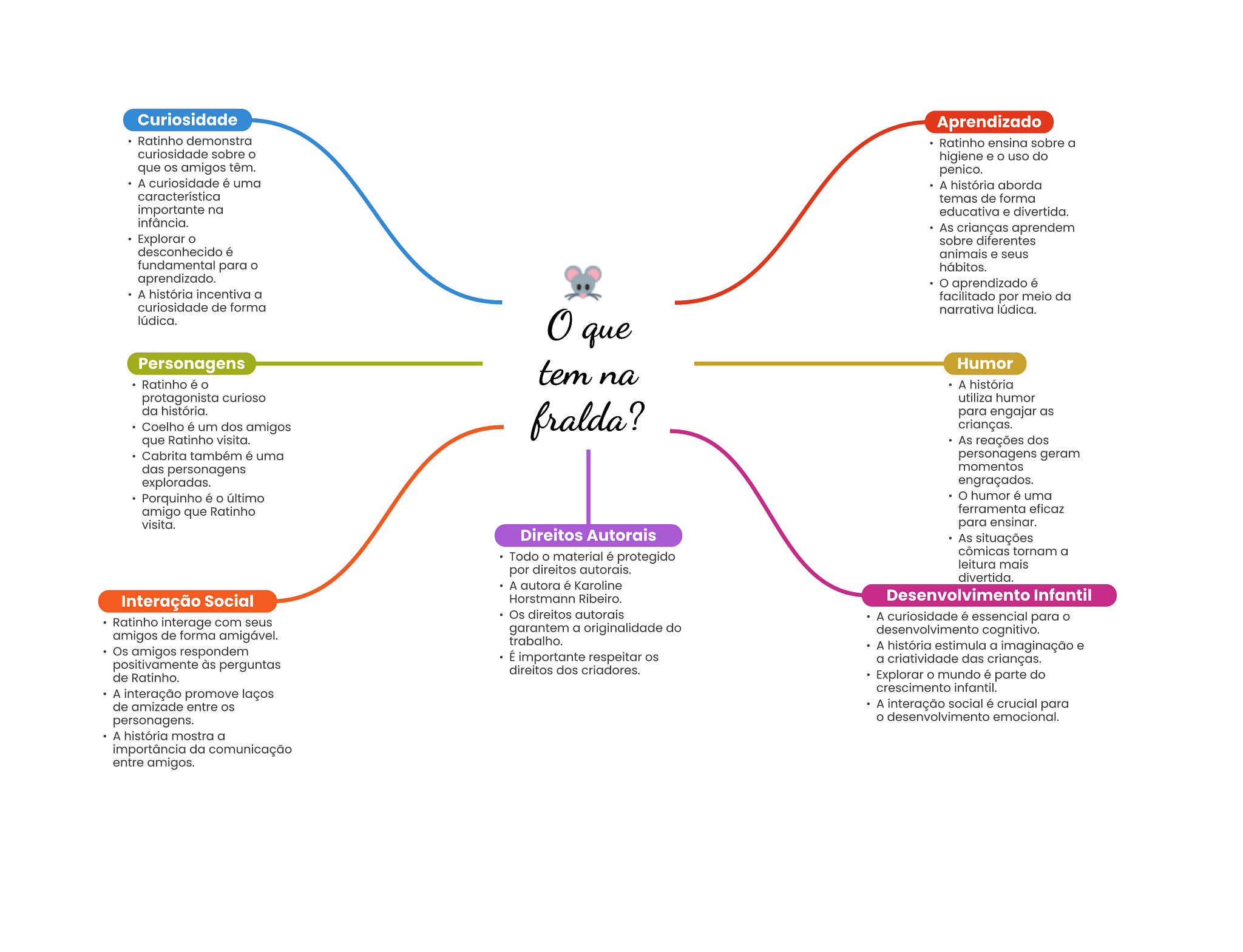 Curiosidade Aprendizado Ratinho demonstra Ratinho ensina sobre a curiosidade sobre higiene e uso do que amigos têm. penico. A curiosidade é uma A história aborda característica temas de forma importante na educativa e divertida. infância. As crianças aprendem Explorar sobre diferentes desconhecido é animais e seus fundamental para hábitos. aprendizado. aprendizado é A história incentiva a facilitado por meio da curiosidade de forma narrativa lúdica. lúdica. que Personagens tem na Humor Ratinho é A história protagonista curioso utiliza humor da história. fralda? para engajar as Coelho é um dos amigos crianças. que Ratinho visita. As reações dos Cabrita também é uma personagens geram das personagens momentos exploradas. engraçados. Porquinho é último O humor é uma amigo que Ratinho ferramenta eficaz visita. para ensinar. Direitos Autorais As situações Todo O material é protegido cômicas tornam a leitura mais por direitos autorais. divertida. A autora é Karoline Interação Social Horstmann Ribeiro. Desenvolvimento Infantil Os direitos autorais Ratinho interage com seus A curiosidade é essencial para garantem a originalidade do amigos de forma amigável. desenvolvimento cognitivo. trabalho. Os amigos respondem A história estimula a imaginação e É importante respeitar OS positivamente às perguntas a criatividade das crianças. direitos dos criadores. de Ratinho. Explorar mundo é parte do crescimento infantil. A interação promove laços de amizade entre A interação social é crucial para personagens. desenvolvimento emocional. A história mostra a importância da comunicação entre amigos.