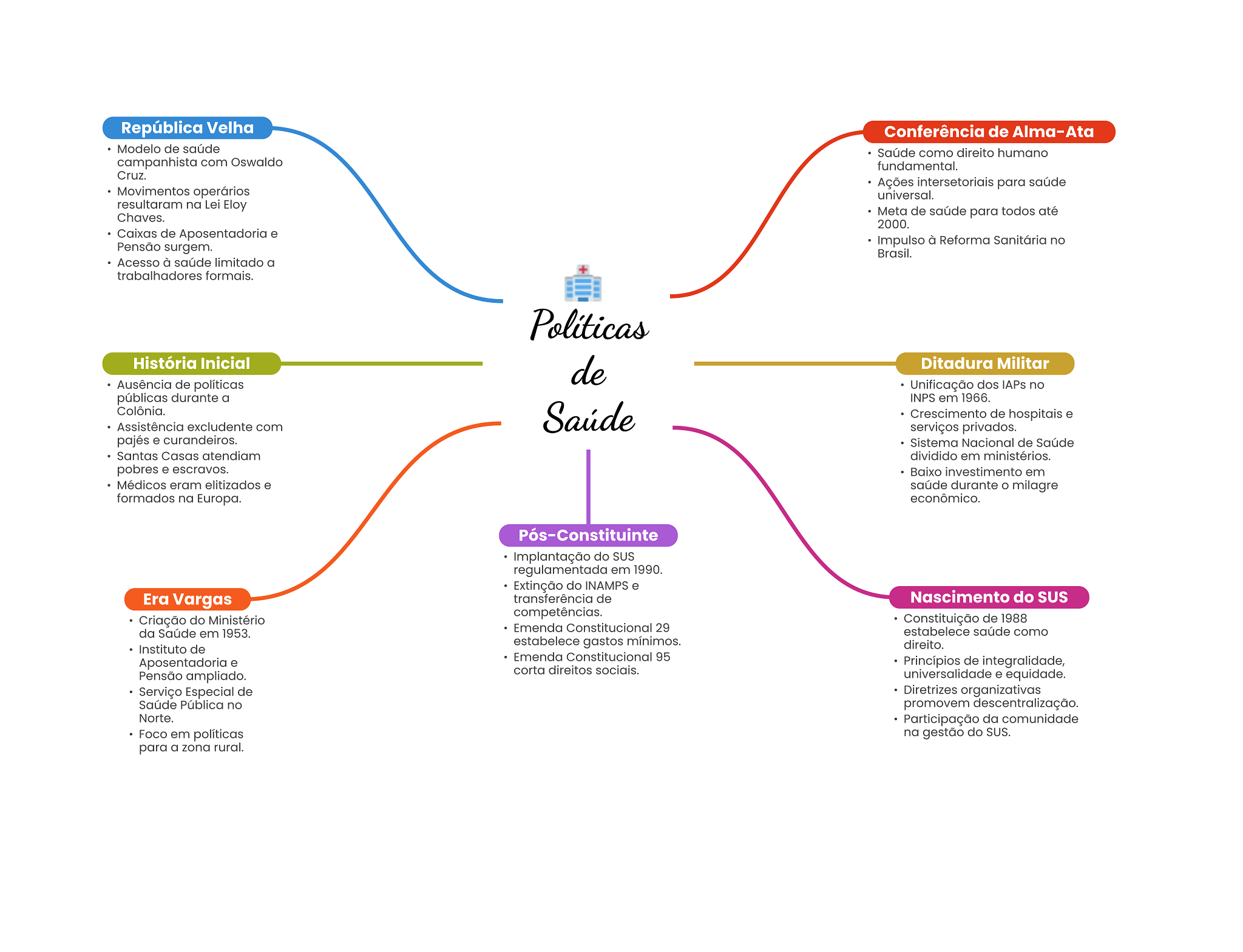 República Velha Conferência de Alma-Ata Modelo de saúde Saúde como direito humano campanhista com Oswaldo fundamental. Cruz. Ações intersetoriais para saúde Movimentos operários universal. resultaram na Lei Eloy Chaves. Meta de saúde para todos até 2000. Caixas de Aposentadoria e Impulso à Reforma Sanitária no Pensão surgem. Brasil. Acesso à saúde limitado a trabalhadores formais. História Inicial de Ditadura Militar Ausência de políticas Unificação dos IAPs no públicas durante a INPS em 1966. Colônia. Assistência excludente com Saúde Crescimento de hospitais e serviços privados. pajés e curandeiros. Sistema Nacional de Saúde Santas Casas atendiam dividido em ministérios. pobres e escravos. Baixo investimento em Médicos eram elitizados e saúde durante milagre formados na Europa. econômico. Pós-Constituinte Implantação do SUS regulamentada em 1990. Extinção do INAMPS e Era Vargas transferência de Nascimento do competências. Criação do Ministério de 1988 Emenda Constitucional 29 da Saúde em 1953. estabelece saúde como estabelece gastos mínimos. Instituto de direito. Emenda Constitucional 95 Aposentadoria e Princípios de integralidade, corta direitos sociais. Pensão ampliado. universalidade e equidade. Serviço Especial de Diretrizes organizativas Saúde Pública no promovem descentralização. Norte. Participação da comunidade Foco em políticas na gestão do SUS. para a zona rural.