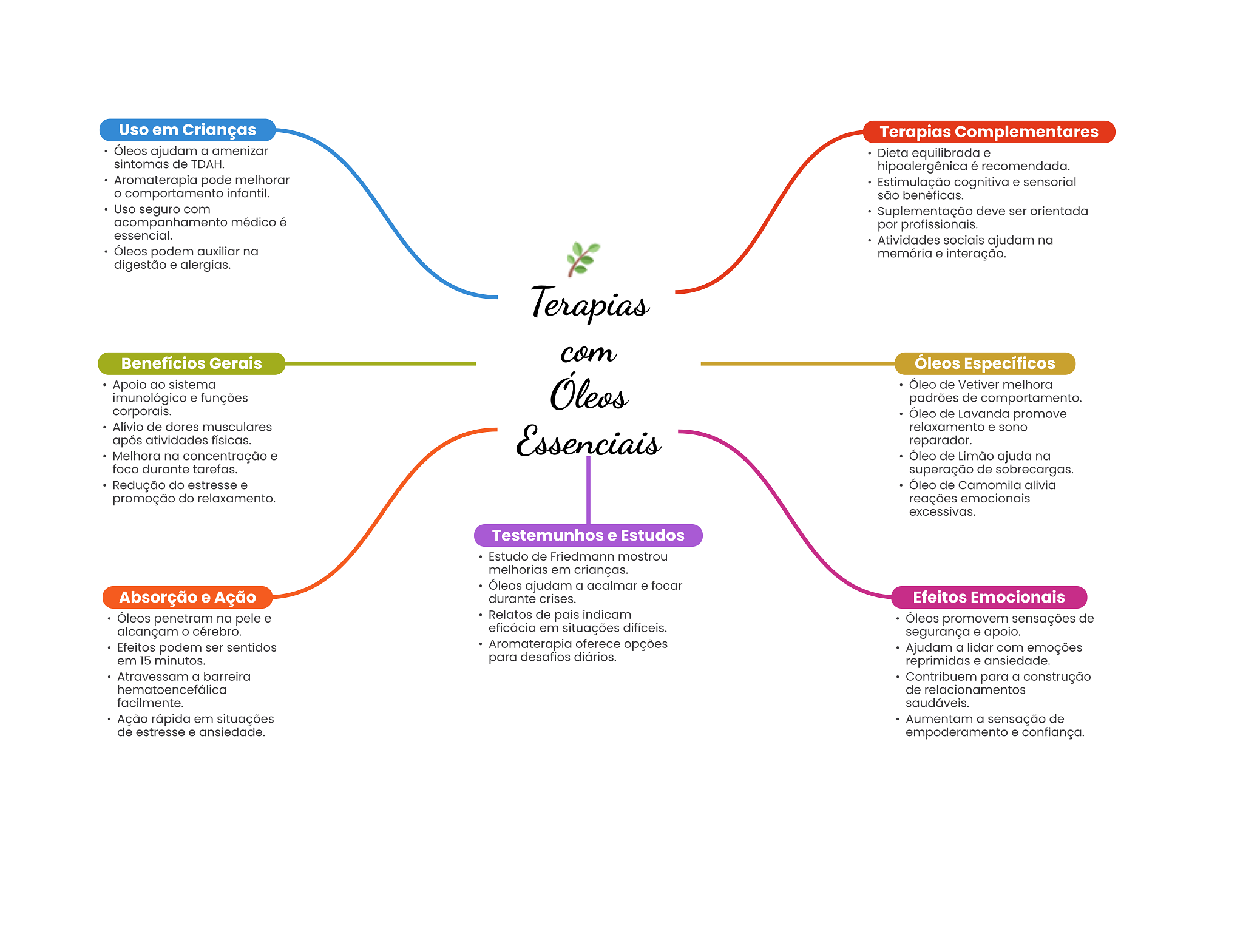 Uso em Crianças Terapias Complementares Óleos ajudam a amenizar Dieta equilibrada e sintomas de TDAH. hipoalergênica é recomendada. Aromaterapia pode melhorar Estimulação cognitiva e sensorial O comportamento infantil. são benéficas. Uso seguro com Suplementação deve ser orientada acompanhamento médico é por profissionais. essencial. Atividades sociais ajudam na Óleos podem auxiliar na memória e interação. digestão e alergias. Terapias com Benefícios Gerais Óleos Específicos Apoio ao sistema imunológico e funções Óleos Óleo de Vetiver melhora padrões de comportamento. corporais. Óleo de Lavanda promove Alívio de dores musculares relaxamento e sono após atividades físicas. Essenciais reparador. Melhora na concentração e Óleo de Limão ajuda na foco durante tarefas. superação de sobrecargas. Redução do estresse e Óleo de Camomila alivia promoção do relaxamento. reações emocionais excessivas. Testemunhos e Estudos Estudo de Friedmann mostrou melhorias em crianças. Óleos ajudam a acalmar e focar Absorção e Ação durante crises. Efeitos Emocionais Óleos penetram na pele e Relatos de pais indicam Óleos promovem sensações de alcançam cérebro. eficácia em situações difíceis. segurança e apoio. Efeitos podem ser sentidos Aromaterapia oferece opções Ajudam a lidar com emoções em 15 minutos. para desafios diários. reprimidas e ansiedade. Atravessam a barreira Contribuem para a construção hematoencefálica de relacionamentos facilmente. saudáveis. Ação rápida em situações Aumentam a sensação de de estresse e ansiedade. empoderamento e confiança.