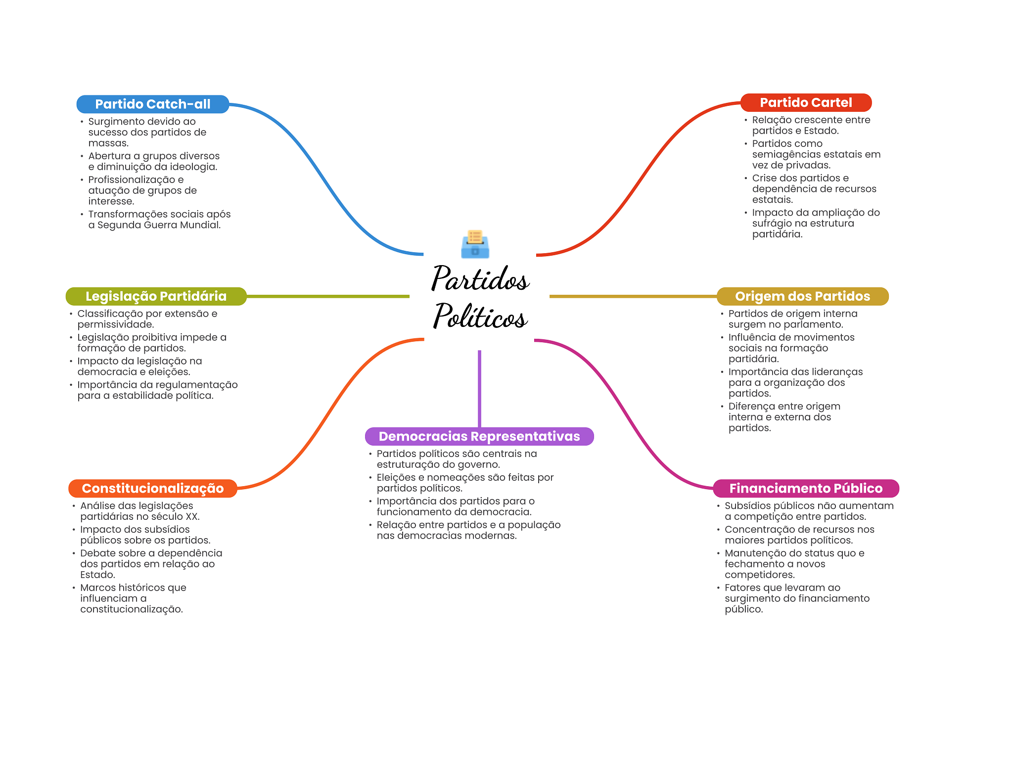 Partido Catch-all Partido Cartel Surgimento devido ao Relação crescente entre sucesso dos partidos de partidos e Estado. massas. Partidos como Abertura a grupos diversos semiagências estatais em e diminuição da ideologia. vez de privadas. Profissionalização e Crise dos partidos e atuação de grupos de dependência de recursos interesse. estatais. Transformações sociais após Impacto da ampliação do a Segunda Guerra Mundial. sufrágio na estrutura partidária. Partidos Legislação Partidária Origem dos Partidos Classificação por extensão e Partidos de origem interna permissividade. surgem no parlamento. Legislação proibitiva impede a Influência de movimentos formação de partidos. sociais na formação Impacto da legislação na partidária. democracia e eleições. Importância das lideranças Importância da regulamentação para a organização dos para a estabilidade política. partidos. Diferença entre origem interna e externa dos partidos. Democracias Representativas Partidos políticos são centrais na estruturação do governo. Eleições e nomeações são feitas por Constitucionalização partidos políticos. Financiamento Público Análise das legislações Importância dos partidos para funcionamento da democracia. Subsídios públicos não aumentam partidárias no século XX. a competição entre partidos. Impacto dos subsídios Relação entre partidos e a população nas democracias modernas. Concentração de recursos nos públicos sobre OS partidos. maiores partidos políticos. Debate sobre a dependência Manutenção do status quo e dos partidos em relação ao fechamento a novos Estado. competidores. Marcos históricos que Fatores que levaram ao influenciam a surgimento do financiamento público.