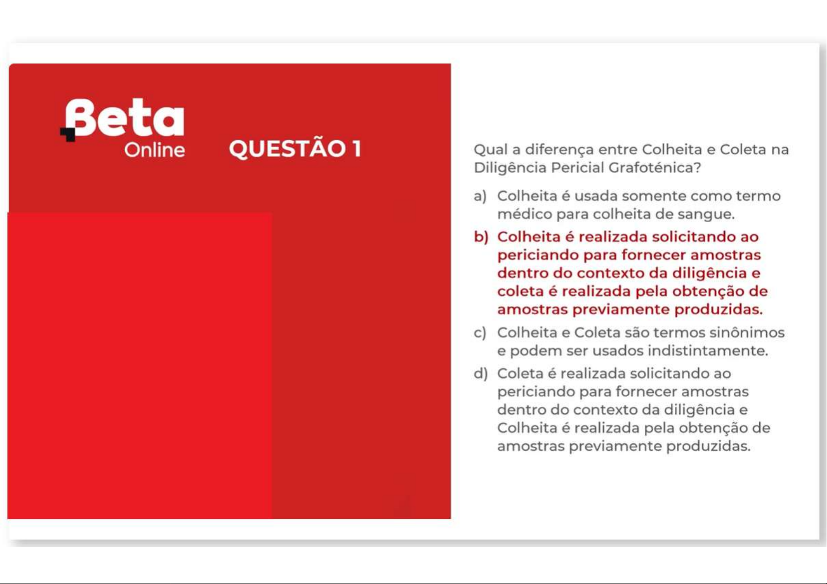 Beta Online Qual a diferença entre Colheita e Coleta na Diligência Pericial Grafoténica? a) Colheita é usada somente como termo médico para colheita de sangue. b) Colheita é realizada solicitando ao periciando para fornecer amostras dentro do contexto da diligência e coleta é realizada pela obtenção de amostras previamente produzidas. c) Colheita e Coleta são termos sinônimos e podem ser usados indistintamente. d) Coleta é realizada solicitando ao periciando para fornecer amostras dentro do contexto da diligência e Colheita é realizada pela obtenção de amostras previamente produzidas.Beta Online 2 Quando a diligência deve ser agendada pelo perito? a) Com 5 dias úteis de antecedência. b) Deve-se perguntar a data ao juiz. c) Deve ser agendada assim que periciando informar sua disponibilidade. d) Deve ser agendada tão logo se confirme que pagamento dos honorários já foi integralmente depositado em juízo.Beta Online QUESTÃO 3 Qual dos elementos abaixo não faz parte dos procedimentos de preparo para a realização da colheita grafotécnica? a) Análise da peça questionada. b) Perícia prévia a ser realizada na peça questionada. c) Avaliação da complexidade do objeto da perícia. d) Definição da quantidade de amostras a ser colhida na diligência.Beta Quantas assinaturas são necessárias Online QUESTÃO 4 serem colhidas durante a diligência pericial? a) A quantidade precisa ser definida após estudo adequado do objeto da perícia. b) A quantidade será informada pelas partes no quesito, ao definirem a metodologia que querem que perito utilize. c) 50 assinaturas, sendo 25 produzidas com olhos vendados. d) A quantidade será definida pelo magistrado a partir da média que normalmente peritos da comarca solicitam.Beta que é a ata da diligência? Online QUESTÃO 5 a) Documento que informa quando e onde será realizada a diligência para que as partes sejam intimadas. b) Documento que informa quais documentos as partes precisarão levar para a diligência para serem coletadas. c) Documento que informa que avalia a qualidade da diligência a partir dos resultados obtidos na coleita. d) Documento que informa quem esteve presente à diligência e que marca início e fim dos trabalhos.Beta Em que ocasião não devemos utilizar Online QUESTÃO 6 o ditado em diligências? a) Quando sentirmos que periciando está tentando despistar traços de sua escrita. b) Quando o periciando der mostras de que está entediado com a produção sistemática de grafismos e os lançamentos gráficos estão dando estas disso. c) Quando periciando tiver pouco letramento ou for muito idoso e sentir dificuldades em redigir corretamente palavras e termos. d) Quando acharmos que o periciando não adulterou documento questionado.Beta Devemos gravar a diligência de colheita Online QUESTÃO 7 remota? a) Sim, devemos gravar a diligência de colheita remota para termos material a exibir quando formos convocados na audiência de instrução. b) Sim, devemos gravar a diligência de colheita remota para garantir que grafismo que será enviado ao perito é de fato aquele foi produzido no momento da colheita. c) Não, não devemos gravar a diligência pois a LGPD garante direito de privacidade das partes da ação e isso violaria princípio da privacidade. d) Não, não devemos gravar a diligência porque tudo que tiver que ser analisado precisa ser feito no ato da produção do grafismo.Beta o material a ser coletado no dia da Online QUESTÃO 8 diligência poderá: a) Ficar de posse com perito até fim da fase de esclarecimento, exceto se for documento que não possa ser retido ou que possa prejudicar à parte. b) Ser fotografado com celular para posterior análise pelo perito. c) Ser analisado com métodos destrutivos em busca de adulterações documentoscópicas d) Ser acostado aos autos para ser analisado pelo ministério público.Beta Em caso de faltas constantes do Online QUESTÃO 9 periciando às diligências que foi intimado a) perito deverá continuar remarcando até que o periciando compareça. b) perito deverá solicitar que o juiz conduza a diligência no tribunal para garantir a presença do periciando. c) juiz, após ter sido informado pelo perito acerca do fato, poderá declarar preclusão do direito de produzir prova. d) juiz deverá julgar processo à revelia.Beta Em diligência realizada na sede de Online QUESTÃO 10 empresa parte do processo, se for oferecida a possibilidade de almoçar no refeitório desta, perito deverá: a) aceitar o convite, pois isso demonstrará que perito não possui desconfiança das intenções da empresa. b) chamar a polícia para prender quem realizou o convite por corrupção ativa. c) aceitar convite contanto que este seja também estendido aos assistentes técnicos das partes, para que todos sejam considerados neutros. d) recusar qualquer tipo de convite, presentes, lembranças ou agrados oferecidos por quaisquer partes do processo, seus advogados ou assistentes técnicos.