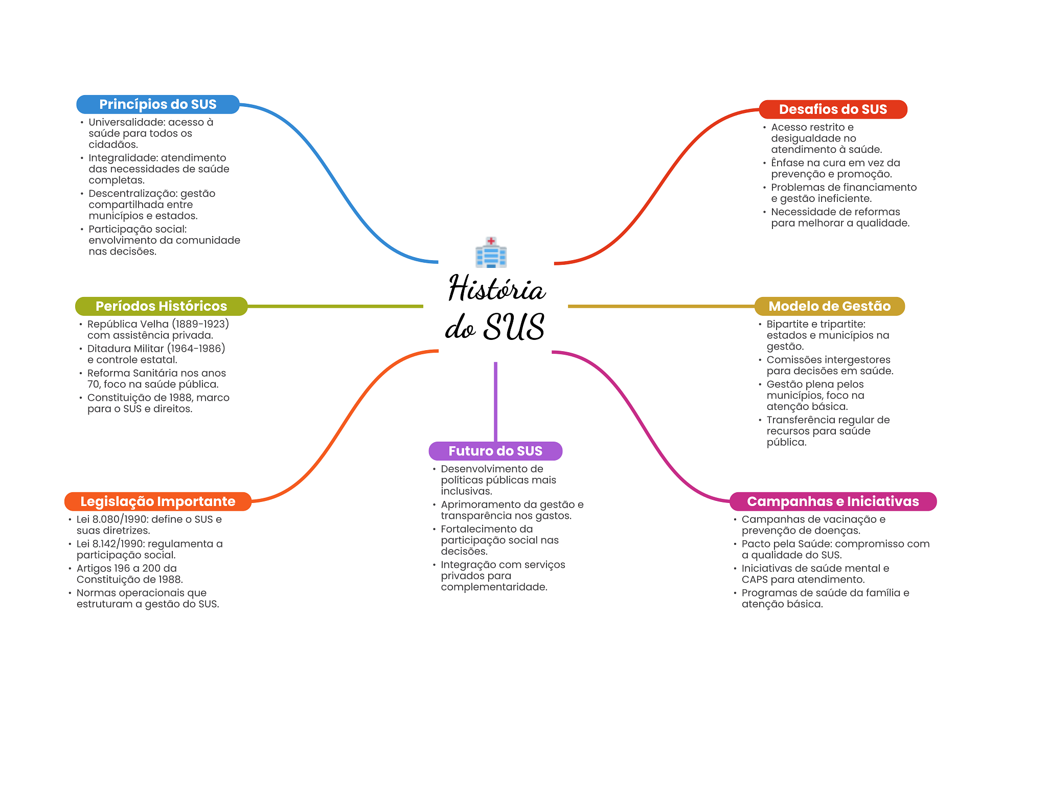 Princípios do SUS Desafios do SUS Universalidade: acesso à Acesso restrito e saúde para todos cidadãos. desigualdade no atendimento à saúde. Integralidade: atendimento Ênfase na cura em vez da das necessidades de saúde prevenção e promoção. completas. Problemas de financiamento Descentralização: gestão e gestão ineficiente. compartilhada entre municípios e estados. Necessidade de reformas para melhorar a qualidade. Participação social: envolvimento da comunidade nas decisões. História Períodos Históricos Modelo de Gestão República Velha (1889-1923) do SUS Bipartite e tripartite: com assistência privada. estados e municípios na Ditadura Militar (1964-1986) gestão. e controle estatal. Comissões intergestores Reforma Sanitária nos anos para decisões em saúde. 70, foco na saúde pública. Gestão plena pelos Constituição de 1988, marco municípios, foco na para SUS e direitos. atenção básica. Transferência regular de recursos para saúde pública. Futuro do Desenvolvimento de políticas públicas mais inclusivas. Legislação Importante Aprimoramento da gestão e Campanhas e Iniciativas Lei 8.080/1990: define SUS e transparência nos gastos. Campanhas de vacinação e suas diretrizes. Fortalecimento da prevenção de doenças. Lei 8.142/1990: regulamenta a participação social nas Pacto pela Saúde: compromisso com participação social. decisões. a qualidade do SUS. Artigos 196 a 200 da Integração com serviços Iniciativas de saúde mental e Constituição de 1988. privados para CAPS para atendimento. Normas operacionais que complementaridade. Programas de saúde da família e estruturam a gestão do SUS. atenção básica.