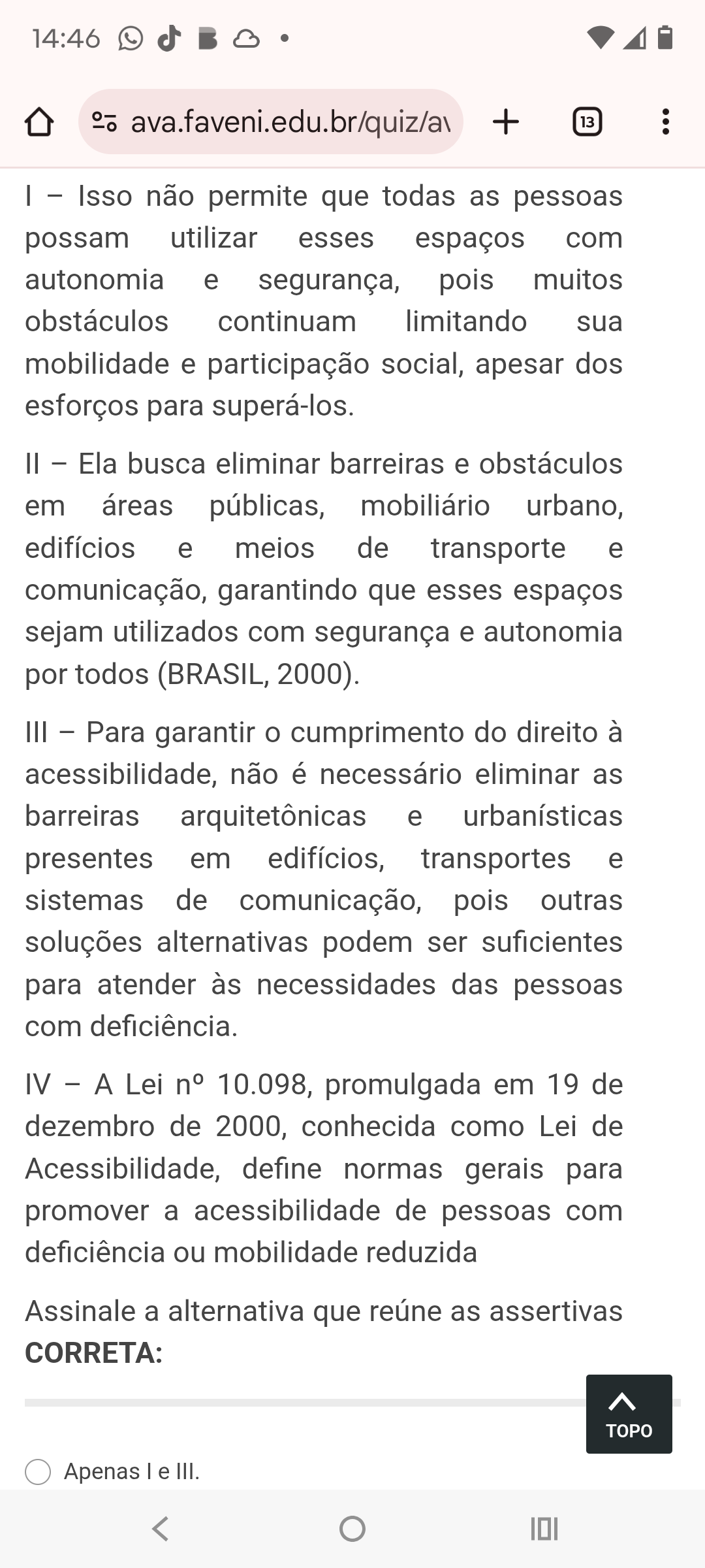 14:46 ava.faveni.edu.br/quiz/av + 13 - Isso não permite que todas as pessoas possam utilizar esses espaços com autonomia e segurança, pois muitos obstáculos continuam limitando sua mobilidade e participação social, apesar dos esforços para superá-los. - Ela busca eliminar barreiras e obstáculos em áreas públicas, mobiliário urbano, edifícios e meios de transporte e comunicação, garantindo que esses espaços sejam utilizados com segurança e autonomia por todos (BRASIL, 2000). III Para garantir cumprimento do direito à acessibilidade, não é necessário eliminar as barreiras arquitetônicas e urbanísticas presentes em edifícios, transportes e sistemas de comunicação, pois outras soluções alternativas podem ser suficientes para atender às necessidades das pessoas com deficiência. IV - A Lei n° 10.098, promulgada em 19 de dezembro de 2000, conhecida como Lei de Acessibilidade, define normas gerais para promover a acessibilidade de pessoas com deficiência ou mobilidade reduzida Assinale a alternativa que reúne as assertivas CORRETA: TOPO Apenas I e III.
