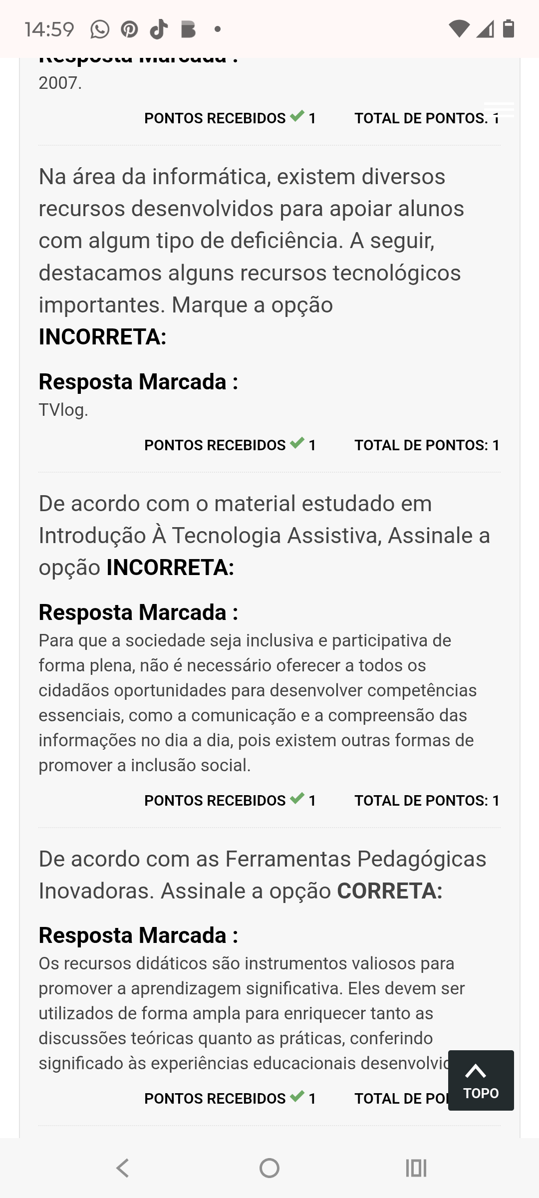 14:59 2007. PONTOS RECEBIDOS 1 TOTAL DE PONTOS. i Na área da informática, existem diversos recursos desenvolvidos para apoiar alunos com algum tipo de deficiência. A seguir, destacamos alguns recursos tecnológicos importantes. Marque a opção INCORRETA: Resposta Marcada : TVlog. PONTOS RECEBIDOS 1 TOTAL DE PONTOS: 1 De acordo com material estudado em Introdução À Tecnologia Assistiva, Assinale a opção INCORRETA: Resposta Marcada : Para que a sociedade seja inclusiva e participativa de forma plena, não é necessário oferecer a todos os cidadãos oportunidades para desenvolver competências essenciais, como a comunicação e a compreensão das informações no dia a dia, pois existem outras formas de promover a inclusão social. PONTOS RECEBIDOS 1 TOTAL DE PONTOS: 1 De acordo com as Ferramentas Pedagógicas Inovadoras. Assinale a opção CORRETA: Resposta Marcada : Os recursos didáticos são instrumentos valiosos para promover a aprendizagem significativa. Eles devem ser utilizados de forma ampla para enriquecer tanto as discussões teóricas quanto as práticas, conferindo significado às experiências educacionais PONTOS RECEBIDOS 1 TOTAL DE POI TOPO