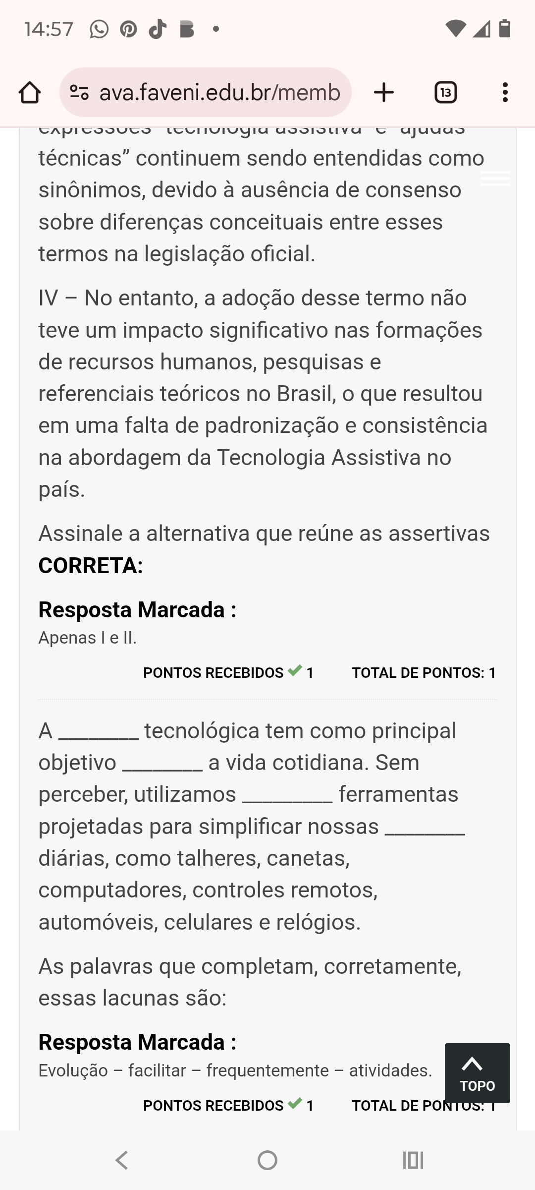14:57 ava.faveni.edu.br/memb + 13 técnicas" continuem sendo entendidas como sinônimos, devido à ausência de consenso sobre diferenças conceituais entre esses termos na legislação oficial. IV - No entanto, a adoção desse termo não teve um impacto significativo nas formações de recursos humanos, pesquisas e referenciais teóricos no Brasil, que resultou em uma falta de padronização e consistência na abordagem da Tecnologia Assistiva no país. Assinale a alternativa que reúne as assertivas CORRETA: Resposta Marcada : Apenas e II. PONTOS RECEBIDOS 1 TOTAL DE PONTOS: 1 A tecnológica tem como principal objetivo a vida cotidiana. Sem perceber, utilizamos ferramentas projetadas para simplificar nossas diárias, como talheres, canetas, computadores, controles remotos, automóveis, celulares e relógios. As palavras que completam, corretamente, essas lacunas são: Resposta Marcada : Evolução facilitar - frequentemente - atividades. TOPO PONTOS RECEBIDOS 1 TOTAL DE