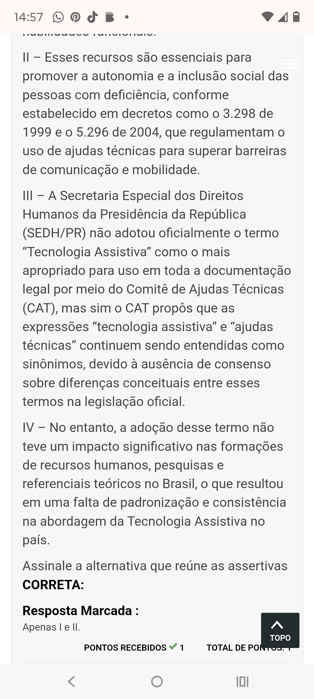 14:57 - Esses recursos são essenciais para promover a autonomia e a inclusão social das pessoas com deficiência, conforme estabelecido em decretos como 3.298 de 1999 e 5.296 de 2004, que regulamentam uso de ajudas técnicas para superar barreiras de comunicação e mobilidade. III - A Secretaria Especial dos Direitos Humanos da Presidência da República (SEDH/PR) não adotou oficialmente termo "Tecnologia Assistiva" como mais apropriado para uso em toda a documentação legal por meio do Comitê de Ajudas Técnicas (CAT), mas sim CAT propôs que as expressões "tecnologia assistiva" e "ajudas técnicas" continuem sendo entendidas como sinônimos, devido à ausência de consenso sobre diferenças conceituais entre esses termos na legislação oficial. IV No entanto, a adoção desse termo não teve um impacto significativo nas formações de recursos humanos, pesquisas e referenciais teóricos no Brasil, que resultou em uma falta de padronização e consistência na abordagem da Tecnologia Assistiva no país. Assinale a alternativa que reúne as assertivas CORRETA: Resposta Marcada : Apenas I e II. TOPO PONTOS RECEBIDOS 1 TOTAL DE