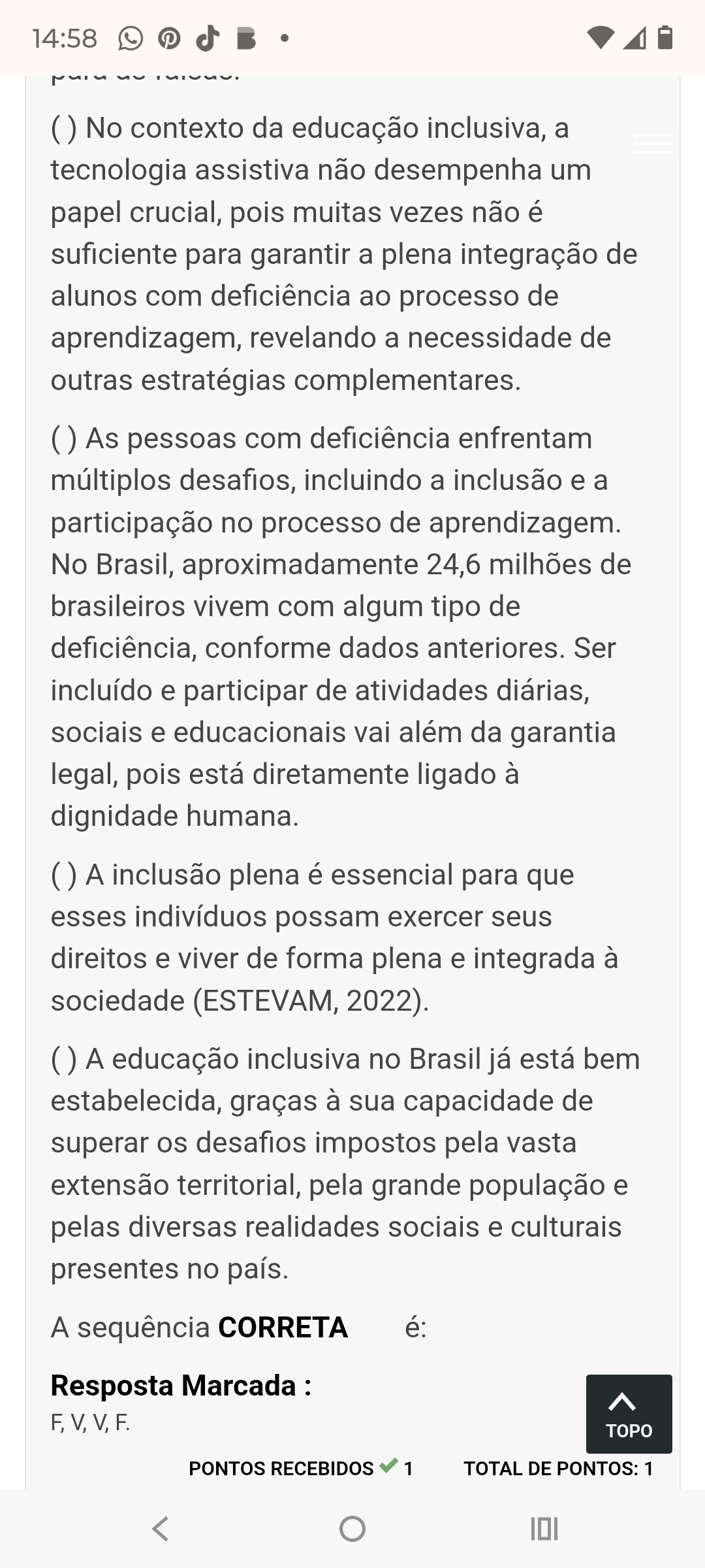 14:58 () No contexto da educação inclusiva, a tecnologia assistiva não desempenha um papel crucial, pois muitas vezes não é suficiente para garantir a plena integração de alunos com deficiência ao processo de aprendizagem, revelando a necessidade de outras estratégias complementares. () As pessoas com deficiência enfrentam múltiplos desafios, incluindo a inclusão e a participação no processo de aprendizagem. No Brasil, aproximadamente 24,6 milhões de brasileiros vivem com algum tipo de deficiência, conforme dados anteriores. Ser incluído e participar de atividades diárias, sociais e educacionais vai além da garantia legal, pois está diretamente ligado à dignidade humana. () A inclusão plena é essencial para que esses indivíduos possam exercer seus direitos e viver de forma plena e integrada à sociedade (ESTEVAM, 2022). () A educação inclusiva no Brasil já está bem estabelecida, graças à sua capacidade de superar os desafios impostos pela vasta extensão territorial, pela grande população e pelas diversas realidades sociais e culturais presentes no país. A sequência CORRETA é: Resposta Marcada : TOPO PONTOS RECEBIDOS 1 TOTAL DE PONTOS: 1