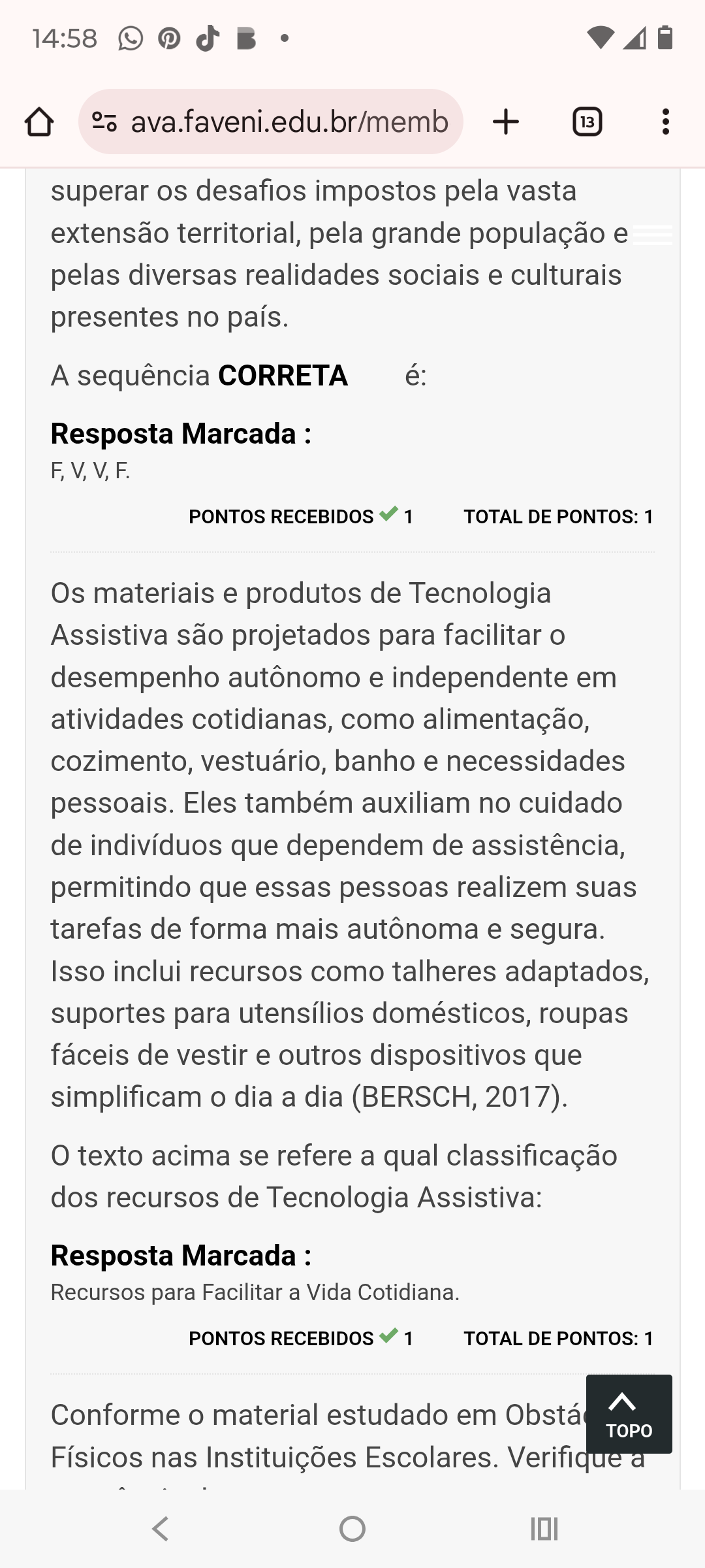 14:58 ava.faveni.edu.br/memb + 13 superar os desafios impostos pela vasta extensão territorial, pela grande população e pelas diversas realidades sociais e culturais presentes no país. A sequência CORRETA é: Resposta Marcada : PONTOS RECEBIDOS 1 TOTAL DE PONTOS: 1 Os materiais e produtos de Tecnologia Assistiva são projetados para facilitar desempenho autônomo e independente em atividades cotidianas, como alimentação, cozimento, vestuário, banho e necessidades pessoais. Eles também auxiliam no cuidado de indivíduos que dependem de assistência, permitindo que essas pessoas realizem suas tarefas de forma mais autônoma e segura. Isso inclui recursos como talheres adaptados, suportes para utensílios domésticos, roupas fáceis de vestir e outros dispositivos que simplificam dia a dia (BERSCH, 2017). texto acima se refere a qual classificação dos recursos de Tecnologia Assistiva: Resposta Marcada : Recursos para Facilitar a Vida Cotidiana. PONTOS RECEBIDOS 1 TOTAL DE PONTOS: 1 Conforme material estudado em Obstá TOPO Físicos nas Instituições Escolares. Verifique a