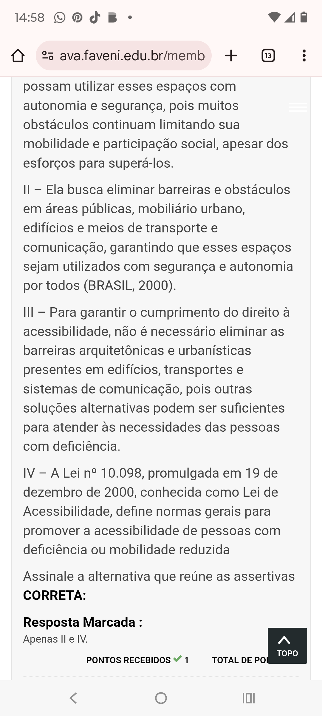 14:58 ava.faveni.edu.br/memb + 13 possam utilizar esses espaços com autonomia e segurança, pois muitos obstáculos continuam limitando sua mobilidade e participação social, apesar dos esforços para superá-los. - Ela busca eliminar barreiras e obstáculos em áreas públicas, mobiliário urbano, edifícios e meios de transporte e comunicação, garantindo que esses espaços sejam utilizados com segurança e autonomia por todos (BRASIL, 2000). III - Para garantir cumprimento do direito à acessibilidade, não é necessário eliminar as barreiras arquitetônicas e urbanísticas presentes em edifícios, transportes e sistemas de comunicação, pois outras soluções alternativas podem ser suficientes para atender às necessidades das pessoas com deficiência. IV - A Lei n° 10.098, promulgada em 19 de dezembro de 2000, conhecida como Lei de Acessibilidade, define normas gerais para promover a acessibilidade de pessoas com deficiência ou mobilidade reduzida Assinale a alternativa que reúne as assertivas CORRETA: Resposta Marcada : Apenas e IV. TOPO PONTOS RECEBIDOS 1 TOTAL DE PO