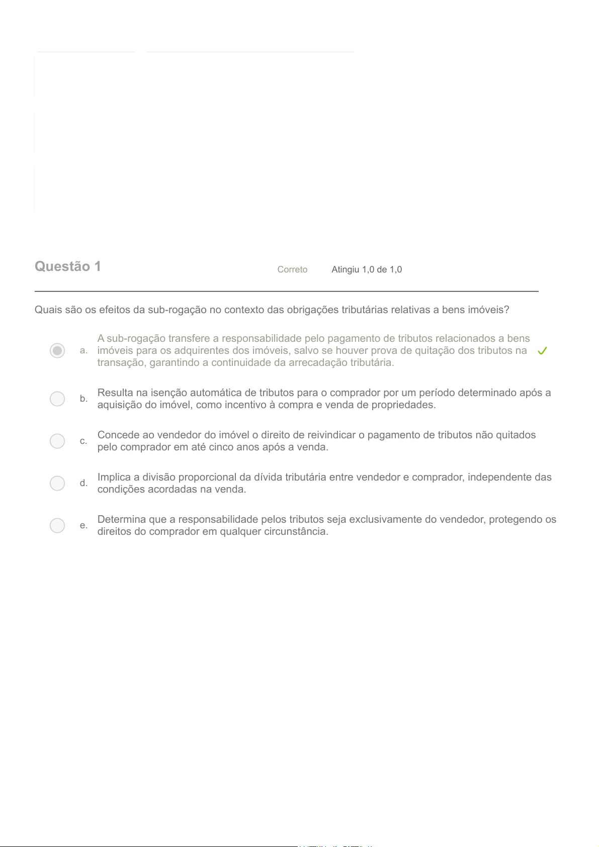 Questão 1 Correto Atingiu 1,0 de 1,0 Quais são os efeitos da sub-rogação no contexto das obrigações tributárias relativas a bens imóveis? a. A sub-rogação transfere a responsabilidade pelo pagamento de tributos relacionados a bens imóveis para os adquirentes dos imóveis, salvo se houver prova de quitação dos tributos na transação, garantindo a continuidade da arrecadação tributária. b. Resulta na isenção automática de tributos para o comprador por um período determinado após a aquisição do imóvel, como incentivo à compra e venda de propriedades. c. Concede ao vendedor do imóvel o direito de reivindicar o pagamento de tributos não quitados pelo comprador em até cinco anos após a venda. d. Implica a divisão proporcional da dívida tributária entre vendedor e comprador, independente das condições acordadas na venda. e. Determina que a responsabilidade pelos tributos seja exclusivamente do vendedor, protegendo os direitos do comprador em qualquer circunstância. 05/01/2026, 15:35 AF | Responsabilidade Tributária: Revisão da tentativa | AVA https://ava.cenes.com.br/mod/quiz/review.php?attempt=810201&cmid=10867 1/6 Questão 2 Correto Atingiu 1,0 de 1,0 Quais são os limites constitucionais ao poder de tributar estabelecidos pela Constituição Federal de 1988 para proteger o contribuinte? a. Enfatiza a autonomia dos municípios na determinação de suas políticas tributárias, sem estabelecer limites constitucionais claros ao poder de tributar dos demais entes federativos. b. Restringe-se apenas à exigência de lei específica para a criação de novos tributos, sem abranger princípios como igualdade ou vedação ao efeito de confisco. c. Limita o poder de tributar à capacidade econômica do contribuinte, sem impor outras restrições expressas quanto à forma ou ao conteúdo da legislação tributária. d. Permite apenas a criação de tributos que sejam diretamente proporcionais ao uso de serviços públicos pelo contribuinte, sem considerar a proteção contra tributação excessiva. e. Os limites ao poder de tributar incluem a proibição de exigir ou aumentar tributos sem lei que o estabeleça, instituir tratamento desigual entre contribuintes em situação equivalente, utilizar tributos com efeito de confisco, e instituir impostos sobre patrimônio, renda ou serviços de entidades específicas como templos de qualquer culto e instituições de educação sem fins lucrativos. Questão 3 Correto Atingiu 1,0 de 1,0 Qual o efeito da denúncia espontânea na responsabilidade por infrações tributárias, conforme estabelecido no Código Tributário Nacional? a. Concede imunidade tributária por um período determinado subsequente à denúncia, como incentivo à regularização fiscal voluntária. b. A denúncia espontânea da infração, acompanhada do pagamento do tributo devido e dos juros de mora, ou do depósito da importância arbitrada pela autoridade administrativa, exclui a responsabilidade por penalidades pecuniárias. c. Permite a negociação direta de dívidas tributárias com redução automática de até 50% do valor original, sem análise da autoridade fazendária. d. Oferece ao contribuinte a possibilidade de substituir integralmente o pagamento do tributo por serviços comunitários. e. Autoriza o parcelamento do débito tributário em até 120 meses, sem necessidade de pagamento de juros e multas. 05/01/2026, 15:35 AF | Responsabilidade Tributária: Revisão da tentativa | AVA https://ava.cenes.com.br/mod/quiz/review.php?attempt=810201&cmid=10867 2/6 Questão 4 Correto Atingiu 1,0 de 1,0 Quais são as consequências da responsabilidade por excesso de poderes ou infração de lei, contrato social ou estatutos pelos administradores de pessoas jurídicas? a. Resultam na suspensão temporária da capacidade de atuar como administrador de qualquer pessoa jurídica, sem afetar as responsabilidades tributárias. b. Implicam apenas em multas corporativas, sendo os administradores protegidos contra responsabilidades tributárias pessoais por ações realizadas em nome da pessoa jurídica. c. Conduzem automaticamente à isenção da pessoa jurídica de responsabilidades tributárias relacionadas, transferindo todas as obrigações para o administrador individual. d. As consequências são limitadas a sanções administrativas internas, sem impacto nas obrigações tributárias da pessoa jurídica perante o fisco. e. Os administradores tornam-se pessoalmente responsáveis pelos créditos tributários decorrentes dessas ações, visando assegurar a conformidade fiscal das entidades que representam. Questão 5 Correto Atingiu 1,0 de 1,0 Quais são os princípios constitucionais tributários que delimitam o poder de tributar do Estado? a. Baseiam-se exclusivamente no princípio da capacidade contributiva, sem considerar outros aspectos constitucionais na determinação da carga tributária. b. Restringem-se ao princípio da legalidade e da anterioridade, permitindo ao Estado ampla liberdade na definição de alíquotas e bases de cálculo. c. Os princípios constitucionais tributários incluem a legalidade, isonomia, irretroatividade, anterioridade, capacidade contributiva, vedação ao confisco, uniformidade geográfica, e não-diferenciação tributária baseada em procedência ou destino. d. Focam-se na vedação à instituição de impostos sobre templos de qualquer culto, sem delinear outros limites ao poder de tributar. e. Confinam-se à proibição de tributos com efeito de confisco, deixando outros aspectos da tributação à discricionariedade do legislador. 05/01/2026, 15:35 AF | Responsabilidade Tributária: Revisão da tentativa | AVA https://ava.cenes.com.br/mod/quiz/review.php?attempt=810201&cmid=10867 3/6 Questão 6 Correto Atingiu 1,0 de 1,0 O que determina a exclusão da responsabilidade por penalidades decorrentes de infrações tributárias, conforme o Código Tributário Nacional? a. É aplicável somente para contribuintes que