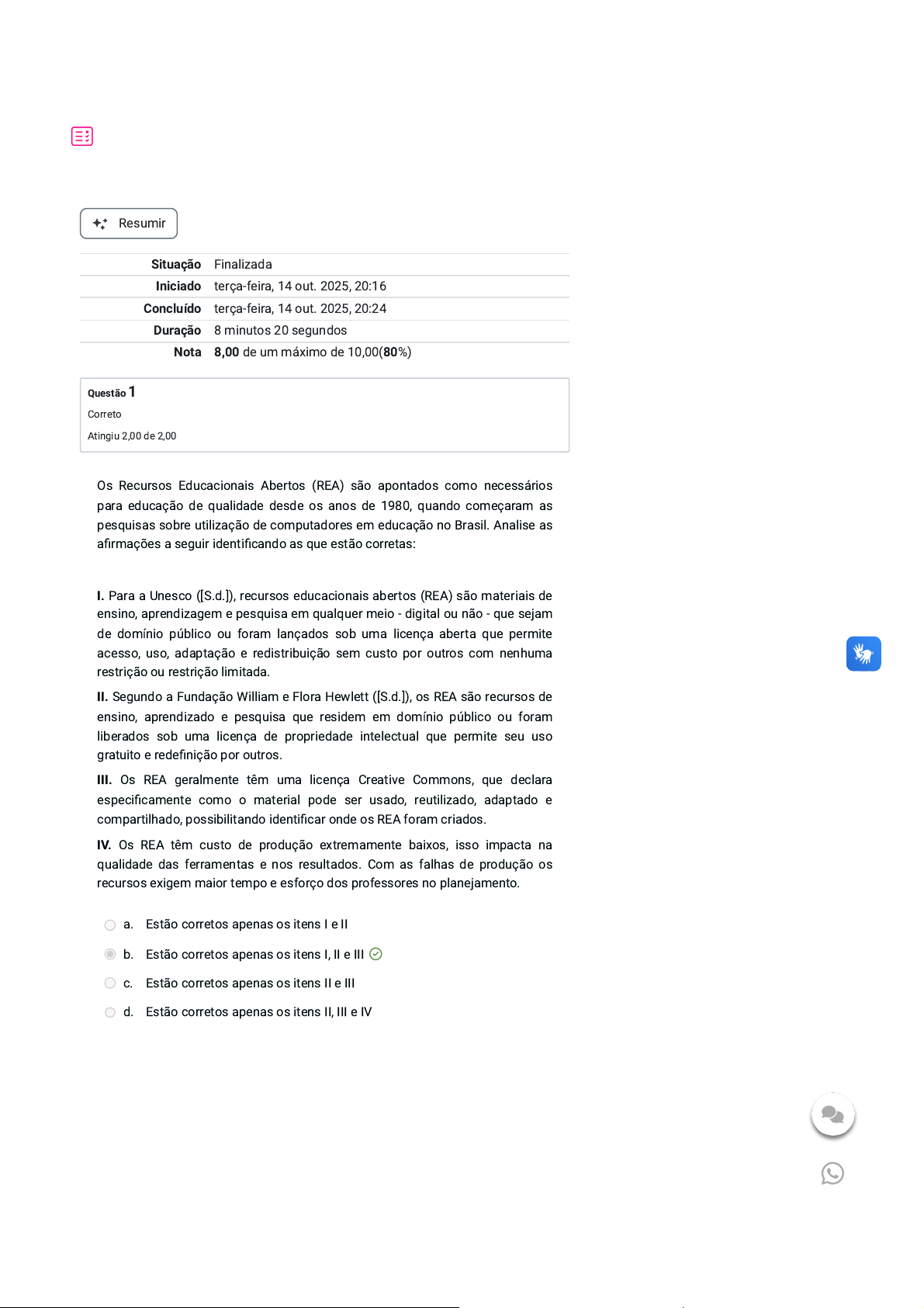 Resumir Situação Finalizada Iniciado terça-feira, 14 out. 2025, 20:16 Concluído terça-feira, 14 out. 2025, 20:24 Duração 8 minutos 20 segundos Nota 8,00 de um máximo de 10,00(80%) Questão 1 Correto Atingiu 2,00 de 2,00 Os Recursos Educacionais Abertos (REA) são apontados como necessários para educação de qualidade desde os anos de 1980, quando começaram as pesquisas sobre utilização de computadores em educação no Brasil. Analise as afirmações a seguir identificando as que estão corretas: I. Para a Unesco ([S.d.]), recursos educacionais abertos (REA) são materiais de ensino, aprendizagem e pesquisa em qualquer meio - digital ou não - que sejam de domínio público ou foram lançados sob uma licença aberta que permite acesso, uso, adaptação e redistribuição sem custo por outros com nenhuma restrição ou restrição limitada. II. Segundo a Fundação William e Flora Hewlett ([S.d.]), os REA são recursos de ensino, aprendizado e pesquisa que residem em domínio público ou foram liberados sob uma licença de propriedade intelectual que permite seu uso gratuito e redefinição por outros. III. Os REA geralmente têm uma licença Creative Commons, que declara especificamente como o material pode ser usado, reutilizado, adaptado e compartilhado, possibilitando identificar onde os REA foram criados. IV. Os REA têm custo de produção extremamente baixos, isso impacta na qualidade das ferramentas e nos resultados. Com as falhas de produção os recursos exigem maior tempo e esforço dos professores no planejamento. a. Estão corretos apenas os itens I e II b. Estão corretos apenas os itens I, II e III c. Estão corretos apenas os itens II e III d. Estão corretos apenas os itens II, III e IV https://whatsa.me/5533988894455/?t=Ol%C3%A1,%20tenho%20d%C3%BAvidas.... Questão 2 Correto Atingiu 2,00 de 2,00 Questão 3 Incorreto Atingiu 0,00 de 2,00 O relatório Innovating Pedagogy (2021) apresenta diversas tendências para formação dos professores vinculadas às novas tecnologias, dentre elas está a Aprendizagem baseada em evidências e a Pedagogia baseada em corpus. Considerando os estudos da disciplina é correto afirmar que: a. A formação de docentes com enfoque na Aprendizagem baseada em evidências exige professores com formação de doutorado em educação. b. A aprendizagem baseada em corpus pode ser considerada uma base da pesquisa de corpus celestes que orientam as vivências docentes e as ações pedagógicas. c. Tendo como referência a Aprendizagem baseada em evidências Chinn; Barzilai; Duncan (2020) indicam três componentes que a educação atual deve ter: pragmatismo, pedagogia baseada em corpus e ambientes digitais. d. Segundo Wallus e Nelson (2001) a linguística de corpus tenta obter conhecimento por meio da análise de coleções de amostras de textos que ocorrem naturalmente ou de gravações transcritas. Metodologias ativas têm relação com conceito que busca renovar o ensino tradicional. Na da disciplina foram apresentados alguns exemplos desta proposta. Assinale a alternativa a seguir que descreve um destes exemplos corretamente: a. Rotação de estações, como o nome diz, é aquela na qual ao longo do ano, a cada nova estação, a estratégia pedagógica se altera, levando os alunos a se envolverem na pesquisa climática, abrangendo as disciplinas curriculares de geografia, história, matemática e ciências. b. Flipped Classroom, ou sala de aula invertida, é aquela na qual os alunos assumem o lugar do professor e desenvolvem aulas expositivas, cada um a seu tempo, individualmente ou em equipe. O professor assiste as aulas e avalia a atuação dos alunos. c. Para Valença e Tostes (2019), o storytelling é uma prática dentro da sala de aula, com o professor, existem as atividades colaborativas e interativas de resolução de problemas e práticas de consolidação são realizadas. Assim, existe a possibilidade de ter mais atividade na aula, internalizando os conteúdos por meio de uma ampla gama de tarefas em sala de aula. d. Segundo Fregelli (2017) a metodologia 300 é aquela na qual os estudantes se ajudam mutuamente por meio de grupos potencialmente colaborativos e metas cuidadosamente planejadas, posteriormente avaliadas por grupos mistos de alunos. A cada nova avaliação de aprendizagem, novos grupos são formados e novas metas são formuladas. https://whatsa.me/5533988894455/?t=Ol%C3%A1,%20tenho%20d%C3%BAvidas.... Questão 4 Correto Atingiu 2,00 de 2,00 Aprendizagens significativas são aquelas que promovem impacto cognitivo- emocional a ponto de criar memórias nas ações futuras do sujeito, além de trazer significado particular ao conjunto de experiências dele, o que, no contexto social atual depende muito de recursos digitais. Tendo em conta os estudos da disciplina, no tema Práticas significativas, assinale com V as afirmações verdadeiras e com F as falsas: I. ( ) As práticas e cultura digital na sociedade modificam os espaços e tempos educacionais, assim a formação de professores para promover aprendizagens significativas precisa incorporar contextos digitais. II. ( ) A formação dos professores para contextos digitais é conquistada mediante a criação de um ambiente que encoraje o uso de ferramentas como organizadores avançados para preparar e ativar o conhecimento prévio específico. III. ( ) A formação de professores com ambientes digitais leva a entender e interpretar as novas informações em diferentes contextos, situações e práticas educativas cotidianas, tanto sociais quanto na comunidade, permitindo que promovam práticas significativas para seus alunos. IV. ( ) As bases formativas para práticas significativas com uso de tecnologia são: o pensamento crítico; a resolução de problemas; e a colaboração e comunicação eficaz. V. ( ) Os estudos demonstram que a capacidade de inovação não pode ser conquistada através de propostas como a aprendizagem significativa. Agora, assinale a alternat