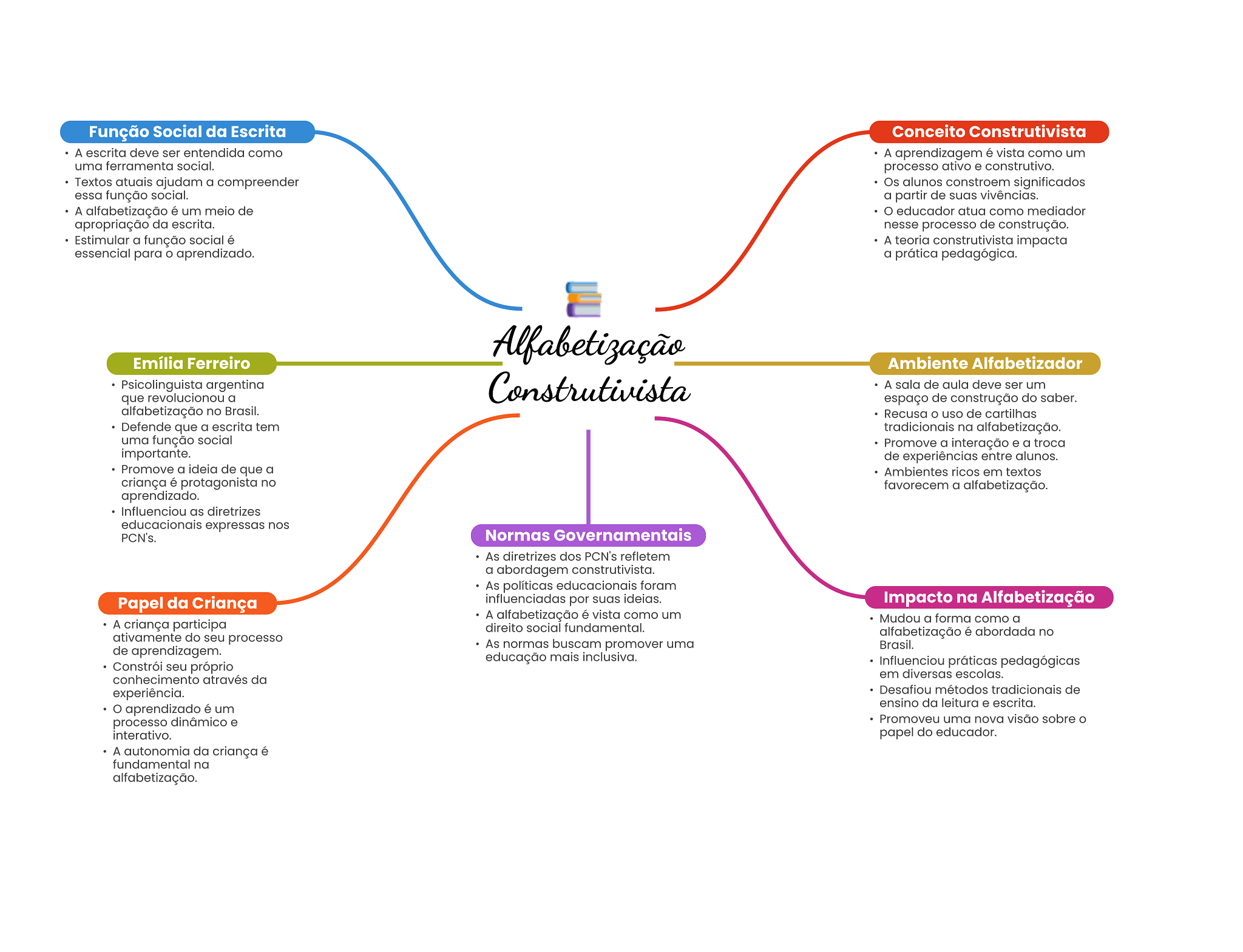 Função Social da Escrita Conceito Construtivista A escrita deve ser entendida como A aprendizagem é vista como um uma ferramenta social. processo ativo e construtivo. Textos atuais ajudam a compreender Os alunos constroem significados essa função social. a partir de suas vivências. A alfabetização é um meio de educador atua como mediador apropriação da escrita. nesse processo de construção. Estimular a função social é A teoria construtivista impacta essencial para aprendizado. a prática pedagógica. Alfabetização Emília Ferreiro Ambiente Alfabetizador Psicolinguista argentina Construtivista A sala de aula deve ser um que revolucionou a espaço de construção do saber. alfabetização no Brasil. Recusa O uso de cartilhas Defende que a escrita tem tradicionais na alfabetização. uma função social Promove a interação e a troca importante. de experiências entre alunos. Promove a ideia de que a Ambientes ricos em textos criança é protagonista no favorecem a alfabetização. aprendizado. Influenciou as diretrizes educacionais expressas nos PCN's. Normas Governamentais As diretrizes dos PCN's refletem a abordagem construtivista. As políticas educacionais foram Papel da Criança influenciadas por suas ideias. Impacto na Alfabetização A alfabetização é vista como um Mudou a forma como a A criança participa direito social fundamental. ativamente do seu processo alfabetização é abordada no de aprendizagem. As normas buscam promover uma Brasil. educação mais inclusiva. Constrói seu próprio Influenciou práticas pedagógicas conhecimento através da em diversas escolas. experiência. Desafiou métodos tradicionais de ensino da leitura e escrita. aprendizado é um processo dinâmico e Promoveu uma nova visão sobre interativo. papel do educador. A autonomia da criança é fundamental na alfabetização.