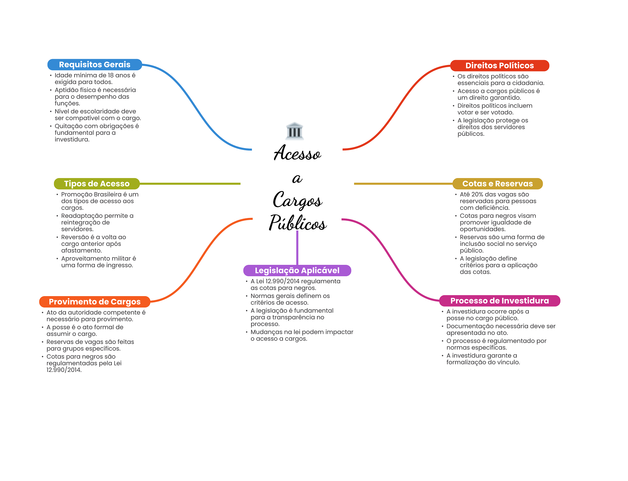 Requisitos Gerais Direitos Políticos Idade mínima de 18 anos é Os direitos políticos são exigida para todos. essenciais para a cidadania. Aptidão física é necessária Acesso a cargos públicos é para desempenho das um direito garantido. funções. Direitos políticos incluem Nível de escolaridade deve votar e ser votado. ser compatível com cargo. A legislação protege os Quitação com obrigações é direitos dos servidores fundamental para a públicos. investidura. Acesso a Tipos de Acesso Cotas e Reservas Promoção Brasileira é um Cargos Até 20% das vagas são dos tipos de acesso aos reservadas para pessoas cargos. com deficiência. Readaptação permite a reintegração de Públicos Cotas para negros visam promover igualdade de servidores. oportunidades. Reversão é a volta ao Reservas são uma forma de cargo anterior após inclusão social no serviço afastamento. público. Aproveitamento militar é A legislação define uma forma de ingresso. critérios para a aplicação Legislação Aplicável das cotas. A Lei 12.990/2014 regulamenta as cotas para negros. Normas gerais definem Provimento de Cargos critérios de acesso. Processo de Investidura Ato da autoridade competente é A legislação é fundamental A investidura ocorre após a necessário para provimento. para a transparência no posse no cargo público. A posse é o ato formal de processo. Documentação necessária deve ser assumir o cargo. Mudanças na lei podem impactar apresentada no ato. Reservas de vagas são feitas acesso a cargos. O processo é regulamentado por para grupos específicos. normas específicas. Cotas para negros são A investidura garante a regulamentadas pela Lei formalização do vínculo. 12.990/2014.