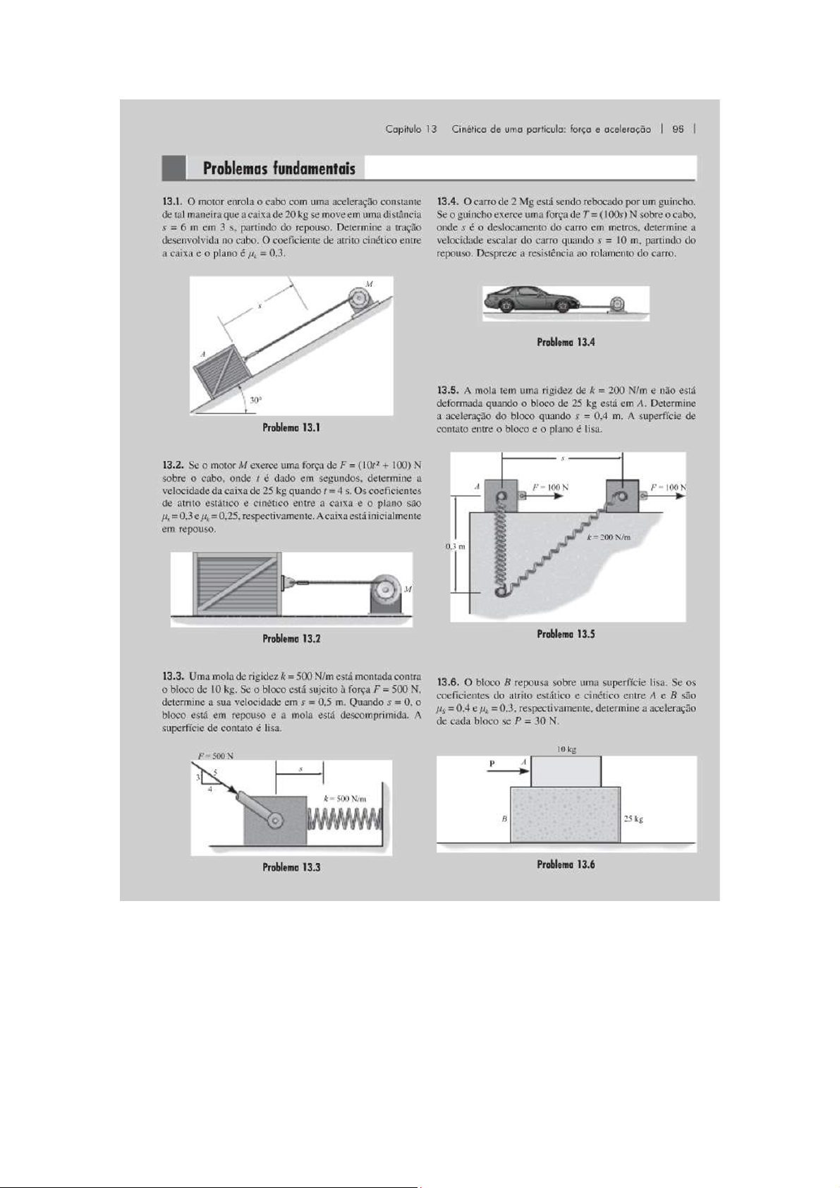 Capitulo 13 Cinética de uma particula: força e aceleração 95 Problemas fundamentais 13.1. motor enrola cabo com uma aceleração constante 13.4. carro de 2 Mg está sendo rebocado por um guincho. de tal maneira que a caixa de 20 kg se move em uma distância Se o guincho exerce uma força de T = (100s) N sobre cabo, = 6 m em 3 partindo do repouso. Determine a tração onde é deslocamento do carro em metros, determine a desenvolvida no cabo. coeficiente de atrito cinético entre velocidade escalar do carro quando = 10 m. partindo do a caixa e o plano é 14 = repouso. Despreze a resistência ao rolamento do carro. M Problema 13.4 A 13.5. A mola tem uma rigidez de k = 200 N/m e não está 30° deformada quando o bloco de 25 kg está em A. Determine a aceleração do bloco quando = 0.4 m. A superfície de Problema 13.1 contato entre bloco e plano é lisa. 13.2. Se o motor M exerce uma força de F = + 100) N sobre cabo, onde é dado em determine a velocidade da caixa de 25 kg quando = 4 S. Os coeficientes F=100N de atrito estático e cinético entre a caixa e o plano são e respectivamente. A caixa está inicialmente em repouso. 200 N/m m M Problema 13.2 Problema 13.5 13.3. Uma mola de rigidez k = 500 N/m está montada contra 13.6. bloco B repousa sobre uma lisa. Se os bloco de 10 kg. Se o bloco está sujeito à força F = 500 coeficientes do atrito estático e cinético entre A e B são determine a sua velocidade em = m. Quando = = e = 0.3. respectivamente, determine a aceleração bloco está em repouso e a mola está descomprimida. A de cada bloco se P = 30 N. superfície de contato é lisa. 10 kg P 3 4 500 N/m B 25 kg Problema 13.3 Problema 13.6