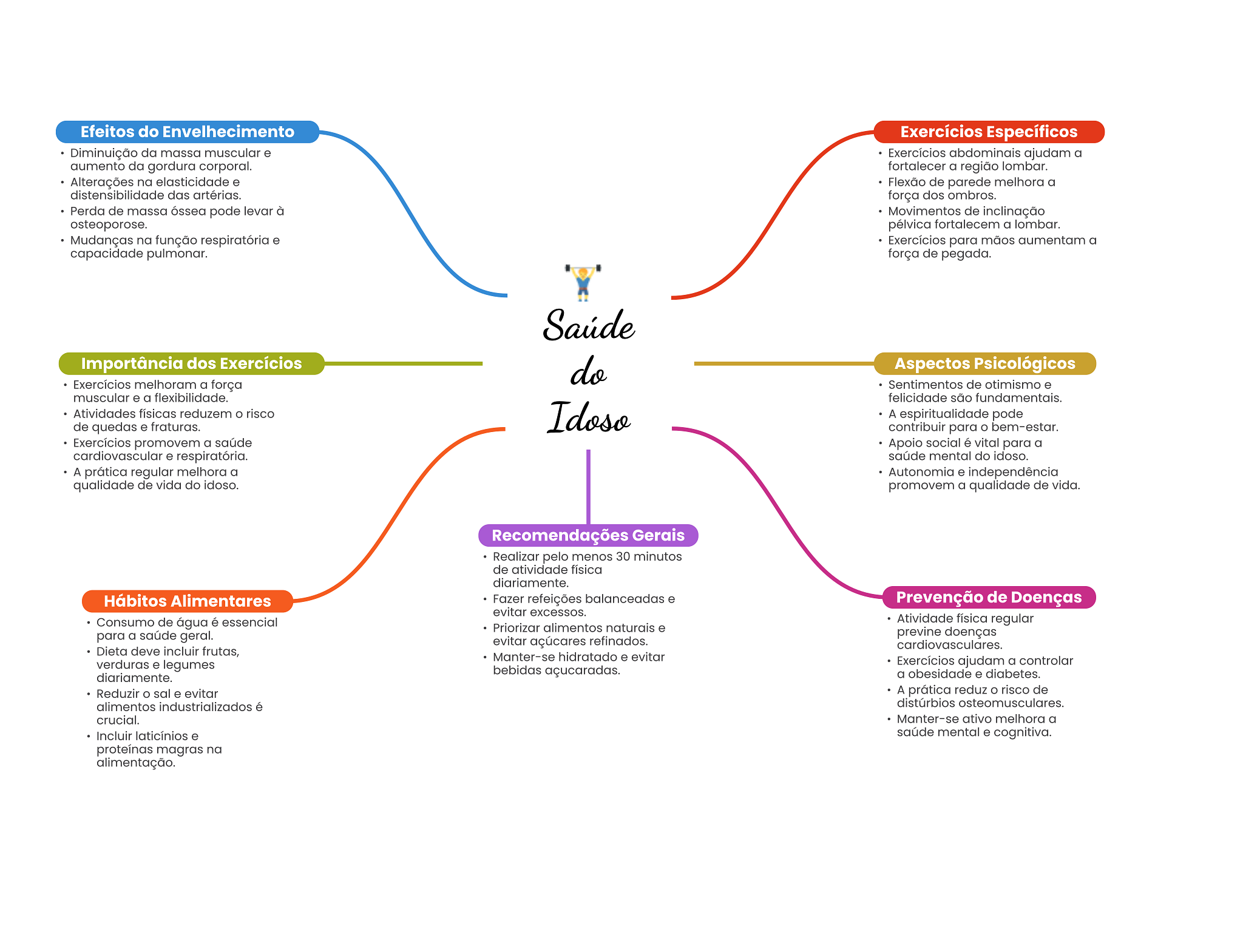 Efeitos do Envelhecimento Exercícios Específicos Diminuição da massa muscular e Exercícios abdominais ajudam a aumento da gordura corporal. fortalecer a região lombar. Alterações na elasticidade e Flexão de parede melhora a distensibilidade das artérias. força dos ombros. Perda de massa óssea pode levar à Movimentos de inclinação osteoporose. pélvica fortalecem a lombar. Mudanças na função respiratória e Exercícios para mãos aumentam a capacidade pulmonar. força de pegada. Saúde Importância dos Exercícios do Aspectos Psicológicos Exercícios melhoram a força Sentimentos de otimismo e muscular e a flexibilidade. felicidade são fundamentais. Atividades físicas reduzem risco Idoso A espiritualidade pode de quedas e fraturas. contribuir para bem-estar. Exercícios promovem a saúde Apoio social é vital para a cardiovascular e respiratória. saúde mental do idoso. A prática regular melhora a Autonomia e independência qualidade de vida do idoso. promovem a qualidade de vida. Recomendações Gerais Realizar pelo menos 30 minutos de atividade física diariamente. Hábitos Alimentares Fazer refeições balanceadas e Prevenção de Doenças evitar excessos. Consumo de água é essencial Atividade física regular Priorizar alimentos naturais e para a saúde geral. previne doenças evitar açúcares refinados. cardiovasculares. Dieta deve incluir frutas, Manter-se hidratado e evitar verduras e legumes Exercícios ajudam a controlar diariamente. bebidas açucaradas. a obesidade e diabetes. Reduzir sal e evitar A prática reduz risco de alimentos industrializados é distúrbios osteomusculares. crucial. Manter-se ativo melhora a Incluir laticínios e saúde mental e cognitiva. proteínas magras na alimentação.