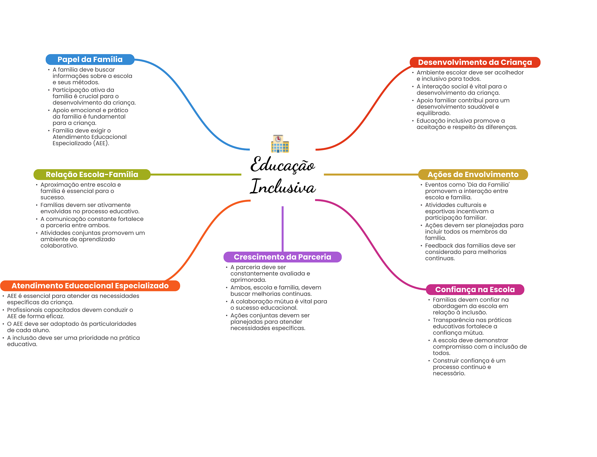 Papel da Família Desenvolvimento da Criança A família deve buscar Ambiente escolar deve ser acolhedor informações sobre a escola e seus métodos. e inclusivo para todos. Participação ativa da A interação social é vital para família é crucial para desenvolvimento da criança. desenvolvimento da criança. Apoio familiar contribui para um desenvolvimento saudável e Apoio emocional e prático da família é fundamental equilibrado. para a criança. Educação inclusiva promove a Família deve exigir aceitação e respeito às diferenças. Atendimento Educacional Especializado (AEE). Educação Relação Escola-Família Ações de Envolvimento Aproximação entre escola e Inclusiva Eventos como 'Dia da família é essencial para promovem a interação entre sucesso. escola e família. Famílias devem ser ativamente Atividades culturais e envolvidas no processo educativo. esportivas incentivam a A comunicação constante fortalece participação familiar. a parceria entre ambos. Ações devem ser planejadas para Atividades conjuntas promovem um incluir todos membros da ambiente de aprendizado família. colaborativo. Feedback das famílias deve ser considerado para melhorias Crescimento da Parceria contínuas. A parceria deve ser constantemente avaliada e aprimorada. Atendimento Educacional Especializado Ambos, escola e família, devem AEE é essencial para atender as necessidades buscar melhorias contínuas. Confiança na Escola específicas da criança. A colaboração mútua é vital para Famílias devem confiar na Profissionais capacitados devem conduzir sucesso educacional. abordagem da escola em Ações conjuntas devem ser relação à inclusão. AEE de forma eficaz. planejadas para atender Transparência nas práticas AEE deve ser adaptado às particularidades de cada aluno. necessidades específicas. educativas fortalece a confiança mútua. A inclusão deve ser uma prioridade na prática A escola deve demonstrar educativa. compromisso com a inclusão de todos. Construir confiança é um processo e necessário.