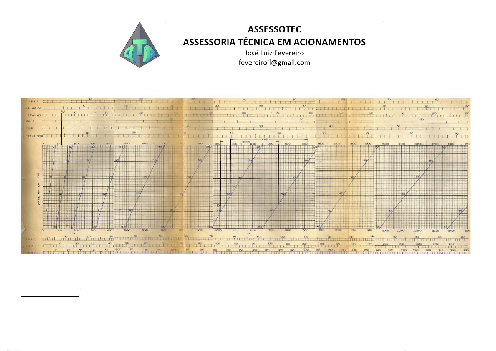 ABACO PARA DETERMINAR FORÇA DE TREFILAÇÃO E DIMENSÕES FINAIS DE TUBOS OU VERGALHÕES DE PERFIL REDONDO MEDIANTE PORCENTAGEM PRE DETERMINADA O ábaco com instruções de uso foi copiado de Drawing Mill Machine Co. Esse método de cálculo foi utilizado muitos anos pelo técnico de uma conhecida indústria de radiadores. EXEMPLO Determinar a capacidade da máquina e diâmetro final para redução de 25% em um tubo de latão 63, diâmetro externo 44mm e diâmetro interno 37mm o qual deverá ficar com diâmetro interno 36mm Traçando 2 linhas verticais A e B nos pontos das curvas 44 e 37, obtém-se os valores 1520 e 1075. Efetuando a subtração entre eles obtém-se 445. Para obter a força de tração. Com o valor de 25% (redução) de 445 ou seja, 111,25, traçar a linha C até a faixa do latão 63 onde obtém-se a força de 5,4 toneladas. Para obter o diâmetro final, tire 25% de 445 que resulta 333,75. Em seguida, traçando uma linha vertical D no diâmetro 36 obtém-se o valor 1018 que deve ser somado com 333,75 resultando 1351,75. Onde a linha vertical E, traçada a partir deste valor, cruzar com a curva, obter-se-a o diâmetro final 41,53mm Os valores obtidos são baseados em condições normais de lubrificação, decapagem e fieira e para materiais recozidos. Uma melhora nesses fatores poderá baixar até 16% a força de tração. Mas caso tenham sofrido uma ou mais passadas sem recozimento a força irá aumentar 10% por passada. Análise do ábaco com relação ao cálculo da força de tração para trefilar o tubo 333,75 A B D E C No exemplo acima, os valores 1520 e 1075, correspondem a área em mm² dos diâmetros de 44 e 37mm. A diferença entre as áreas (445mm²) é o que realmente importa para calcular a força de tração necessária para a trefilação. Porém, na redução de diâmetro do tubo de 25%, somente a área de 111,25mm² resistirá a força de tração exercida pelo conjunto motor redutor. Então, aplicando a fórmula adequada e considerando a tensão de ruptura do material conforme tabela da Termomecânica: Limite de resistência a tração do latão 63 ½ duro – 370MPa ou 37,7 kgf/mm². Cada mm² suporta 37,7 kgf. Então a área de 111,25mm² resistirá 𝐹 = 𝐴 ∗ 𝜎𝑟 = 111,25𝑚𝑚 ∗ 37,7𝑘𝑔𝑓 𝑚𝑚2 = 4194𝑘𝑔𝑓 Mas tem outro fator resistente ao movimento, que é o atrito de escorregamento entre a parede externa do tubo e a fieira. Conforme tabela abaixo, esse valor varia de 0,35 para atrito estático sem lubrificação a 0,18 com lubrificação. No nosso caso, para calcular a força de atrito, vamos considerar operação de trefila com pouco óleo = 0,30 𝐹𝑎 = 𝐹 ∗ 𝜇 = 4194𝑘𝑔𝑓 ∗ 0,3 = 1258𝑘𝑔𝑓 𝐹𝑡 = 𝐹 + 𝐹𝑎 = 4194𝑘𝑔𝑓 + 1258𝑘𝑔𝑓 = 5450𝑘𝑔𝑓 Para seleção do redutor, se o mesmo tiver seu eixo de saída montado diretamente na roda de tração, selecionar pelo torque em kgfm no eixo de saída, multiplicando a força de trefilação Ft pelo raio da roda em metros e pelo fator de serviço recomendado (mínimo 1,25) 1 Mpa = 0,102 kgf/mm@
