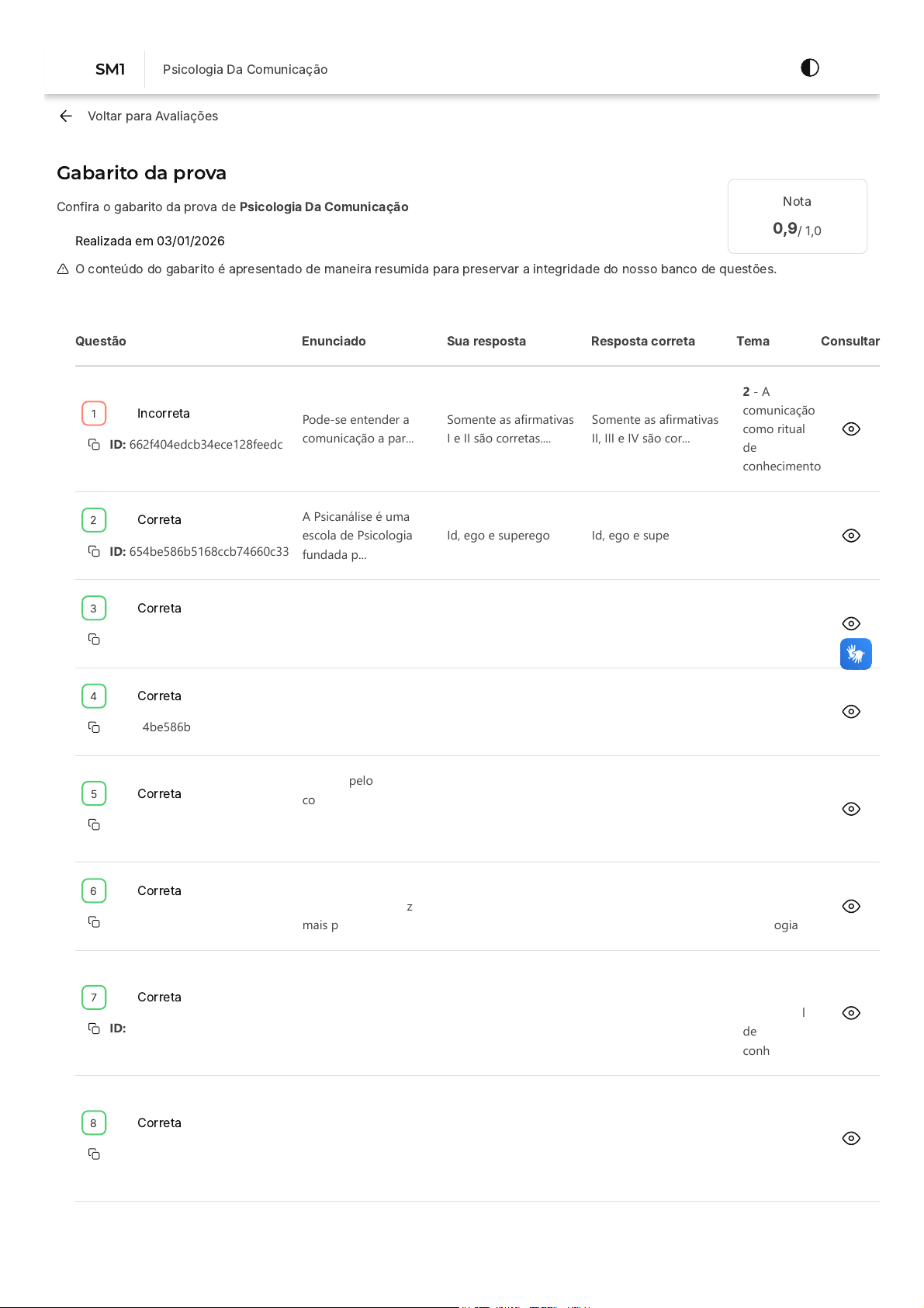 Voltar para Avaliações Gabarito da prova Confira o gabarito da prova de Psicologia Da Comunicação Realizada em 03/01/2026 Nota 0,9/ 1,0 O conteúdo do gabarito é apresentado de maneira resumida para preservar a integridade do nosso banco de questões. Questão Enunciado Sua resposta Resposta correta Tema Consultar Incorreta ID: 662f404edcb34ece128feedc Pode-se entender a comunicação a par... Somente as afirmativas I e II são corretas.... Somente as afirmativas II, III e IV são cor... 2 - A comunicação como ritual de conhecimento Correta ID: 654be586b5168ccb74660c33 A Psicanálise é uma escola de Psicologia fundada p... Id, ego e superego Id, ego e superego 3 - Estatuto científico da Psicologia Correta ID: 654be586b5168ccb74660c63 O termo "gestalt" pode ser traduzido como forma ou... Lei da Complexidade Lei da Complexidade 3 - Estatuto científico da Psicologia Correta ID: 654be586b5168ccb74660c1b Leia com atenção as afirmações a seguir a respeito... I e III I e III 3 - Estatuto científico da Psicologia Correta ID: 654be586b5168ccb74660c7b A busca pelo conhecimento acompanha a história da ... I, III e IV I, III e IV 3 - Estatuto científico da Psicologia Correta ID: 654be586b5168ccb74660c69 A ciência tem trabalhado cada vez mais para dar re... Factual, sistemática, verificável e falível Factual, sistemática, verificável e falível 3 - Estatuto científico da Psicologia Correta ID: 662f3f6ddcb34ece128fdd96 Compartilhamento de valores, crenças, pap&e... Comunidade cultural. Comunidade cultural. 2 - A comunicação como ritual de conhecimento Correta ID: 662f3eb3dcb34ece128fcc93 A percepção social está entre... vivida. vivida. 2 - A comunicação como ritual de conhecimento 1 2 3 4 5 6 7 8 SM1 Psicologia Da Comunicação https://estacio.saladeavaliacoes.com.br/avaliacoes/ Correta ID: 662f4496dcb34ece12902ae4 Toda distinção, exclusão, res... discriminação racial. discriminação racial. 2 - A comunicação como ritual de conhecimento Correta ID: 662f3ce9dcb34ece128fb8cd A Psicologia Social se insere no estudo sobre todo... São corretas apenas as afirmativas II e III... São corretas apenas as afirmativas II e III... 2 - A comunicação como ritual de conhecimento 9 10 Encontrou algum problema? Você pode copiar o ID da questão e abrir um requerimento. Na tela inicial do Campus Virtual (SIA), acesse "Atendimento > Requerimento > Novo > Currículo/Aula/horário > Analisar ambiente de avaliação/exercícios"