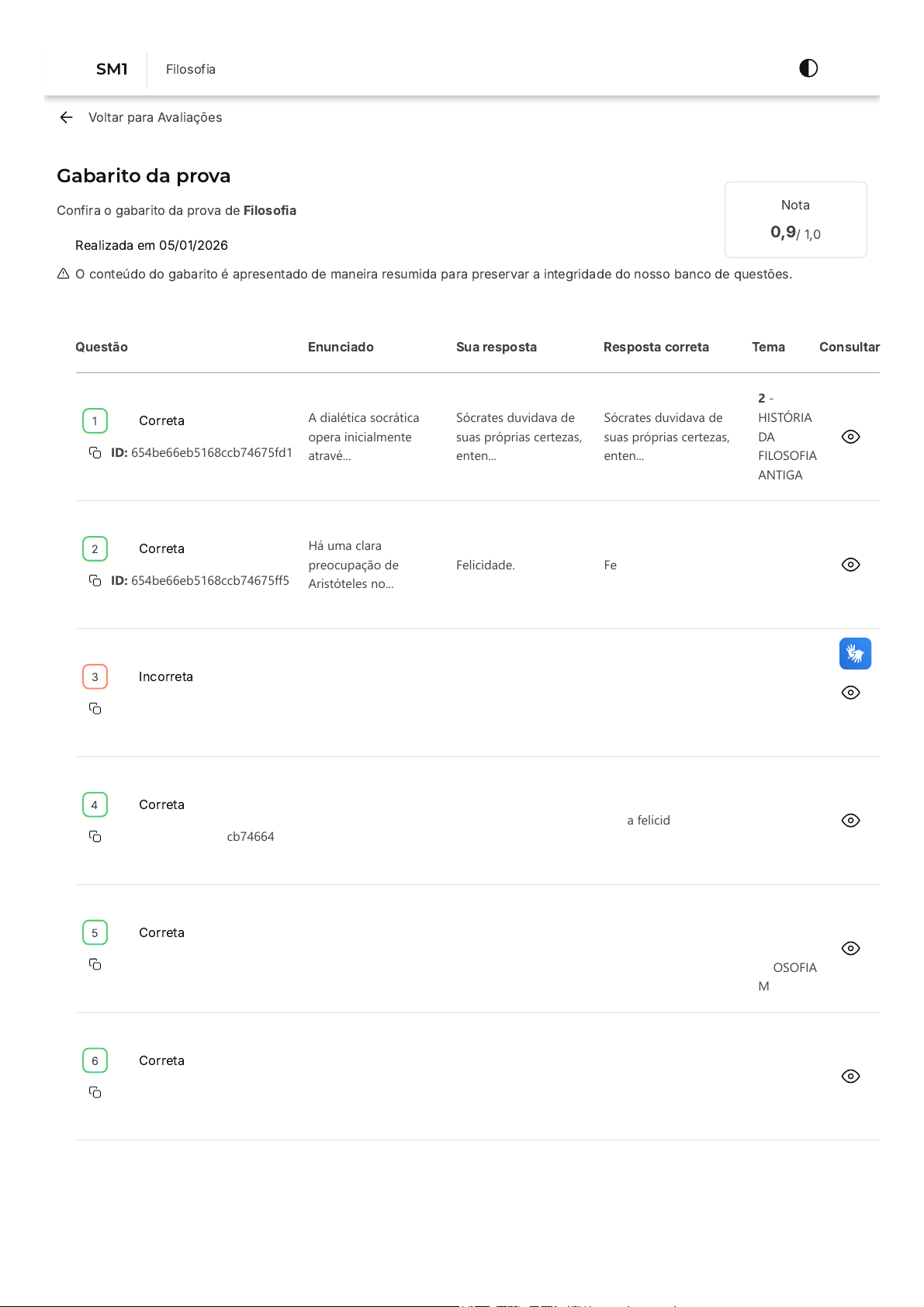Voltar para Avaliações Gabarito da prova Confira o gabarito da prova de Filosofia Realizada em 05/01/2026 Nota 0,9/ 1,0 O conteúdo do gabarito é apresentado de maneira resumida para preservar a integridade do nosso banco de questões. Questão Enunciado Sua resposta Resposta correta Tema Consultar Correta ID: 654be66eb5168ccb74675fd1 A dialética socrática opera inicialmente atravé... Sócrates duvidava de suas próprias certezas, enten... Sócrates duvidava de suas próprias certezas, enten... 2 - HISTÓRIA DA FILOSOFIA ANTIGA Correta ID: 654be66eb5168ccb74675ff5 Há uma clara preocupação de Aristóteles no... Felicidade. Felicidade. 2 - HISTÓRIA DA FILOSOFIA ANTIGA Incorreta ID: 654be68ab5168ccb7467802e Com um posicionamento nominalista, que é co... Escolástico e patrística. Fideísta e racionalista. 3 - HISTÓRIA DA FILOSOFIA MEDIEVAL Correta ID: 654be5a9b5168ccb74664e1e Para Tomás de Aquino, o Estado deve cooperar com a... Ambos trabalham pela única felicidade humana. Ambos trabalham pela única felicidade humana. 3 - HISTÓRIA DA FILOSOFIA MEDIEVAL Correta ID: 654be5a9b5168ccb74664d04 Para Tomás de Aquino, a virtude da temperança tem ... Interior Interior 3 - HISTÓRIA DA FILOSOFIA MEDIEVAL Correta ID: 654be5a9b5168ccb74664f20 Para Jeremy Bentham, quais são os fundamentos a qu... As dores e os prazeres As dores e os prazeres 4 - HISTÓRIA DA FILOSOFIA MODERNA 1 2 3 4 5 6 SM1 Filosofia https://estacio.saladeavaliacoes.com.br/avaliacoes/ Correta ID: 654be68eb5168ccb74678480 Thomas Hobbes foi um importante pensador pol&iacut... obediência das leis obediência das leis 4 - HISTÓRIA DA FILOSOFIA MODERNA Correta ID: 6826113a2958fab0e96a8677 Considerando a crítica plat&...A introdução da ideia... A introdução da ideia... 2 - HISTÓRIA DA FILOSOFIA ANTIGA Correta ID: 6712f5632332ecff9c2bf322 (FCC/2018) Adaptada Democracia é uma forma ... eram considerados cidadãos os homens adulto... eram considerados cidadãos os homens adulto... 2 - HISTÓRIA DA FILOSOFIA ANTIGA Correta ID: 68fe2d09525c5656bbd335c2 O pensamento de Michel de Montaigne era marcado po... Ceticismo Ceticismo 4 - HISTÓRIA DA FILOSOFIA MODERNA 7 8 9 10 Encontrou algum problema? Você pode copiar o ID da questão e abrir um requerimento. Na tela inicial do Campus Virtual (SIA), acesse "Atendimento > Requerimento > Novo > Currículo/Aula/horário > Analisar ambiente de avaliação/exercícios"
