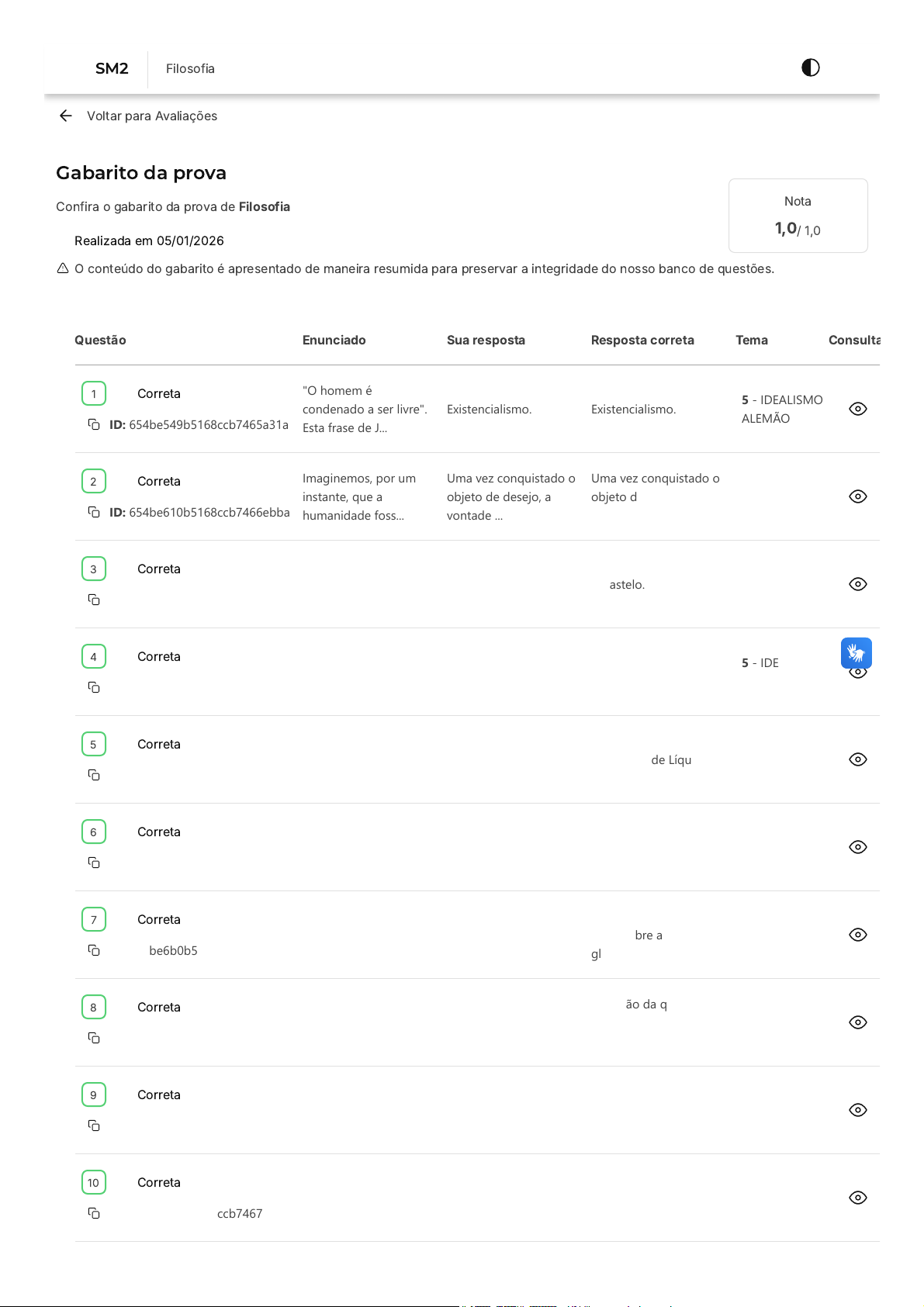 Voltar para Avaliações Gabarito da prova Confira o gabarito da prova de Filosofia Realizada em 05/01/2026 Nota 1,0/ 1,0 O conteúdo do gabarito é apresentado de maneira resumida para preservar a integridade do nosso banco de questões. Questão Enunciado Sua resposta Resposta correta Tema Consulta Correta ID: 654be549b5168ccb7465a31a "O homem é condenado a ser livre". Esta frase de J... Existencialismo. Existencialismo. 5 - IDEALISMO ALEMÃO Correta ID: 654be610b5168ccb7466ebba Imaginemos, por um instante, que a humanidade foss... Uma vez conquistado o objeto de desejo, a vontade ... Uma vez conquistado o objeto de desejo, a vontade ... 5 - IDEALISMO ALEMÃO Correta ID: 654be644b5168ccb74672e07 Leia o texto: O agrimensor K. chega a uma aldei... O castelo. O castelo. 5 - IDEALISMO ALEMÃO Correta ID: 654be549b5168ccb7465a314 Há uma diferença sensível entre as elaborações fil... Kant e Fichte concentram seus esforços filosóficos... Kant e Fichte concentram seus esforços filosóficos... 5 - IDEALISMO ALEMÃO Correta ID: 654be6b0b5168ccb7467a882 De acordo com Zygmunt Bauman, o mundo contem... Modernidade Líquida. Modernidade Líquida. 6 - MODERNIDADE LÍQUIDA Correta ID: 654be5c9b5168ccb74668401 Qual das duplas temáticas abaixo não se enquadra n... Criatividade midiática e urbanidade Criatividade midiática e urbanidade 6 - MODERNIDADE LÍQUIDA Correta ID: 654be6b0b5168ccb7467a88e (FUNCAB / 2012 - adaptada) A suspeita em relação a... Zygmunt Bauman, em texto sobre a globalização. Zygmunt Bauman, em texto sobre a globalização. 6 - MODERNIDADE LÍQUIDA Correta ID: 654be619b5168ccb7466fbb2 O termo fake news não é um fenômeno novo, mas foi ... Explosão da quantidade de informações geradas ou c... Explosão da quantidade de informações geradas ou c... 7 - A SOCIEDADE EM REDE Correta ID: 654be644b5168ccb74672e85 Na Internet, ela é uma rede social criada e... Facebook. Facebook. 7 - A SOCIEDADE EM REDE Correta ID: 654be644b5168ccb74672e79 PUC - RJ 2014 Ao longo do século XIX, diversos paí... O expansionismo, nesse momento, estava associado a... O expansionismo, nesse momento, estava associado a... 7 - A SOCIEDADE EM REDE 1 2 3 4 5 6 7 8 9 10 SM2 Filosofia https://estacio.saladeavaliacoes.com.br/avaliacoes/ Encontrou algum problema? Você pode copiar o ID da questão e abrir um requerimento. Na tela inicial do Campus Virtual (SIA), acesse "Atendimento > Requerimento > Novo > Currículo/Aula/horário > Analisar ambiente de avaliação/exercícios"