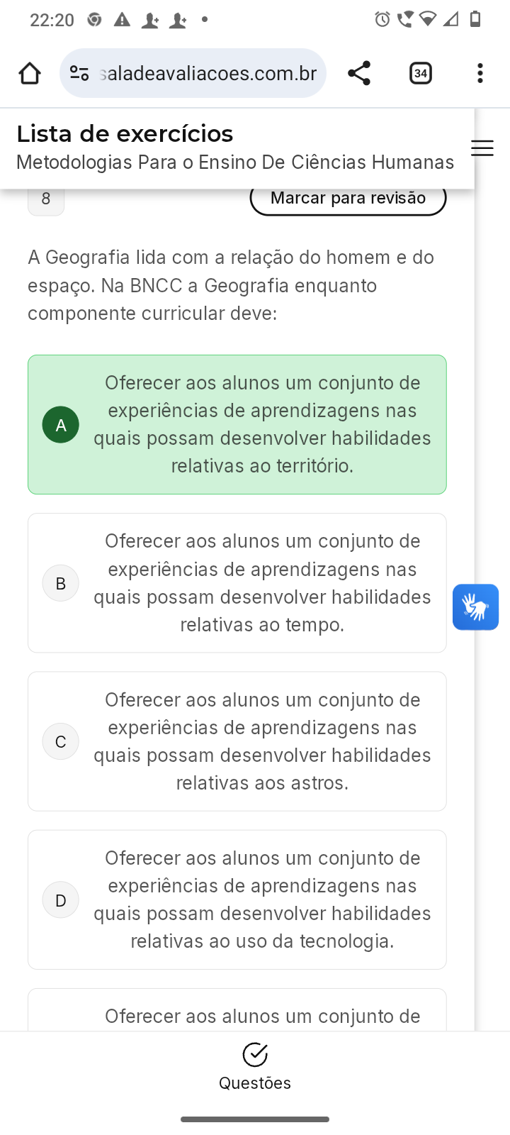 22:20 34 Lista de exercícios Metodologias Para Ensino De Ciências Humanas 8 Marcar para revisão A Geografia lida com a relação do homem e do espaço. Na BNCC a Geografia enquanto componente curricular deve: Oferecer aos alunos um conjunto de experiências de aprendizagens nas A quais possam desenvolver habilidades relativas ao território. Oferecer aos alunos um conjunto de experiências de aprendizagens nas quais possam desenvolver habilidades relativas ao tempo. Oferecer aos alunos um conjunto de experiências de aprendizagens nas c quais possam desenvolver habilidades relativas aos astros. Oferecer aos alunos um conjunto de experiências de aprendizagens nas D quais possam desenvolver habilidades relativas ao uso da tecnologia. Oferecer aos alunos um conjunto de Questões
