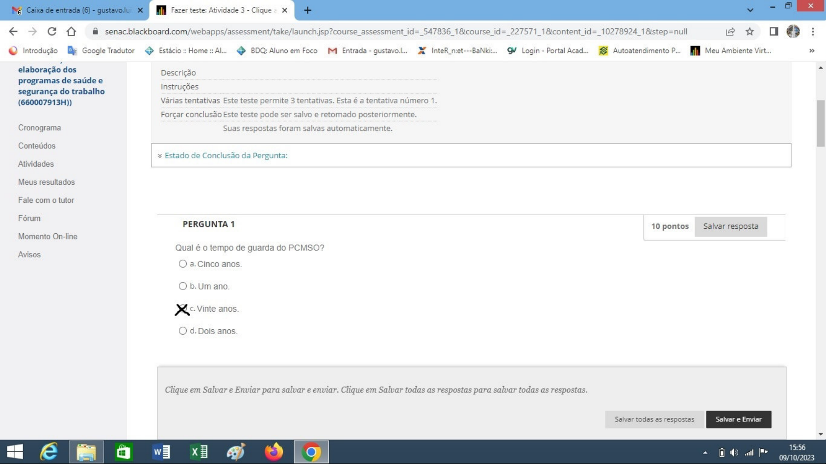 6 Caixa de entrada (6) gustavo.lu Fazer teste: Atividade 3 Clique X + Introdução Google Tradutor Estácio :: Home :: BDQ: Aluno em Foco Entrada gustavo.l... Login Portal Acad... Autoatendimento P... Meu Ambiente Virt... elaboração dos Descrição programas de saúde e segurança do trabalho Instruções (660007913H)) Várias tentativas Este teste permite 3 tentativas. Esta é a tentativa número 1. Forçar conclusão Este teste pode ser salvo e retomado posteriormente. Cronograma Suas respostas foram salvas automaticamente. Conteúdos Estado de Conclusão da Pergunta: Atividades Meus resultados Fale com 0 tutor Fórum PERGUNTA 1 10 pontos Salvar resposta Momento On-line Qual é 0 tempo de guarda do PCMSO? Avisos a. Cinco anos. b. Um ano. Vinte anos. d. Dois anos. Clique em Salvar e Enviar para salvar e enviar. Clique em Salvar todas as respostas para salvar todas as respostas. Salvar todas as respostas Salvar e Enviar e 15:56 W X 09/10/20236 Caixa de entrada (6) gustavo.lu Fazer teste: Atividade 3 Clique + Introdução Google Tradutor Estácio :: Home :: BDQ: Aluno em Foco Entrada gustavo.l... Login Portal Acad... Autoatendimento P... Meu Ambiente Virt... Estado de Conclusão da Pergunta: PERGUNTA 2 10 pontos Salvar resposta A partir da última atualização da NR-1, documentos previstos nas NRs podem ser emitidos e armazenados em meio digital com certificado digital emitido no âmbito da ICP-Brasil, normatizada por lei específica. Isso significa que todos os documentos com previsibilidade dentro das NRs podem ser digitalizados conforme estabelecido na NR-1. Alguns documentos deverão ter digitalização obrigatória, como no caso dos PPRAs, segundo prazos estabelecidos para digitalização dos documentos. Com base no contexto citado, assinale a alternativa correta. a. Os documentos da área de SST devem ser digitalizados no prazo de cinco anos para microempresas e de dois anos para microempreendedor individual. b. Os documentos da área de SST devem ser digitalizados no prazo de cinco anos para microempresas e de dois anos para empresas de pequeno porte. C. Os documentos da área de SST devem ser digitalizados no prazo de seis anos para microempresas e empresas de pequeno porte. d. Os documentos da área de SST devem ser digitalizados no prazo de cinco anos para microempresas e microempreendedor individual. Clique em Salvar e Enviar para salvar e enviar. Clique em Salvar todas as respostas para salvar todas as respostas. Salvar todas as respostas Salvar e Enviar e 15:57 W X 09/10/20236 Caixa de entrada (6) gustavo.lu Fazer teste: Atividade 3 Clique + Introdução Google Tradutor Estácio :: Home :: BDQ: Aluno em Foco Entrada gustavo.l... Login Portal Acad... Autoatendimento P... Meu Ambiente Virt... Estado de Conclusão da Pergunta: pequeno d. Os documentos da área de SST devem ser digitalizados no prazo de cinco anos para microempresas e microempreendedor individual. PERGUNTA 3 10 pontos Salvar resposta atestado de saúde ocupacional (ASO) é um importante documento de saúde do trabalhador, 0 qual deve ser emitido em duas vias e conter informações definidas na normatização. Qual é 0 tempo de guarda do ASO? a. Cinco anos. b. Um ano. Dois anos. d. Vinte anos. Clique em Salvar e Enviar para salvar e enviar. Clique em Salvar todas as respostas para salvar todas as respostas. Salvar todas as respostas Salvar e Enviar e 15:58 W X 09/10/20236 Caixa de entrada (6) gustavo.lu Fazer teste: Atividade 3 Clique X + Introdução Google Tradutor Estácio :: Home :: BDQ: Aluno em Foco Entrada gustavo.l... Login Portal Acad... Autoatendimento P... Meu Ambiente Virt... Estado de Conclusão da Pergunta: 4 A nova Norma Regulamentadora 1 (NR-1) é considerada um marco na história da área de saúde e segurança no trabalho (SST). A partir de tal norma, foi estabelecido que qualquer documento da área de SST poderá ser digitalizado. A Portaria 211 estabeleceu documentos que têm digitalização obrigatória. A partir de então, você sabe quais são documentos obrigatórios e quais são os facultativos quanto à digitalização. Observe os documentos a seguir e indique tipo de digitalização para cada um deles. Considere que 1 é para digitalização facultativa e 2 é para obrigatória: (...) Programa de Prevenção de Riscos Ambientais (PPRA) (...) Laudo Técnico das Condições de Trabalho (LTCT) (...) Análise Preliminar de Riscos (APR) (...) Programa de Controle Médico de Saúde Ocupacional (PCMSO) (...) Certificado de calibração (...) Formulário de investigação de acidentes (...) Registro de capacitação e treinamento Qual é a sequência correta? Clique em Salvar e Enviar para salvar e enviar. Clique em Salvar todas as respostas para salvar todas as respostas. Salvar todas as respostas Salvar e Enviar e 15:59 W X 09/10/2023Caixa de entrada (6) gustavo.lu Fazer teste: Atividade 3 Clique + C Introdução Google Tradutor Estácio :: Home :: BDQ: Aluno em Foco Entrada gustavo.l... Login Portal Acad... Autoatendimento P... Meu Ambiente Virt... Estado de Conclusão da Pergunta: PERGUNTA 5 10 pontos Salvar resposta empregador deve garantir a preservação de todos os documentos nato digitais ou digitalizados por meio de procedimentos e tecnologias que permitam verificar, a qualquer tempo, a validade jurídica dos arquivos em todo território nacional. Quais são as garantias, conforme NR-1, permanentemente necessárias para documentos que serão digitalizados? a. Autenticidade, integridade, disponibilidade, rastreabilidade, irretratabilidade, privacidade e interoperabilidade. b. Autenticidade, integridade, disponibilidade, realidade, irretratabilidade, privacidade e interoperabilidade. Autenticidade, integridade, realidade, rastreabilidade, irretratabilidade, privacidade e interoperabilidade. d. Autenticidade, integridade, disponibilidade, rastreabilidade, irretratabilidade, publicidade e interoperabilidade. Clique em Salvar e Enviar para salvar e enviar. Clique em Salvar todas as resp