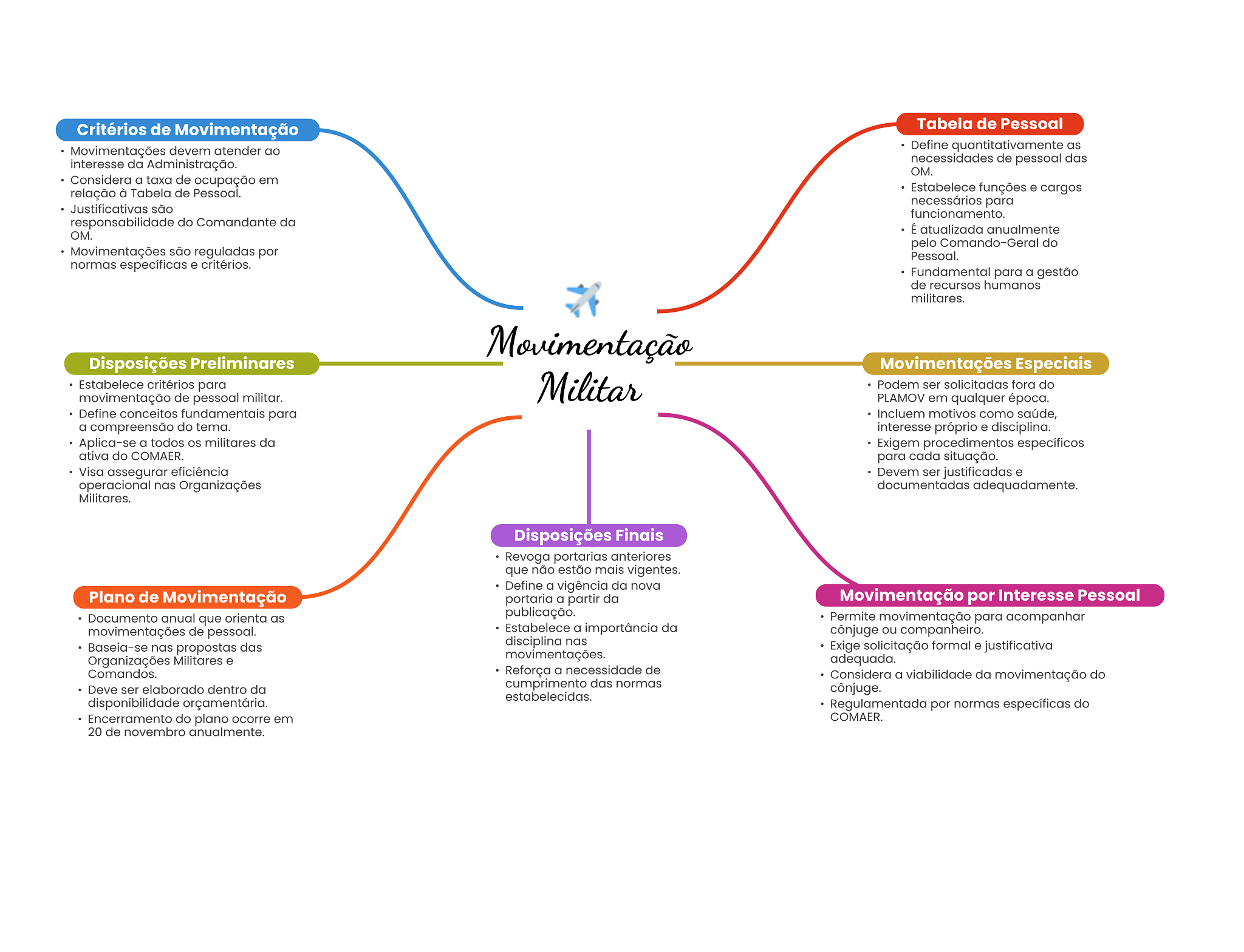 Critérios de Movimentação Tabela de Pessoal Movimentações devem atender ao Define as interesse da Administração. necessidades de pessoal das Considera a taxa de ocupação em relação à Tabela de Pessoal. Estabelece funções e cargos necessários para Justificativas são funcionamento. responsabilidade do Comandante da É atualizada anualmente OM. pelo Comando-Geral do Movimentações são reguladas por Pessoal. normas específicas e critérios. Fundamental para a gestão de recursos humanos militares. Movimentação Disposições Preliminares Movimentações Especiais Estabelece critérios para Militar Podem ser solicitadas fora do movimentação de pessoal militar. PLAMOV em qualquer época. Define conceitos fundamentais para Incluem motivos como saúde, a compreensão do tema. interesse próprio e disciplina. Aplica-se a todos OS militares da Exigem procedimentos específicos ativa do COMAER. para cada situação. Visa assegurar eficiência Devem ser justificadas e operacional nas Organizações documentadas adequadamente. Militares. Disposições Finais Revoga portarias anteriores que não estão mais vigentes. Define a vigência da nova Plano de Movimentação portaria a partir da Movimentação por Interesse Pessoal Documento anual que orienta as publicação. Permite movimentação para acompanhar movimentações de pessoal. Estabelece a importância da cônjuge ou companheiro. Baseia-se nas propostas das disciplina nas Exige solicitação formal e justificativa Organizações Militares e movimentações. adequada. Comandos. Reforça a necessidade de Considera a viabilidade da movimentação do Deve ser elaborado dentro da cumprimento das normas cônjuge. estabelecidas. disponibilidade orçamentária. Regulamentada por normas específicas do Encerramento do plano ocorre em COMAER. 20 de novembro anualmente.