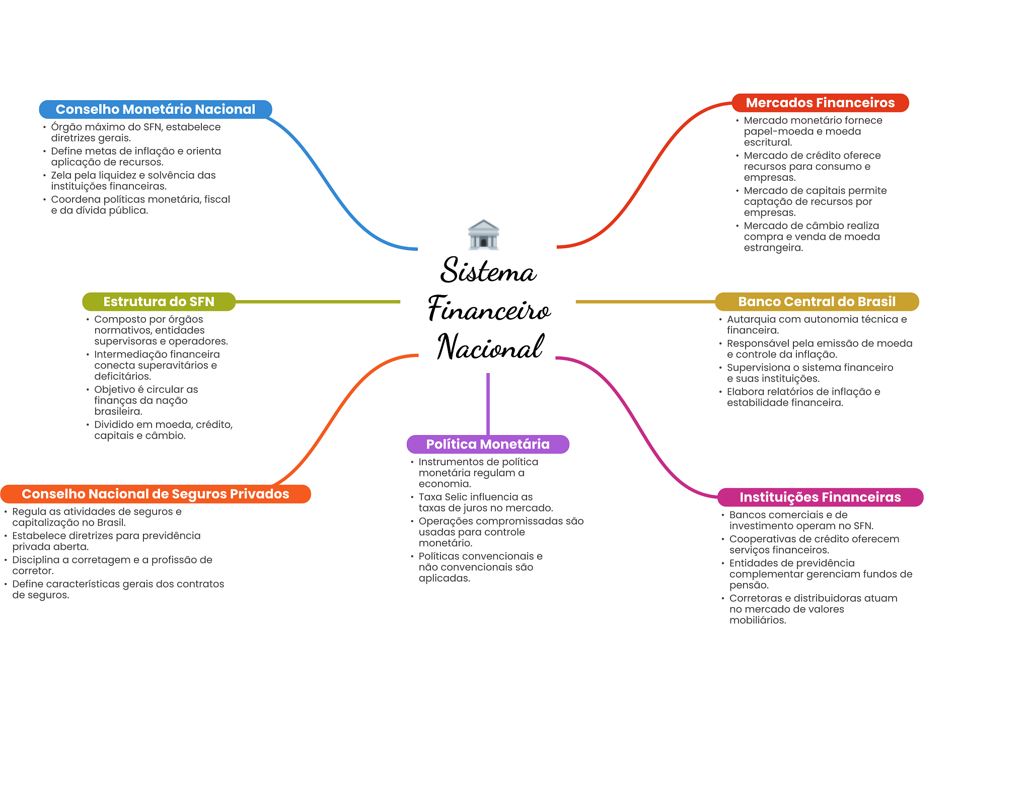 Mercados Financeiros Conselho Monetário Nacional Mercado monetário fornece Órgão máximo do SFN, estabelece papel-moeda e moeda diretrizes gerais. escritural. Define metas de inflação e orienta Mercado de crédito oferece aplicação de recursos. recursos para consumo e Zela pela liquidez e solvência das empresas. instituições financeiras. Mercado de capitais permite Coordena políticas monetária, fiscal captação de recursos por e da dívida pública. empresas. Mercado de câmbio realiza compra e venda de moeda estrangeira. Sistema Estrutura do SFN Financeiro Banco Central do Brasil Composto por órgãos Autarquia com autonomia técnica e normativos, entidades financeira. supervisoras e operadores. Intermediação financeira Nacional Responsável pela emissão de moeda e controle da inflação. conecta superavitários e Supervisiona sistema financeiro deficitários. e suas instituições. Objetivo é circular as Elabora relatórios de inflação e finanças da nação estabilidade financeira. brasileira. Dividido em moeda, crédito, capitais e câmbio. Política Monetária Instrumentos de política monetária regulam a economia. Conselho Nacional de Seguros Privados Taxa Selic influencia as Instituições Financeiras Regula as atividades de seguros e taxas de juros no mercado. Bancos comerciais e de capitalização no Brasil. Operações compromissadas são investimento operam no SFN. Estabelece diretrizes para previdência usadas para controle monetário. Cooperativas de crédito oferecem privada aberta. Políticas convencionais e serviços financeiros. Disciplina a corretagem e a profissão de não convencionais são Entidades de previdência corretor. Define características gerais dos contratos aplicadas. complementar gerenciam fundos de pensão. de seguros. Corretoras e distribuidoras atuam no mercado de valores mobiliários.