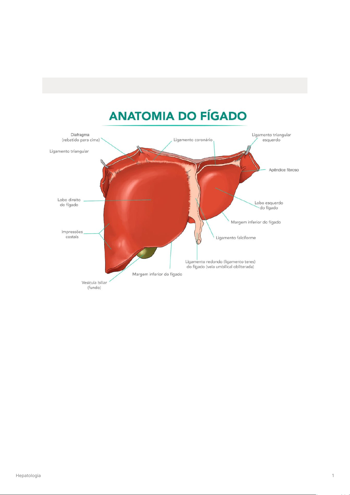Hepatologia Formação estrutural do fígado Temos os hepatócitos, células do fígado, se localizam um ao lado do outro, e entre eles temos os sinusoides hepáticos. No início de cada sinusoide, antes de chegar nos hepatócitos temos o espaço porta, onde temos artéria hepática, veia porta e ductos biliares. Hepatologia 1 Temos um mecanismo chamado de primeira passagem. Toda substância absorvida no intestino, passa logo nos hepatócitos, toda drenagem do intestino, veias mesentéricas, baço, abdominal termina na veia porta. Todas as toxinas, bactérias, medicamentos, passam primeiro pelo fígado para depois chegar na corrente sanguínea, coração e grande circulação. O fígado é o principal órgão metabolizador de substâncias absorvidas pelo intestino. Isso acontece pois temos um sistema porta que é completado pela veia porta e passa pelo meio dos sinusoides hepáticos - temos sistema venoso, arterial e vias biliares. O sistema arterial nutre os hepatócitos com oxigênio para que ele faça suas atividades. O sistema venoso leva todas as substâncias tóxicas, também leva oxigênio, para serem metabolizadas pelos hepatócitos e seguir na corrente. Hepatologia 2 Para isso os sinusoides hepáticos possuem em sua membrana células endoteliais muito finas, fenestradas, que permitem a saída e entrada do sangue com facilidade. Na parede dos sinusoides hepáticos também encontramos os macrófagos de Kuffer, celulas importantes para defesa, principalmente quando não temos o baço. Tanto as artérias quanto as veias dos sinusoides vem de um caminho ascendente. O sistema biliar é o inverso, o fluxo é descendente. Os próprios hepatócitos, por meio dos canalículos biliares, conseguem excretar substâncias que deveriam ser eliminadas do corpo, jogando para o ducto biliar. Dos ductos biliares temos o ducto hepático direito, ducto hepático esquerdo, ducto hepático comum, colédoco de eliminação no intestino. Hepatologia 3 Após passar por todos os sinusoides hepáticos, chegamos em cima e encontramos a veia centro lobular, já está na saída do fígado, que posteriormente pega veias supra hepáticas, veia cava e segue para o coração. Exemplo encefalopatia hepática: O paciente possui um problema no fígado que gera um dano neurológico. O fígado deveria metabolizar amônia em ureia, mas por algum motivo os hepatócitos não funcionam bem, e temos um acúmulo excessivo de amônia, que ultrapassa a barreira hemato encefálica e gera encefalopatia. O espaço que temos dos sinusoides hepáticos até os hepatócitos é chamado de espaço de Disse. É onde temos o principal processo de fibrose que acontece na cirrose hepática. Temos as células estrelares que promovem a fibrose do fígado pelo espaço de disse. Os lóbulos hepáticos são um conjunto de hepatócitos, onde temos a veia centro lobular e temos o espaço porta, que liga os lóbulos hepáticos. Os sinusoides hepáticos são os vasos que passam no meio dos hepatócitos, pois em sua membrana temos células endoteliais e macrófagos de Kuffer, espaço de Disse, espaço porta e a veia centro lobular. Todos os ductos biliares do espaço porta levam para a região do colédoco para eliminação no duodeno. Hepatologia 4 As vias biliares começam nos canalículos dentro dos hepatócitos, chegam nos ductos biliares no espaço porta, partem para ductos hepáticos direito e esquerdo, ducto hepático comum, colédoco direito e esquerdo. Principais funções fisiológica do fígado O fígado é um órgão que possui várias funções. Hepatologia 5 Metabolismo proteico: o fígado produz albumina, ferritina, transferrina, fatores de coagulação. Quando queremos saber a função do fígado pedimos albumina, fator de coagulação, bilirrubina, ceruloplasmina, PCR. Se não temos proteína temos diminuição da pressão oncótica. Metabolismo de carboidrato: gliconeogênese, glicólise - é comum paciente com hepatopatia crônica ter hipoglicemia. Metabolismo de lipídeos: HDL, LDL, produz e consegue reservar (esteatose hepática). Ativação ou inativação química: amônia (toda amônia precisa ser convertida em ureia), converte medicações, alimentos, toxinas. Metabolismo da bilirrubina: a bilirrubina vem das hemácias. Uma hemácia vive em média 120 dias, sendo seu principal constituinte a hemoglobina. Toda hemoglobina é formada por M e globinas. O grupo M é formato por ferro e protoporfirina. Na destruição das hemácias a protoporfirina é transformada em bilirrubina indireta, que se liga a albumina e vai para o fígado. No fígado sofre ação da glicuroniltransferase, que conjuga bilirrubina indireta com ácido glicurônico, transformando em bilirrubina direta. A bilirrubina direta pega vias biliares e é eliminada no intestino, eliminada como estercobilinogênio. Uma pequena parte é reabsorvida e é eliminada na urina em forma de urobilinogênio. Anemia hemolítica: bilirrubina indireta aumenta; Problema na glicuroniltransferase: aumento de bilirrubina indireta; Em caso de cálculo nas vias biliares: aumento de bilirrubina direta (já conjuguei e não consegue sair). Em casos de problemas com bilirrubina o paciente chega ictérico. Em paciente de síndrome colestática temos alteração em fezes e urina, a bilirrubina não chega no intestino e não temos coloração nas fezes (branca) e na urina temos cor de coca cola. Circulação entero-hepática: o fígado tem a capacidade de absorver até 95% do que é liberado. O fígado libera sais biliares na bile, chega no duodeno e absorve as gorduras, vai para jejuno e chega no ílio. Esses sais biliares voltam a ser reabsorvidos. Quem estimula a vesícula a contrair e pâncreas é a CCK. Hepatologia 6 DOENÇAS DO FÍGADO Síndrome de Gilbert Nesta doença temos uma leve disfunção da glicuroniltransferase. Ela acaba trabalhando menos do que deveria, e não consegue conjugar toda a bilirrubina indireta que chega no fígado em bilirrubina direta. Esses pacientes geralmen