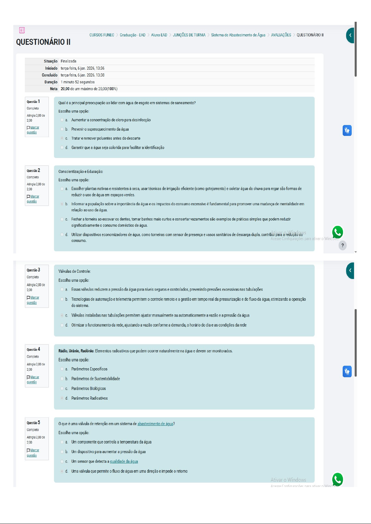 CURSOS FUNEC Graduação EAD Aluno EAD JUNÇÕES DE TURMA Sistema de Abastecimento de Água AVALIAÇÕES QUESTIONÁRIO QUESTIONÁRIO II Situação Finalizada Iniciado terça-feira, 6 jan. 2026, 13:36 Concluído terça-feira, 6 jan. 2026, 13:38 Duração 1 minuto 52 segundos Nota 20,00 de um máximo de 20,00(100%) Questão 1 Qual é a principal preocupação ao lidar com água de esgoto em sistemas de saneamento? Completo Escolha uma opção: Atingiu 2,00 de 2,00 a. Aumentar a concentração de cloro para desinfecção Marcar b. Prevenir superaquecimento da água questão Tratar e remover poluentes antes do descarte d. Garantir que a água seja colorida para facilitar a identificação Questão 2 Conscientização e Educação: Completo Escolha uma opção: Atingiu 2,00 de 2,00 a. Escolher plantas nativas e resistentes à seca, usar técnicas de irrigação eficiente (como gotejamento) e coletar água da chuva para regar são formas de Marcar reduzir uso de água em espaços verdes. questão b. Informar a população sobre a importância da água e os impactos do consumo excessivo é fundamental para promover uma mudança de mentalidade em relação ao uso da água. Fechar a torneira ao escovar os dentes, tomar banhos mais curtos e consertar vazamentos são exemplos de práticas simples que podem reduzir significativamente consumo doméstico de água. d. Utilizar dispositivos economizadores de água, como torneiras com sensor de presença e vasos sanitários de descarga dupla, contribui para a redução do consumo. Acesse Configurações para ativar Windov ? Questão 3 Válvulas de Controle: Completo Escolha uma opção: Atingiu 2,00 de 2,00 a. Essas válvulas reduzem a pressão da água para níveis seguros e controlados, prevenindo pressões excessivas nas tubulações Marcar b. Tecnologias de automação e telemetria permitem controle remoto e a gestão em tempo real da pressurização e do fluxo da água, otimizando a operação questão do sistema. Válvulas instaladas nas tubulações permitem ajustar manualmente ou automaticamente a vazão e a pressão da água d. Otimizar funcionamento da rede, ajustando a vazão conforme a demanda, horário do dia e as condições da rede Questão 4 Rádio, Urânio, Radônio: Elementos radioativos que podem ocorrer naturalmente na água e devem ser monitorados. Completo Escolha uma opção: Atingiu 2,00 de 2,00 a. Parâmetros Específicos Marcar b. Parâmetros de Sustentabilidade questão Parâmetros Biológicos d. Parâmetros Radioativos Questão 5 0 que é uma válvula de retenção em um sistema de abastecimento de água? Completo Escolha uma opção: Atingiu 2,00 de 2,00 a. Um componente que controla a temperatura da água Marcar b. Um dispositivo para aumentar a pressão da água questão Um sensor que detecta a qualidade da água d. Uma válvula que permite fluxo de água em uma direção e impede retorno Ativar Windows nara ativar WindQuestão 6 A dureza é a concentração de sais de cálcio e magnésio na água, afetando a formação de incrustações em tubulações e equipamentos. Completo Escolha uma opção: Atingiu 2,00 de 2,00 a. Condutividade Marcar b. Dureza questão Alcalinidade d. pH Questão 7 Qual é a causa comum de vazamentos em sistemas de abastecimento de água? Completo Escolha uma opção: Atingiu 2,00 de 2,00 a. Redução da pressão da água Marcar b. Excesso de flúor questão Materiais de alta qualidade d. Uso eficiente de água Questão 8 que é um reservatório de água em sistemas de abastecimento? Completo Escolha uma opção: Atingiu 2,00 de 2,00 a. Uma usina de tratamento de água Marcar b. Uma instalação para produção de água mineral questão Um tanque de armazenamento para água tratada d. Um local para estocar água subterrânea Ativar Windows Acesse Configurações para ativar Wind Questão 9 0 que é uma rede de distribuição de água? Completo Escolha uma opção: Atingiu 2,00 de 2,00 a. Um método de purificação da água subterrânea Marcar b. Um conjunto de encanamentos para levar água tratada aos consumidores questão C. Um sistema para coletar água da chuva d. Uma rede social para profissionais da área de tratamento de água Questão 10 Adotar práticas de uso responsável da água, minimizando 0 desperdício e promovendo a eficiência na alocação dos recursos hídricos: Completo Escolha uma opção: Atingiu 2,00 de 2,00 a. Reuso e Reciclagem Marcar b. Uso Responsável questão C. Proteção de Ecossistemas d. Gestão Integrada Terminar revisão