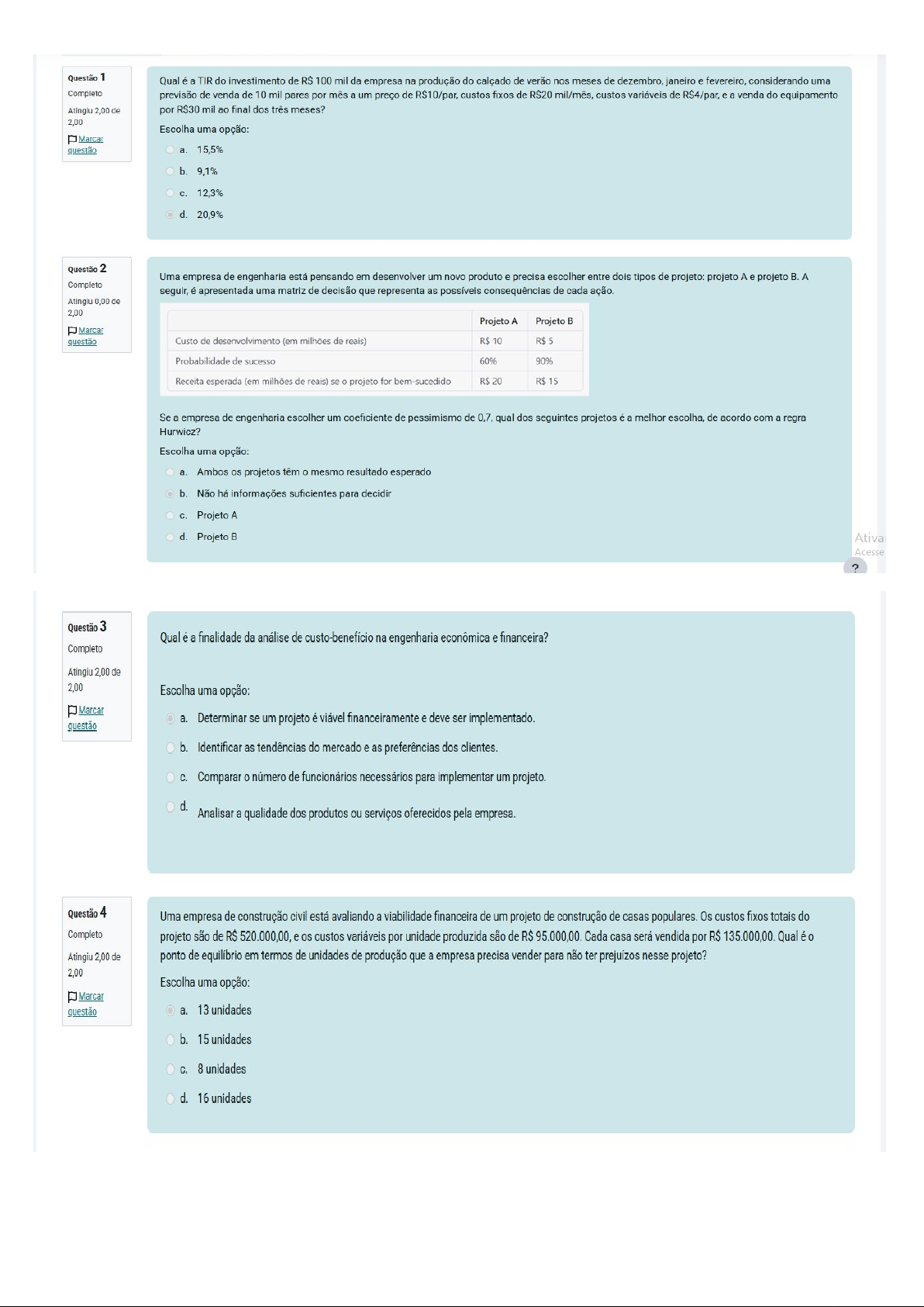 Questão 1 Qual é a TIR do investimento de R$ 100 mil da empresa na produção do calçado de verão nos meses de dezembro, janeiro e fevereiro, considerando uma Completo previsão de venda de 10 mil pares por mês a um preço de R$10/par, custos fixos de R$20 mil/mês, custos variáveis de R$4/par, e a venda do equipamento Atingiu 2,00 de por R$30 mil ao final dos três meses? 2,00 Escolha uma opção: Marcar a. 15,5% b. 9,1% 12,3% d. 20,9% Questão 2 Uma empresa de engenharia está pensando em desenvolver um novo produto e precisa escolher entre dois tipos de projeto: projeto A e projeto A Completo seguir, é apresentada uma matriz de decisão que representa as possíveis consequências de cada ação. Atingiu 0,00 de 2,00 Projeto A Projeto Marcar guestão Custo de desenvolvimento (em milhões de reais) R$ 10 R$ 5 Probabilidade de sucesso 60% 90% Receita esperada (em milhões de reais) se projeto for bem-sucedido R$ 15 Se a empresa de engenharia escolher um coeficiente de pessimismo de 0,7, qual dos seguintes projetos é a melhor escolha, de acordo com a regra Hurwicz? Escolha uma opção: a. Ambos os projetos têm mesmo resultado esperado b. Não há informações suficientes para decidir Projeto A d. Projeto Acesse ? Questão 3 Qual é a finalidade da análise de custo-benefício na engenharia econômica e financeira? Completo Atingiu 2,00 de 2,00 Escolha uma opção: Marcar a. Determinar se um projeto é viável financeiramente e deve ser implementado. questão b. Identificar as tendências do mercado e as preferências dos clientes. Comparar número de funcionários necessários para implementar um projeto. d. Analisar a qualidade dos produtos ou serviços oferecidos pela empresa. Questão 4 Uma empresa de construção civil está avaliando a viabilidade financeira de um projeto de construção de casas populares. Os custos fixos totais do Completo projeto são de R$ 520.000,00, e os custos variáveis por unidade produzida são de R$ 95.000,00. Cada casa será vendida por R$ 135.000,00. Qual é Atingiu 2,00 de ponto de equilíbrio em termos de unidades de produção que a empresa precisa vender para não ter prejuízos nesse projeto? 2,00 Escolha uma opção: Marcar a. 13 unidades b. 15 unidades 8 unidades d. 16 unidadesQuestão 5 Qual é a regra de decisão que considera uma ponderação entre otimismo e pessimismo na escolha da melhor alternativa em uma matriz de decisão? Completo Atingiu 2,00 de 2,00 Escolha uma opção: Marcar a. Regra Max Min questão b. Regra Hurwicz Regra de Laplace d. Regra Max Max Questão 6 Qual a diferença entre Capex e no custo de investimento? Completo Atingiu 2,00 de 2,00 Escolha uma opção: Marcar a. Capex se refere aos gastos operacionais regulares da empresa, enquanto se refere aos gastos associados à aquisição de ativos fixos. b. Capex se refere aos gastos de curto prazo necessários para adquirir ativos fixos, enquanto representa os gastos de longo prazo necessários para manter as operações da empresa em andamento. Capex se refere aos gastos operacionais necessários para manter as operações da empresa em andamento, enquanto se refere aos gastos associados à aquisição de ativos intangíveis d. Capex se refere aos gastos associados à aquisição de ativos fixos, enquanto se refere aos gastos operacionais regulares da empresa. Questão 7 Qual a diferença entre custos e despesas em uma empresa? Completo Atingiu 2,00 de 2,00 Escolha uma opção: Marcar a. Custos e despesas são sinônimos e se referem a qualquer gasto da empresa. b. Custos e despesas se referem exclusivamente a gastos relacionados à gestão administrativa da empresa. Custos se referem a gastos administrativos, enquanto despesas estão relacionadas à produção ou aquisição de produtos ou serviços. d. Custos se referem a gastos diretos na produção ou aquisição de produtos ou serviços, enquanto despesas são gastos indiretos relacionados à gestão administrativa da empresa. Questão 8 Uma empresa de fabricação de sapatos tem custos fixos mensais de R$10.000,00 e custos variáveis de R$30,00 por par de sapato produzido. Cada par de Completo sapato é vendido por R$80,00. Qual é ponto de equilíbrio em termos de unidades de produção e receita? Atingiu 2,00 de 2,00 Marcar Escolha uma opção: questão a. 200 unidades e R$16.000,00 de receita b. 500 unidades e R$40.000,00 de receita 400 unidades e R$32.000,00 de receita d. 333 unidades e R$26.640,00 de receita AtivarQuestão 9 Qual é a diferença entre incerteza e risco? Completo Atingiu 2,00 de 2,00 Escolha uma opção: Marcar a. Incerteza se refere à possibilidade de perda financeira ou de outro tipo de impacto negativo decorrente de um evento futuro incerto, enquanto risco se refere à falta de conhecimento ou informação sobre um evento ou resultado futuro. b. Incerteza e risco são sinônimos e, portanto, não há diferença entre eles. Incerteza se refere à ausência de certeza ou a imprevisibilidade em relação ao futuro, enquanto risco é a possibilidade de que algo negativo aconteça no futuro, mesmo que não se saiba exatamente que vai acontecer. d. Incerteza é a possibilidade de variação dos possíveis valores que uma determinada variável possa assumir no futuro, enquanto risco é a impossibilidade de prever valor futuro dessa variável. Questão 10 Qual a finalidade da classificação dos custos em fixos e variáveis ao calcular ponto de equilíbrio em projetos de engenharia? Completo Escolha uma opção: Atingiu 2,00 de 2,00 a. Determinar a quantidade mínima de produção ou vendas necessária para cobrir todos os custos associados ao projeto. Marcar b. Avaliar a rentabilidade esperada para diferentes cenários de produção ou vendas. Identificar custos que mudam com nível de produção ou vendas. d. Comparar diferentes alternativas com diferentes estruturas de custos. Terminar revisão Ativa Acesse