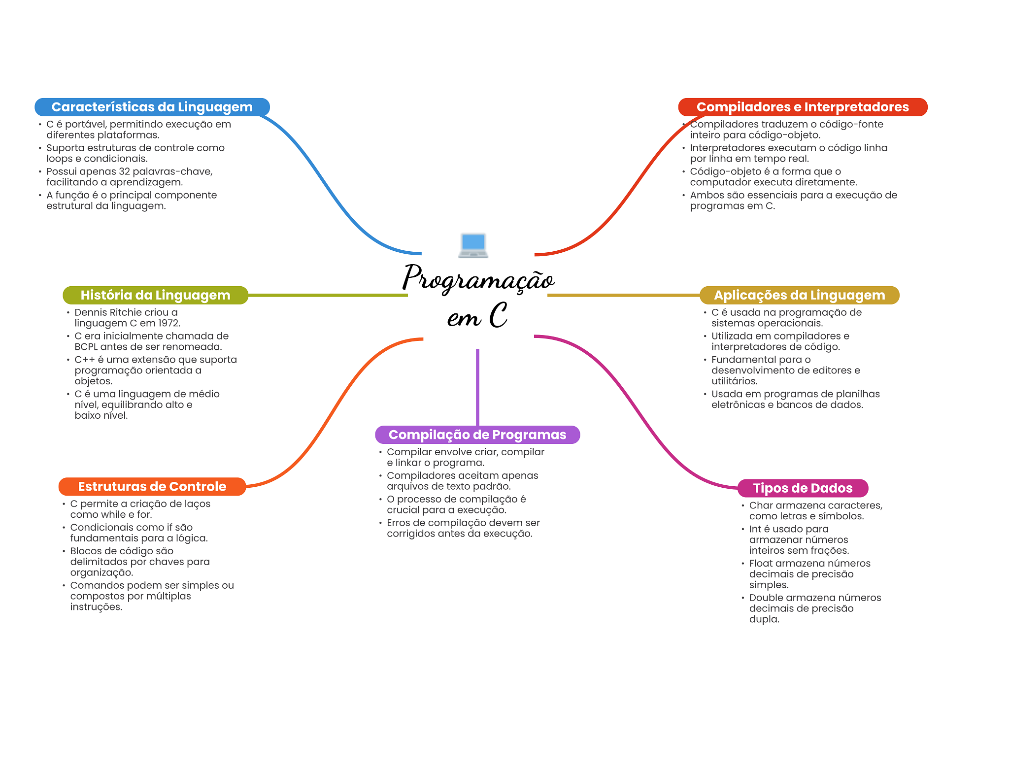 Características da Linguagem Compiladores e Interpretadores portável, permitindo execução em Compiladores traduzem código-fonte diferentes plataformas. inteiro para código-objeto. Suporta estruturas de controle como Interpretadores executam código linha loops e condicionais. por linha em tempo real. Possui apenas 32 palavras-chave, Código-objeto é a forma que facilitando a aprendizagem. computador executa diretamente. A função é principal componente Ambos são essenciais para a execução de estrutural da linguagem. programas em C. Programação História da Linguagem Aplicações da Linguagem Dennis Ritchie criou a linguagem em 1972. em C é usada na programação de sistemas operacionais. era inicialmente chamada de Utilizada em compiladores e BCPL antes de ser renomeada. interpretadores de código. C++ é uma extensão que suporta Fundamental para programação orientada a desenvolvimento de editores e objetos. utilitários. C é uma linguagem de médio Usada em programas de planilhas nível, equilibrando alto e eletrônicas e bancos de dados. baixo nível. Compilação de Programas Compilar envolve criar, compilar e linkar programa. Compiladores aceitam apenas Estruturas de Controle arquivos de texto padrão. Tipos de Dados C permite a criação de laços processo de compilação é como while e for. crucial para a execução. Char armazena caracteres, como letras e símbolos. Condicionais como if são Erros de compilação devem ser fundamentais para a lógica. corrigidos antes da execução. Int é usado para armazenar números Blocos de código são inteiros sem frações. delimitados por chaves para Float armazena números organização. decimais de precisão Comandos podem ser simples ou simples. compostos por múltiplas Double armazena números instruções. decimais de precisão dupla.