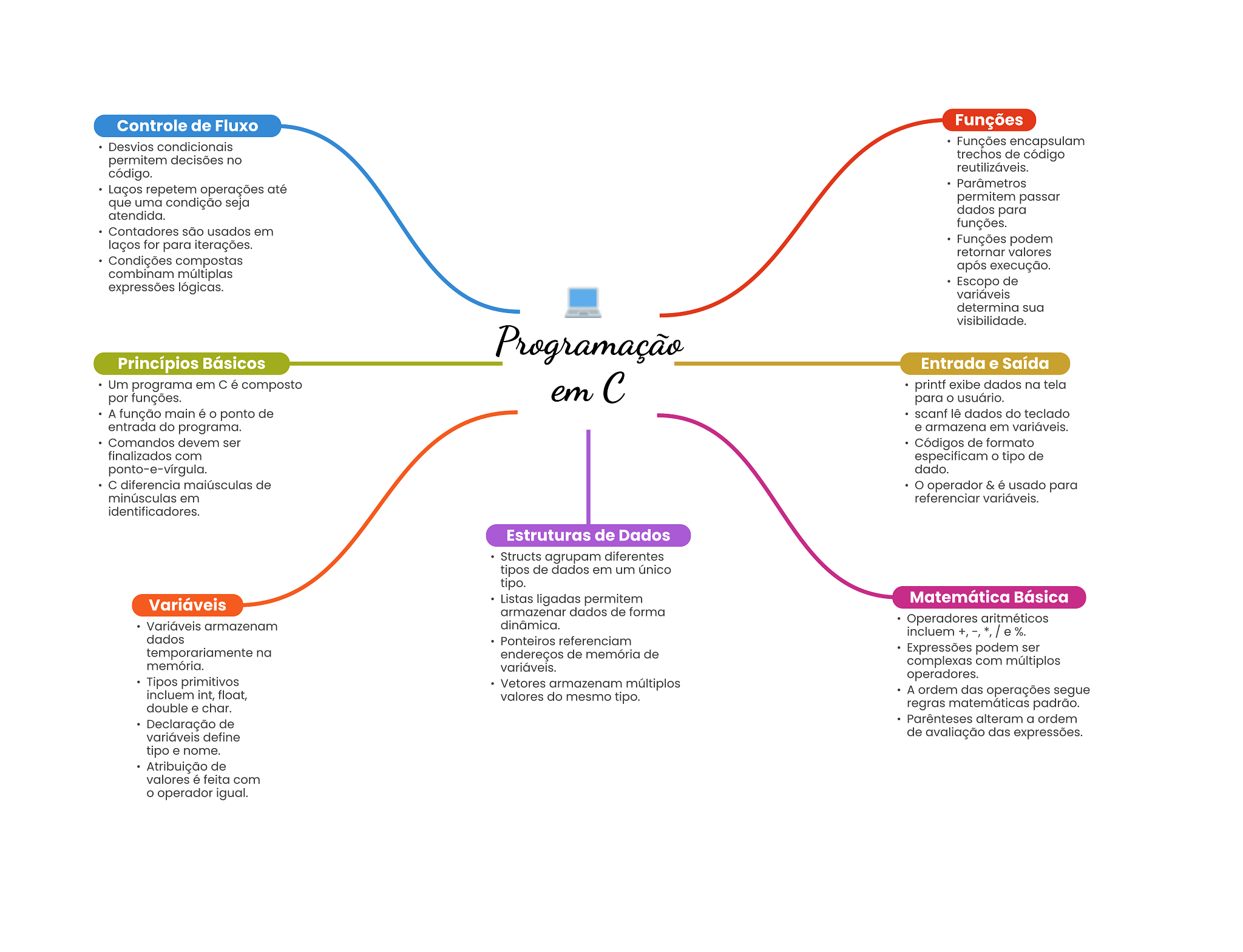 Controle de Fluxo Funções Desvios condicionais Funções encapsulam permitem decisões no trechos de código reutilizáveis. código. Parâmetros Laços repetem operações até que uma condição seja permitem passar atendida. dados para funções. Contadores são usados em laços for para iterações. Funções podem retornar valores Condições compostas após execução. combinam múltiplas expressões lógicas. Escopo de variáveis determina sua visibilidade. Programação Princípios Básicos Entrada e Saída Um programa em C é composto por funções. em printf exibe dados na tela para usuário. A função main é O ponto de scanf lê dados do teclado entrada do programa. e armazena em variáveis. Comandos devem ser Códigos de formato finalizados com especificam O tipo de dado. diferencia maiúsculas de O operador usado para minúsculas em referenciar variáveis. identificadores. Estruturas de Dados Structs agrupam diferentes tipos de dados em um único tipo. Listas ligadas permitem Matemática Básica Variáveis armazenar dados de forma Variáveis armazenam dinâmica. Operadores aritméticos dados Ponteiros referenciam temporariamente na endereços de memória de Expressões podem ser memória. variáveis. complexas com múltiplos operadores. Tipos primitivos Vetores armazenam múltiplos incluem int, float, valores do mesmo tipo. A ordem das operações segue double e char. regras matemáticas padrão. Declaração de Parênteses alteram a ordem variáveis define de avaliação das expressões. tipo e nome. Atribuição de valores é feita com operador igual.