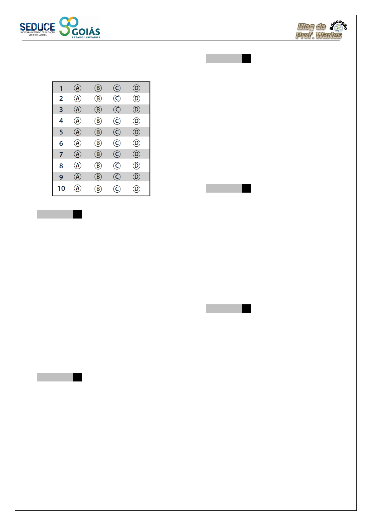 6ª Prova Diagnóstica – 2016 – 5º Ano SEDUCE-GO – CIÊNCIAS DA NATUREZA ESCOLA: ________________________ Prof.:____________________________ Nome: ___________________________ D12 Questão 1 –––––––––––––––––––––––––––◊ O sistema respiratório é responsável pela entrada e saída de ar em nosso organismo. Ao passar pelas fossas nasais, o ar é aquecido e filtrado para manter a saúde do organismo. Um comportamento necessário para evitar doenças respiratórias é (A) evitar locais com agentes causadores de poluição. (B) fazer a queimada da vegetação em terrenos baldios. (C) manter o quarto fechado evitando a circulação do ar. (D) utilizar cortinas nas janelas do quarto para deixá-lo escuro. D12 Questão 2 –––––––––––––––––––––––––––◊ A respiração é o processo de absorção de oxigênio e eliminação de gás carbônico. Para garantir uma melhor qualidade de vida, o ar que respiramos deve estar livre de impurezas. Um comportamento que oferece risco à saúde respiratória é (A) caminhar ao ar livre. (B) compartilhar ambientes fechados com fumantes. (C) dormir em quartos limpos e arejados. (D) ter bons hábitos alimentares. D12 Questão 3 –––––––––––––––––––––––––––◊ O funcionamento do coração é fundamental para a circulação do sangue em todo corpo. Quando o sangue não chega ao coração em quantidade suficiente, pode acontecer o infarto do miocárdio (ataque cardíaco). Vários comportamentos oferecem risco à saúde do coração, dentre eles (A) beber muita água. (B) comer alimentos gordurosos. (C) comer alimentos variados. (D) praticar atividades físicas. D12 Questão 4 –––––––––––––––––––––––––––◊ A cistite é uma inflamação e infecção que prejudica o funcionamento da bexiga, órgão do sistema urinário responsável por armazenar a urina antes de ser eliminada do corpo. Um comportamento de risco que contribui para o surgimento dessa doença é (A) beber muita água. (B) beber pouca água. (C) comer carne vermelha. (D) comer verduras. D15 Questão 5 –––––––––––––––––––––––––––◊ O corpo humano funciona como uma máquina. Para realizar atividades como andar, correr, dançar, diversos órgãos e sistemas do corpo humano atuam de forma integrada. Os movimentos do corpo são realizados, principalmente pelo sistema (A) circulatório. (B) digestório. (C) locomotor. (D) respiratório. D15 Questão 6 –––––––––––––––––––––––––––◊ O sistema circulatório realiza a distribuição de nutrientes e oxigênio para todas as células do nosso corpo pelos vasos sanguíneos. O órgão responsável por impulsionar o sangue é (A) a bexiga. (B) o coração. (C) os pulmões. (D) os rins. D15 Questão 7 –––––––––––––––––––––––––––◊ O órgão do sistema urinário responsável por eliminar a urina é (A) os rins. (B) a uretra. (C) a bexiga. (D) os ureteres. D15 Questão 8 ––––––––––––––––––––––––––◊ O sistema circulatório é o responsável pela distribuição sanguínea corporal. Os vasos sanguíneos que conduzem o sangue rico em gás carbônico das células do corpo até o coração são (A) as artérias. (B) as veias. (C) os capilares. (D) os bronquíolos. D15 Questão 9 –––––––––––––––––––––––––––◊ A entrada de oxigênio e a saída de gás carbônico do nosso corpo são funções realizadas com a participação de diversos órgãos do sistema (A) digestório. (B) nervoso. (C) reprodutor. (D) respiratório. D15 Questão 10 ––––––––––––––––––––––––––◊ O sistema circulatório é responsável por distribuir os nutrientes dos alimentos e o gás oxigênio absorvido durante a respiração por todo corpo. Quais são os vasos sanguíneos que transportam o sangue do coração até as células? (A) Artérias. (B) Bronquíolos. (C) Capilares. (D) Veias. 2 image1.png image2.png image3.png